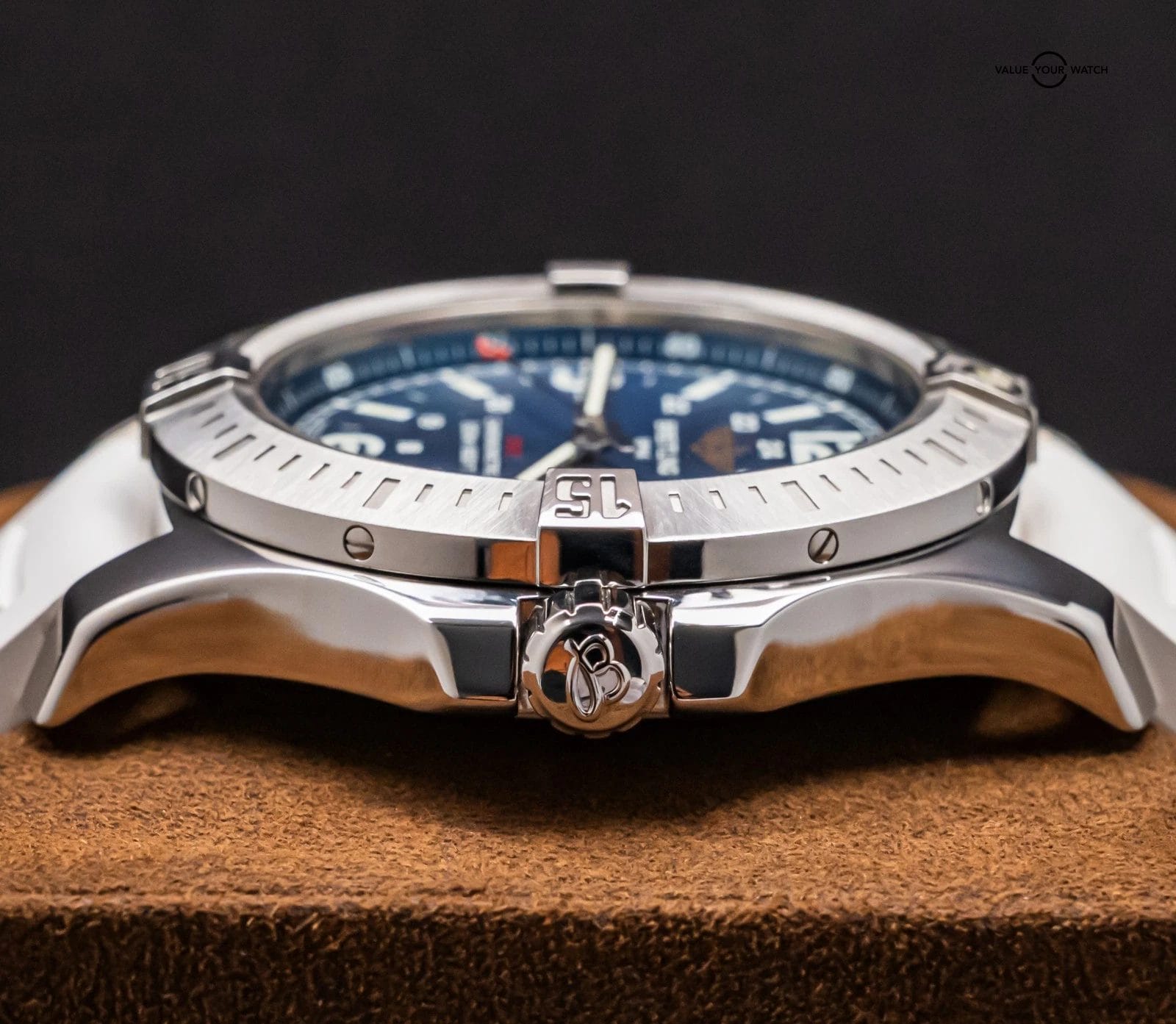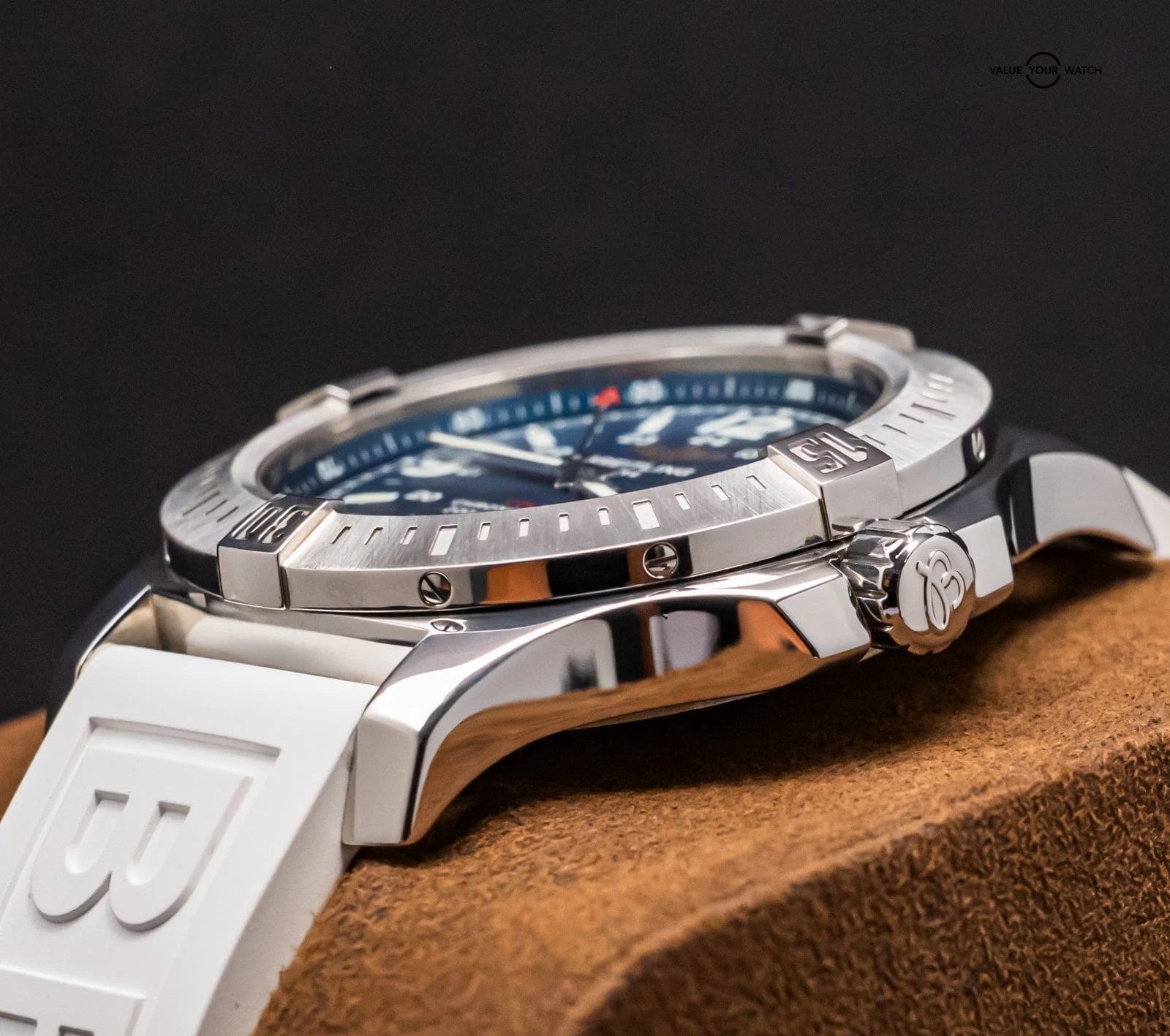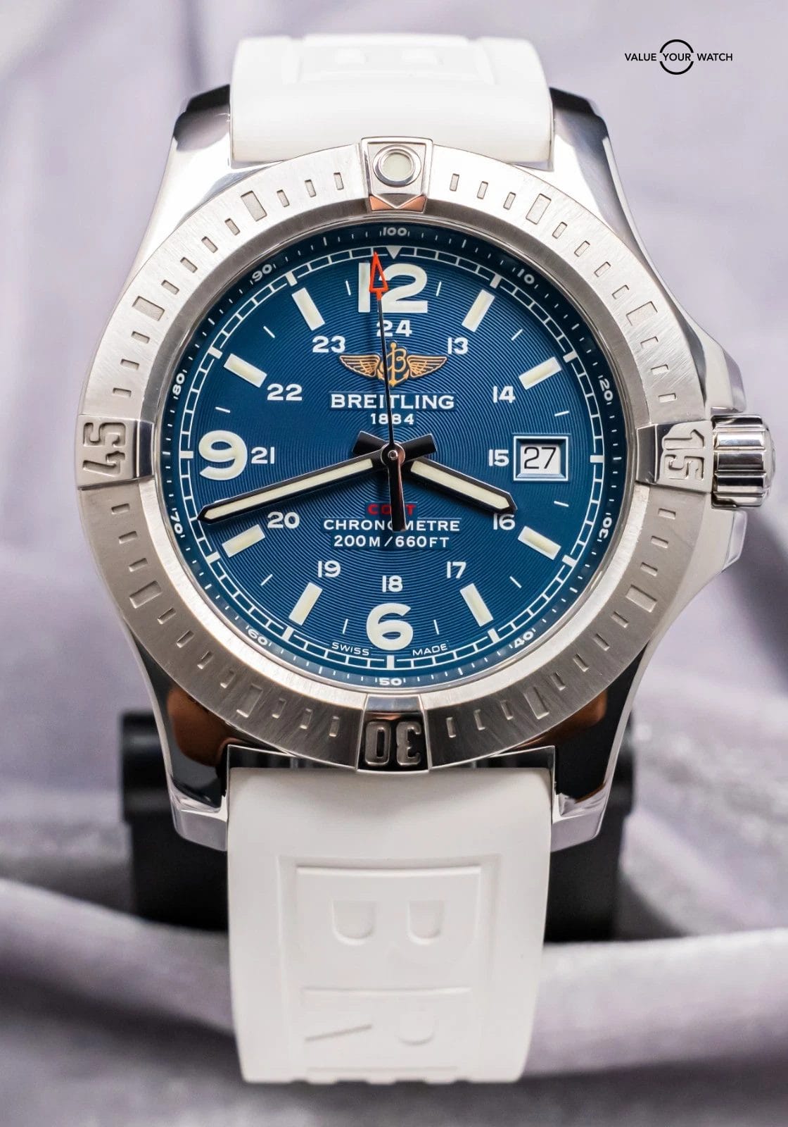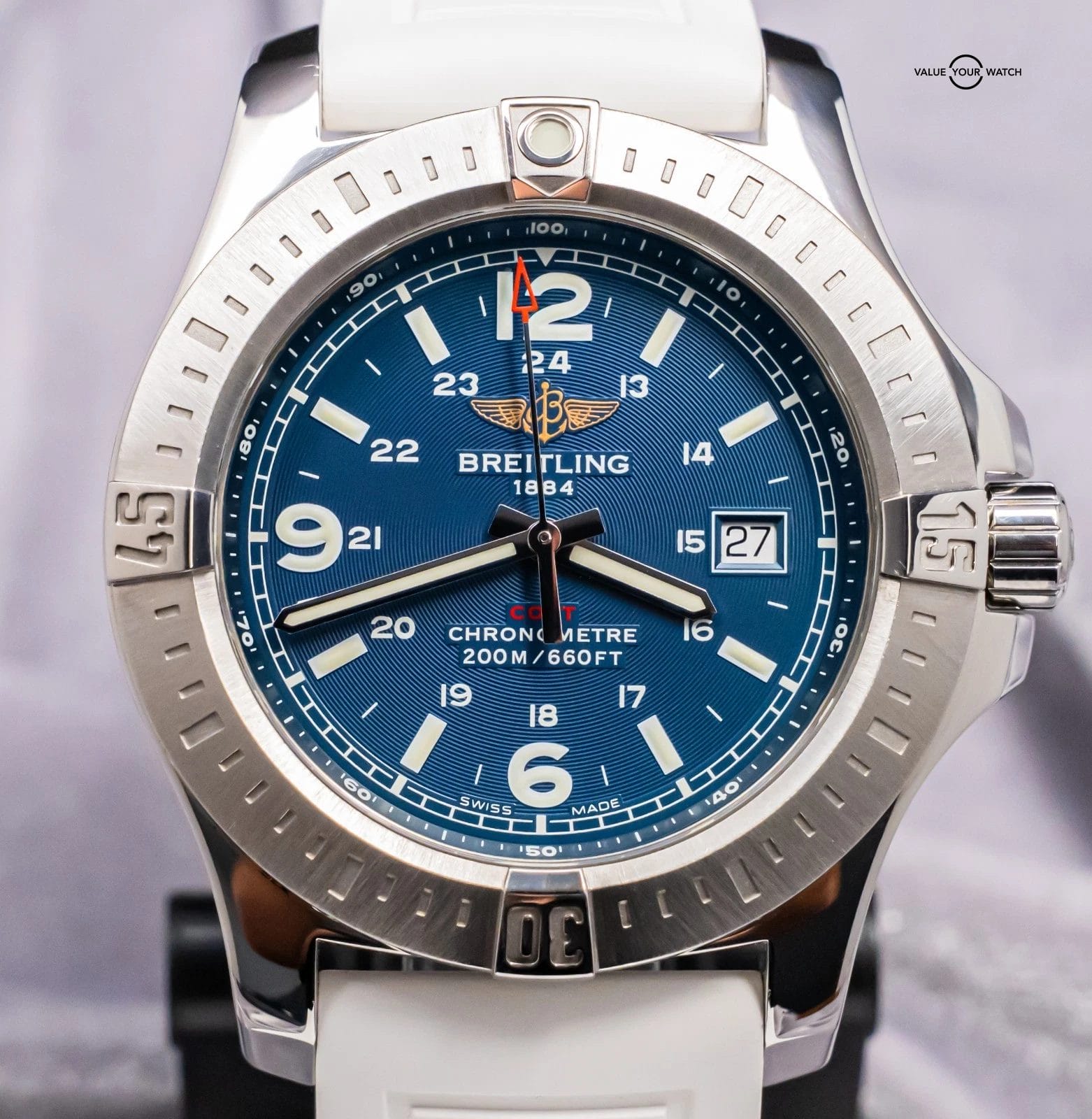 STUNNING Breitling Colt Quartz 44 mm with Blue Dial on BRAND NEW UNWORN White Breitling Rubber! Arrives as watch only and is at an unbeatable price point- large value proposition with the Colt Quartz 44! These are preferred over newer models due to these having the iconic Breitling “wings” logo on the dial!