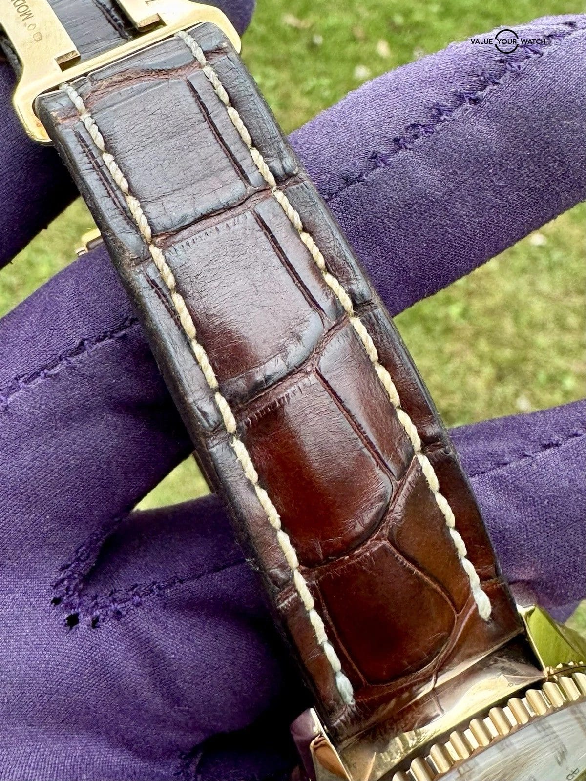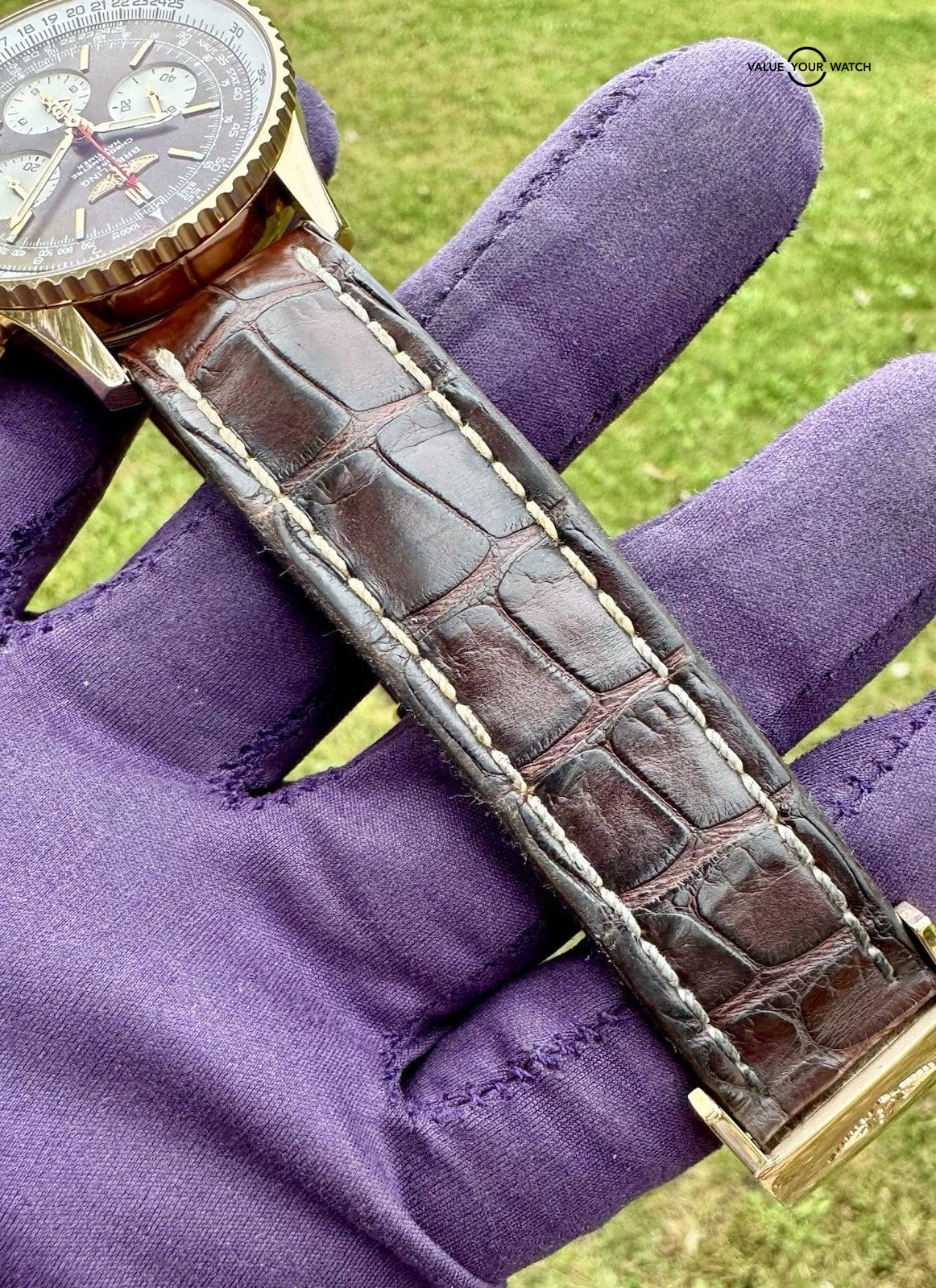 Navitimer 01 chronograph with an 18k rose gold case and a “Panamerican” bronze dial. It features Breitlingβs in-house Caliber 01 automatic movement