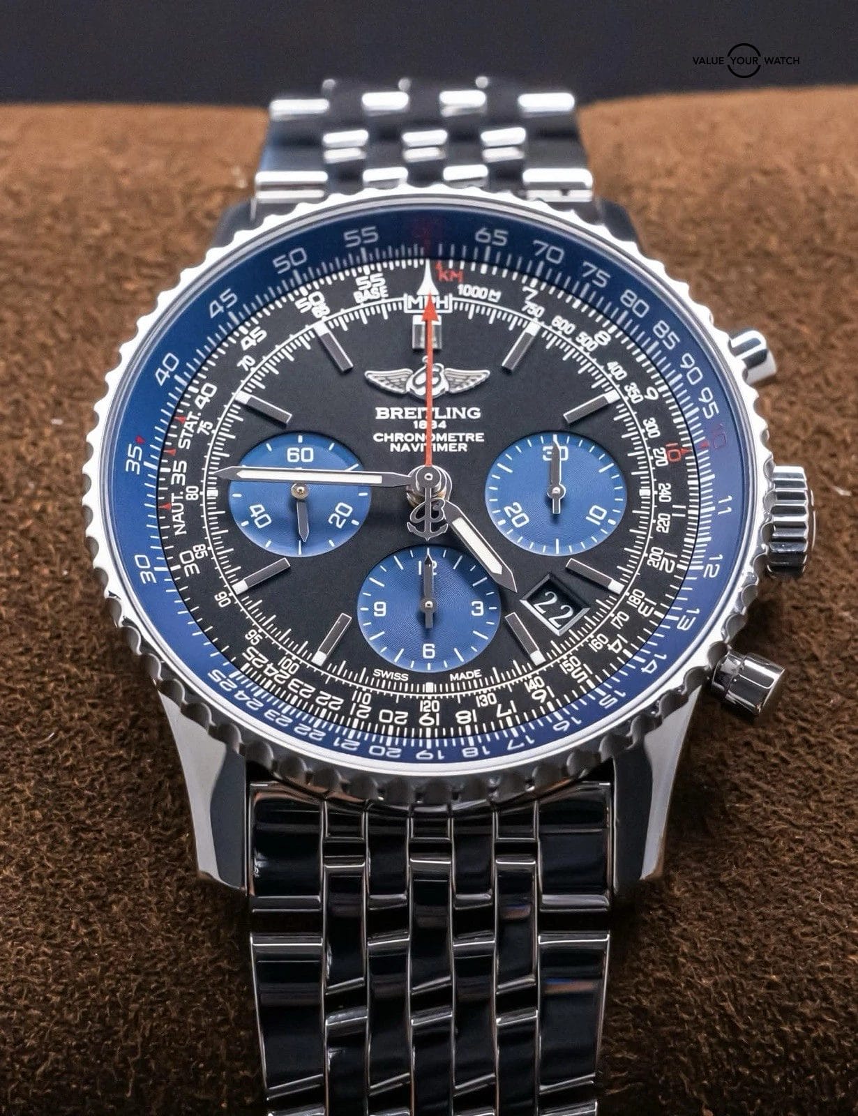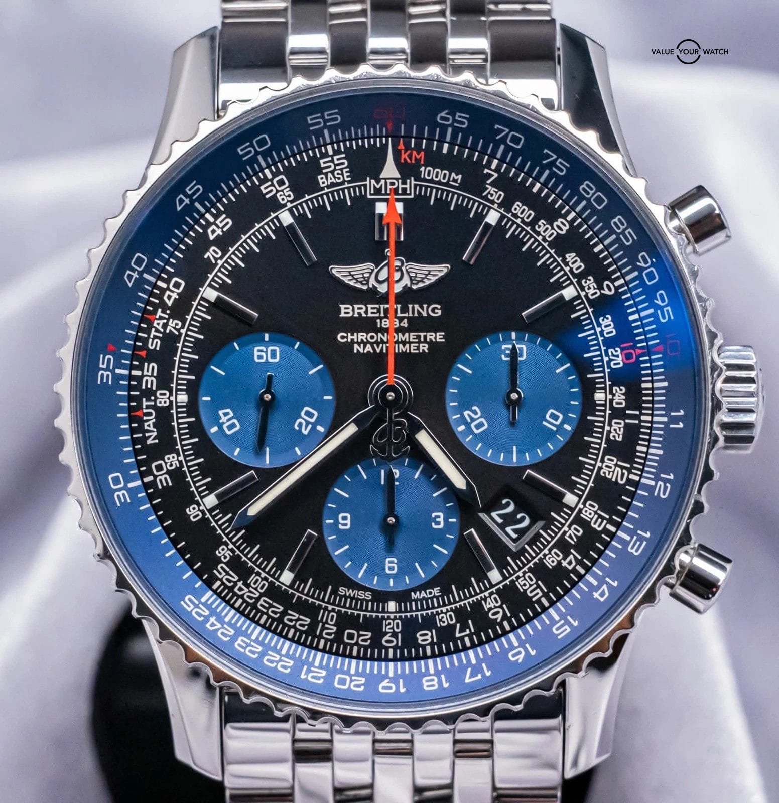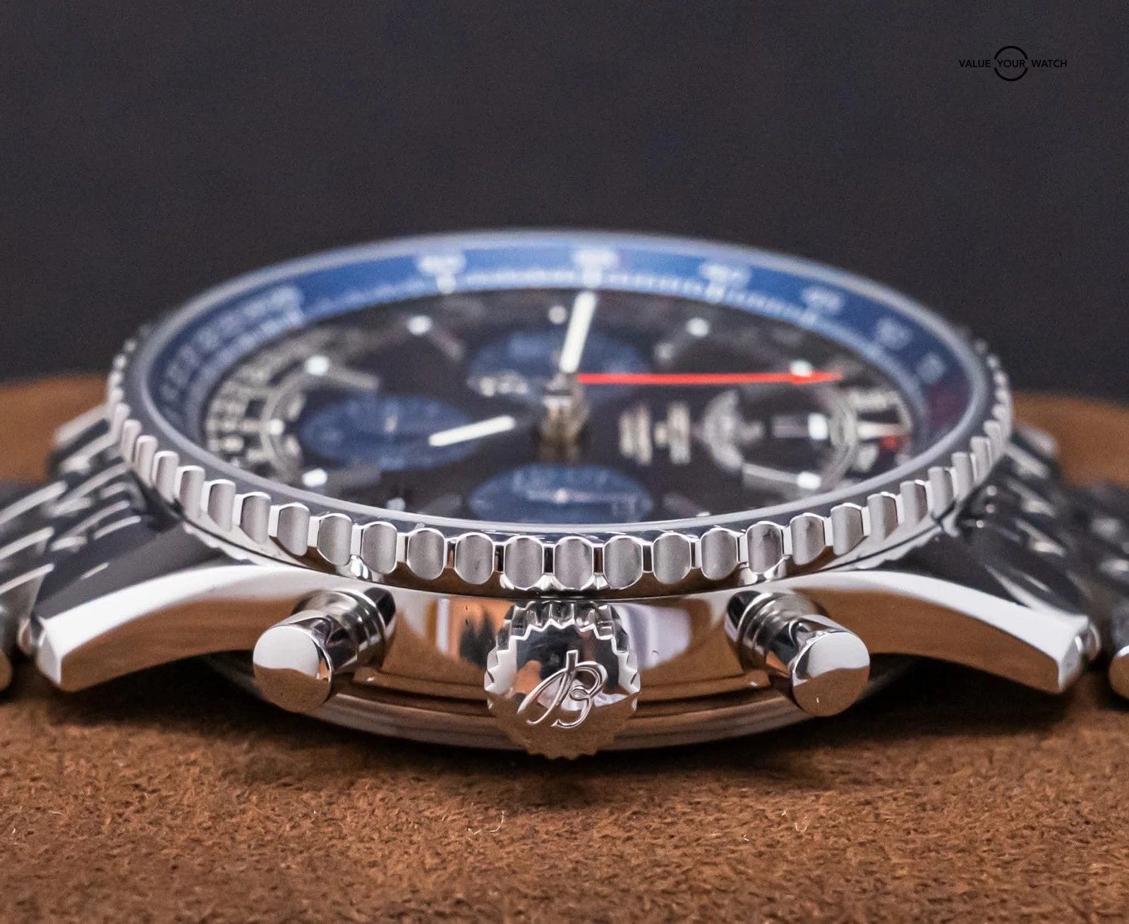 STUNNING Navitimer 01 Blue Edition Limited Edition of 1000 in 43 mm with the In-House B01 Movement, “Blue Eye” Black Dial & Blue Subdials on Breitling Steel Bracelet! To say this is an INCREDIBLY RARE Dial, would be an understatement; in the seven years I’ve specialized in selling pre-owned Breitling, I have only had two others, and there’s never more than 2-3 for sale globally at any given time. Due to their desirability and rare occasion that they come up for sale, I‘ve simply never been able to purchase one at a competitive enough price that I could continue to pass along to my clients, until now. Comes complete with the original Breitling boxes and papers including the electronic warranty card, serialized COSC certificate, limited edition certificate, maintenance booklet, slide rule instructions, and manual. Originally purchased from a Breitling Authorized Dealer in December 2016. Very classic Breitling, timeless and sure to be a future classic with the In-House B01 Movement!