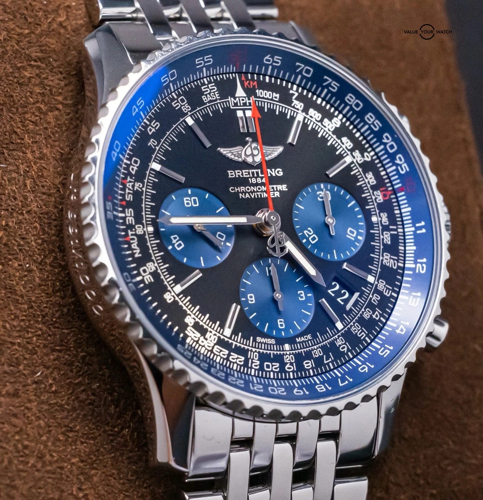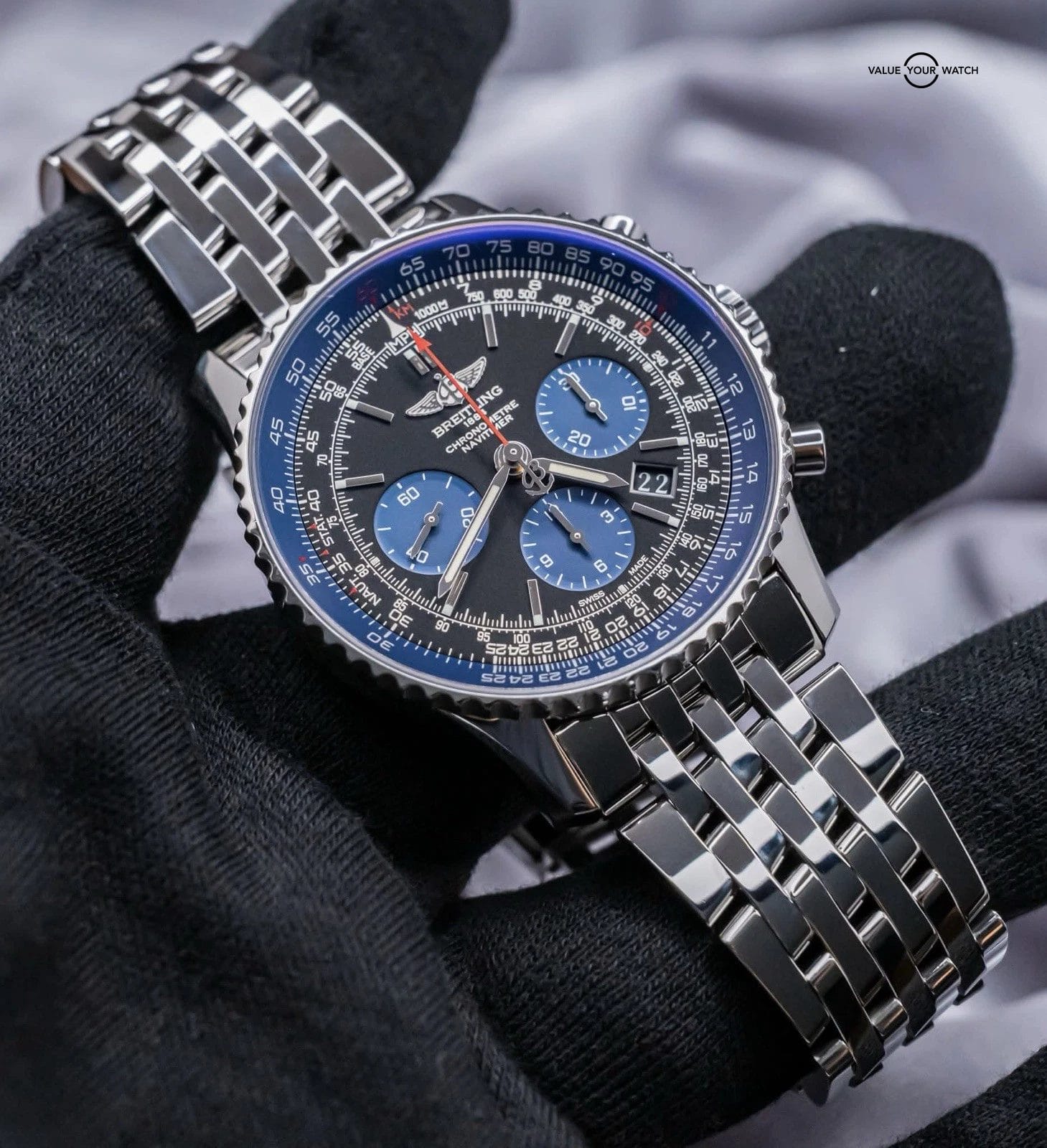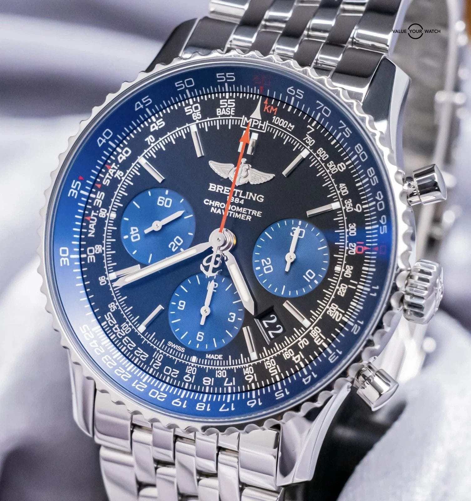 STUNNING Navitimer 01 Blue Edition Limited Edition of 1000 in 43 mm with the In-House B01 Movement, “Blue Eye” Black Dial & Blue Subdials on Breitling Steel Bracelet! To say this is an INCREDIBLY RARE Dial, would be an understatement; in the seven years I’ve specialized in selling pre-owned Breitling, I have only had two others, and there’s never more than 2-3 for sale globally at any given time. Due to their desirability and rare occasion that they come up for sale, I‘ve simply never been able to purchase one at a competitive enough price that I could continue to pass along to my clients, until now. Comes complete with the original Breitling boxes and papers including the electronic warranty card, serialized COSC certificate, limited edition certificate, maintenance booklet, slide rule instructions, and manual. Originally purchased from a Breitling Authorized Dealer in December 2016. Very classic Breitling, timeless and sure to be a future classic with the In-House B01 Movement!
