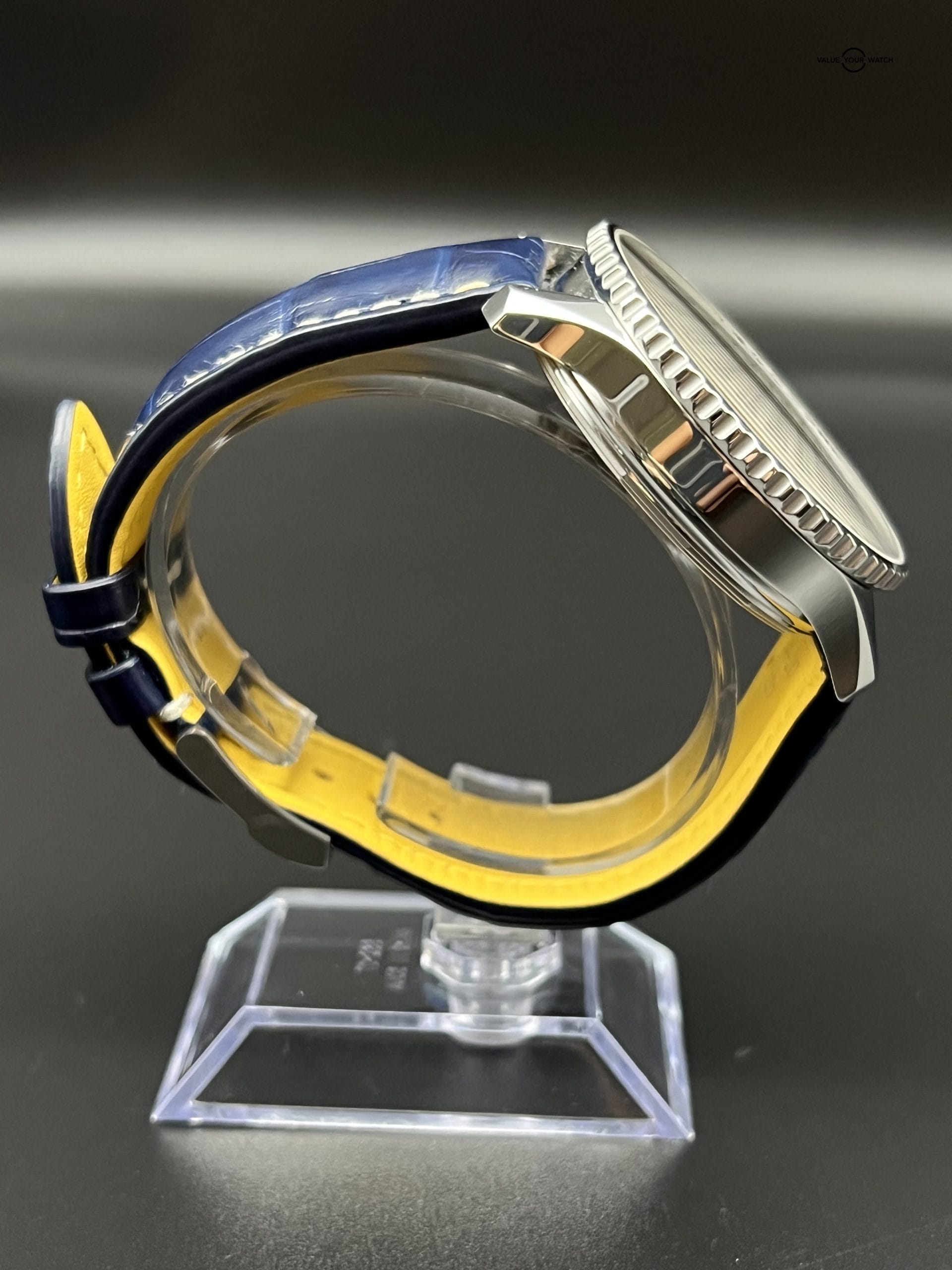 Available in the desirable wrist presence of 46mm, this piece was purchased brand new from the boutique in 2021 with a 5-year warranty that covers you all the way through 10/8/2026. Self-winding automatic movement with an exhibition caseback to enjoy it. The blue dial becomes even more compelling when accompanied by the blue crocodile strap. Strap is in great condition – worn on dinner occasions only.