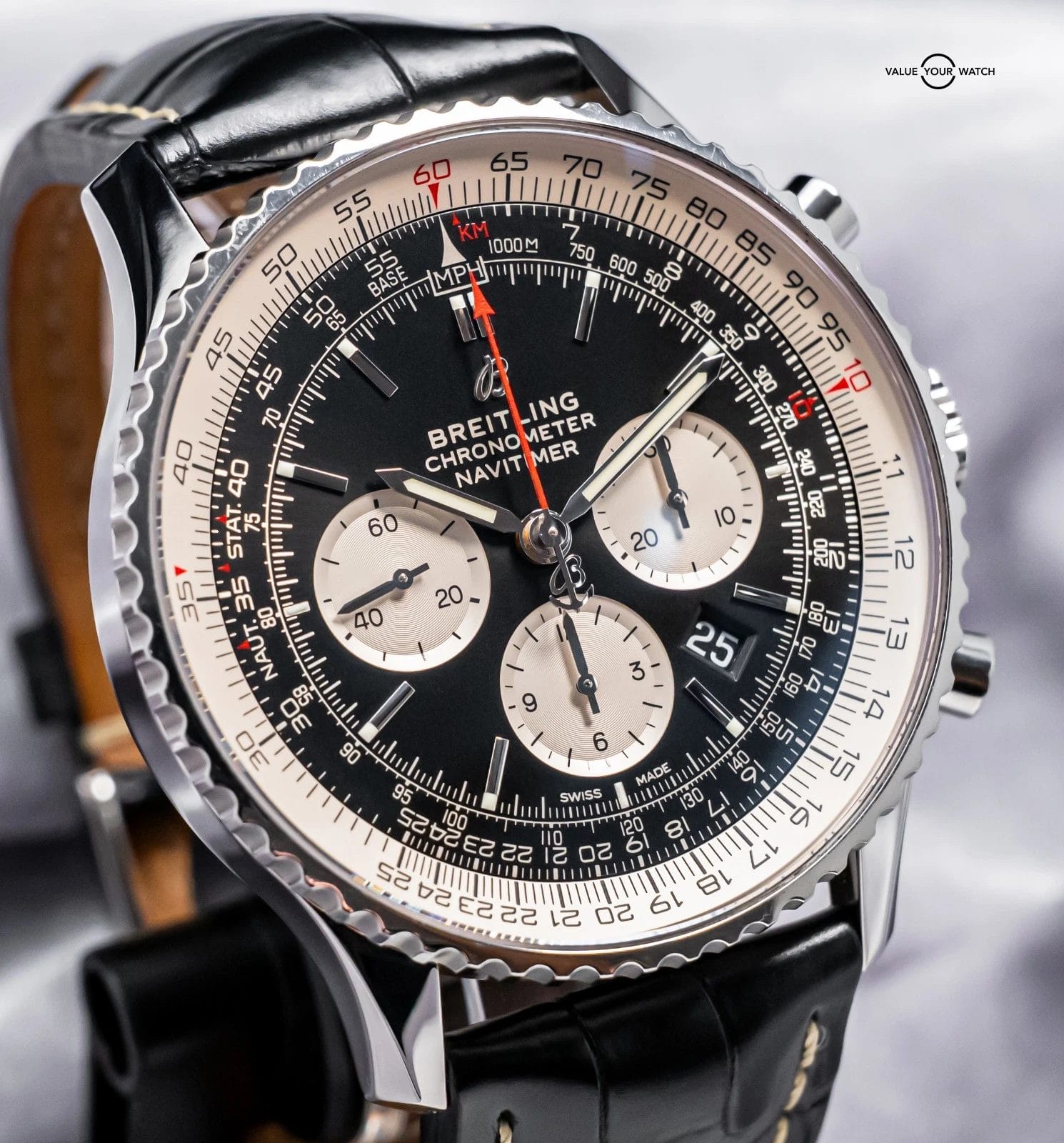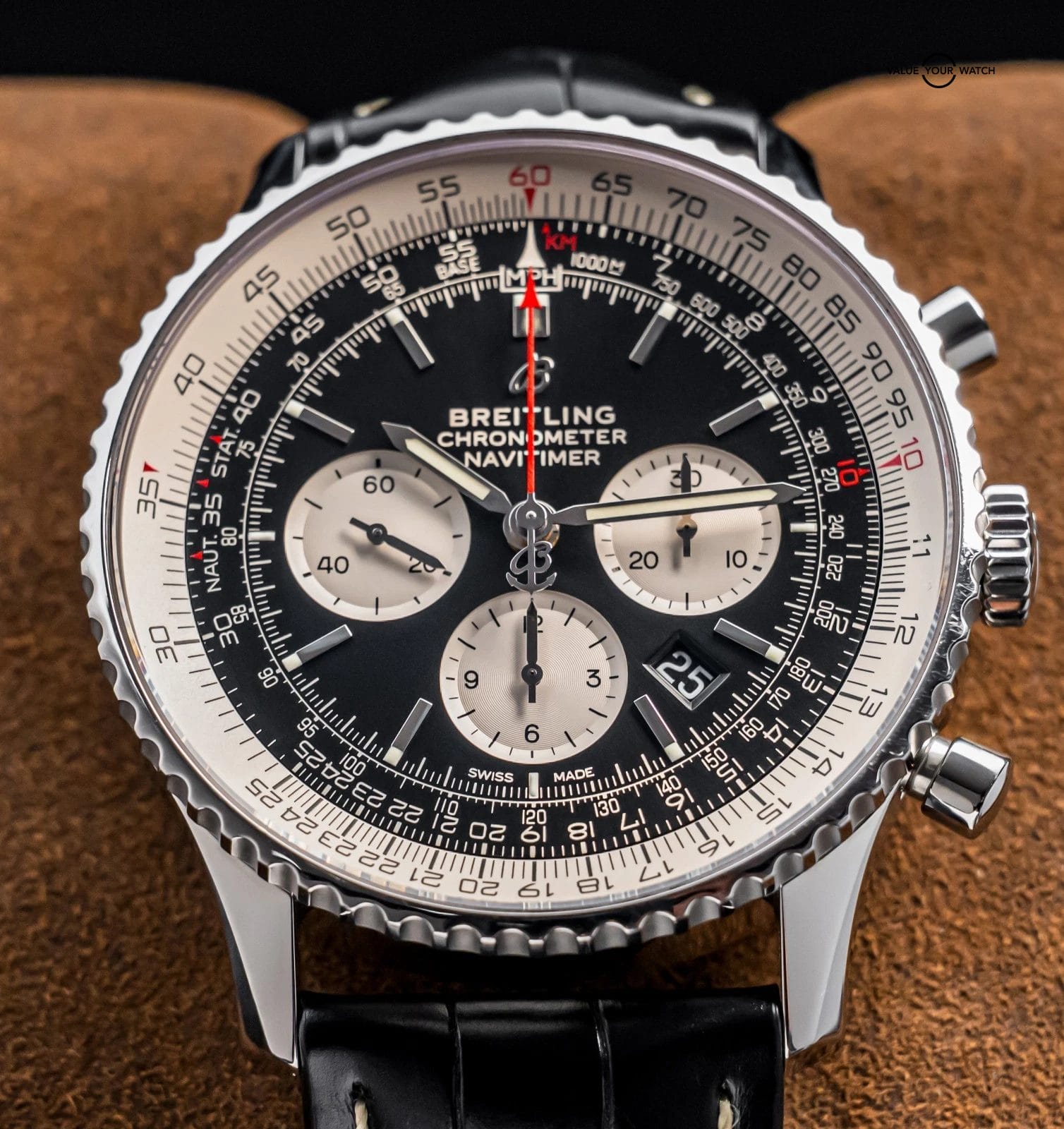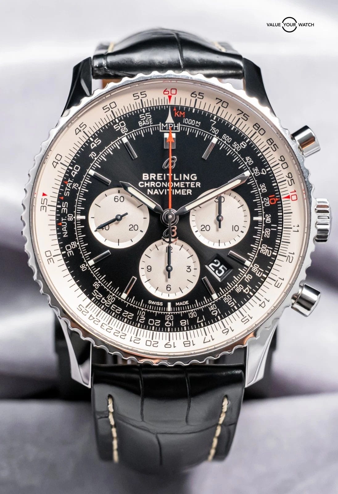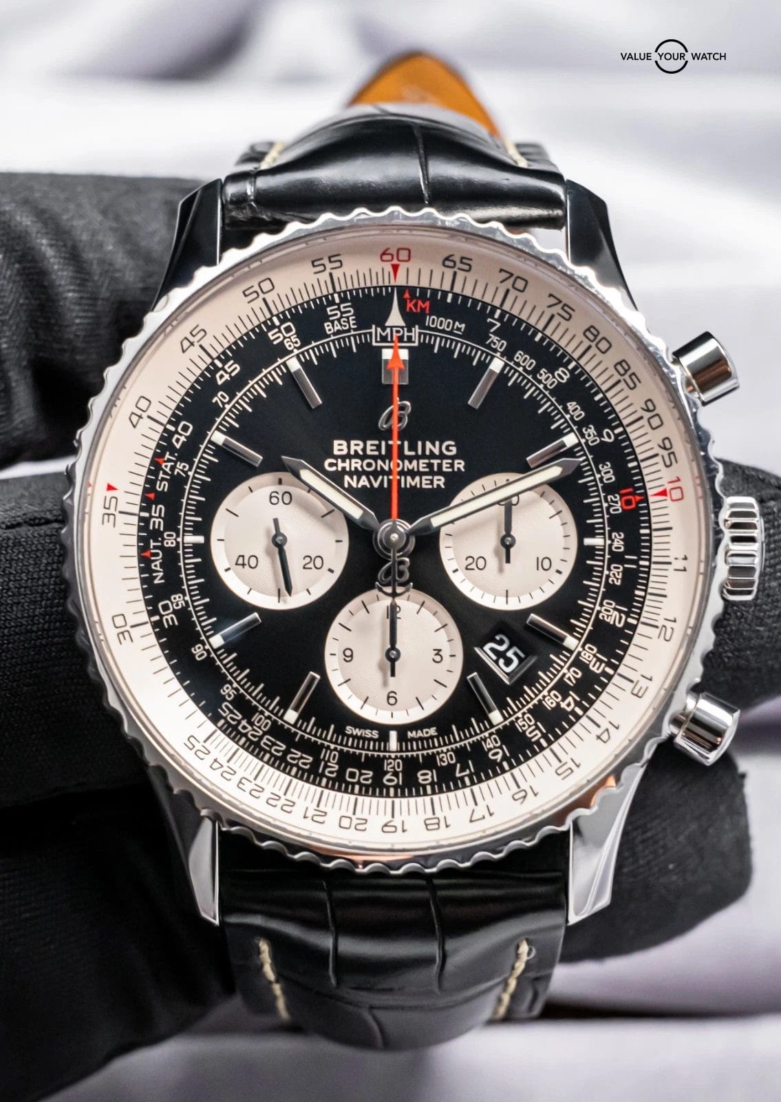 STUNNING Breitling Navitimer B01 Chronograph 46 mm with the In-House B01 Movement and Black Dial & Silver Subdials on Black Breitling Croco! Arrives as a complete set with the original Breitling boxes and papers including the international warranty card from the original July 2022 purchase at a Breitling Authorized Dealer. Ready to be on wrist!