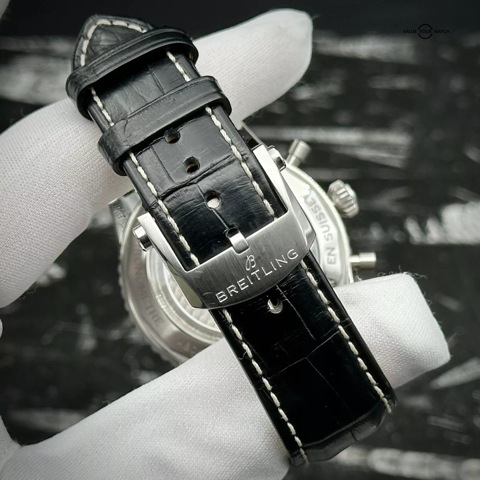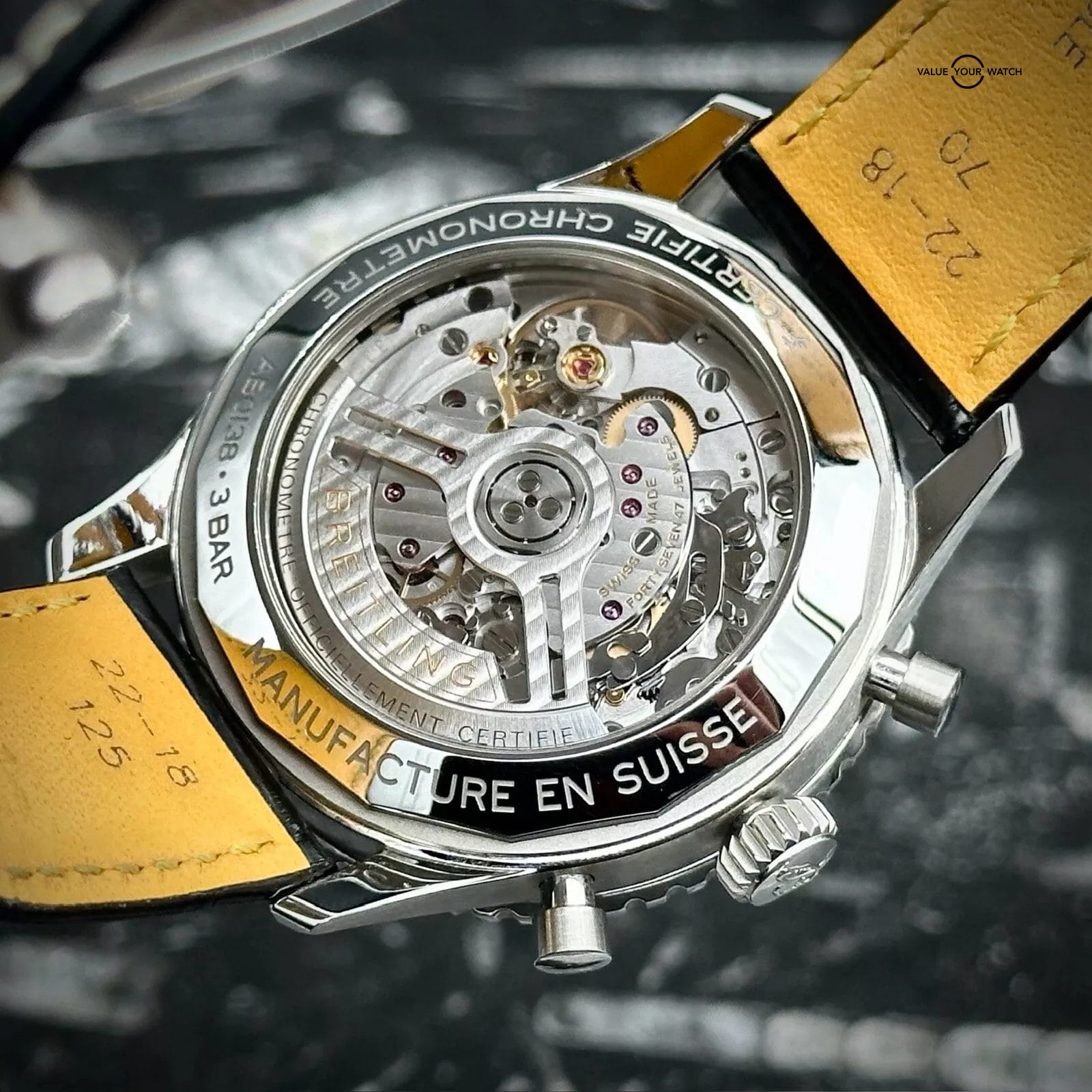 This striking mint green dial Navitimer beautifully combines class and incredible utility. With a chronograph, slide rule calculator, tachometer, date, and open caseback to display that beautiful movement, this makes for one hell of a tool watch in a beautiful package! At 43 millimeters it maintains a presence while still fitting nicely under a shirt cuff.