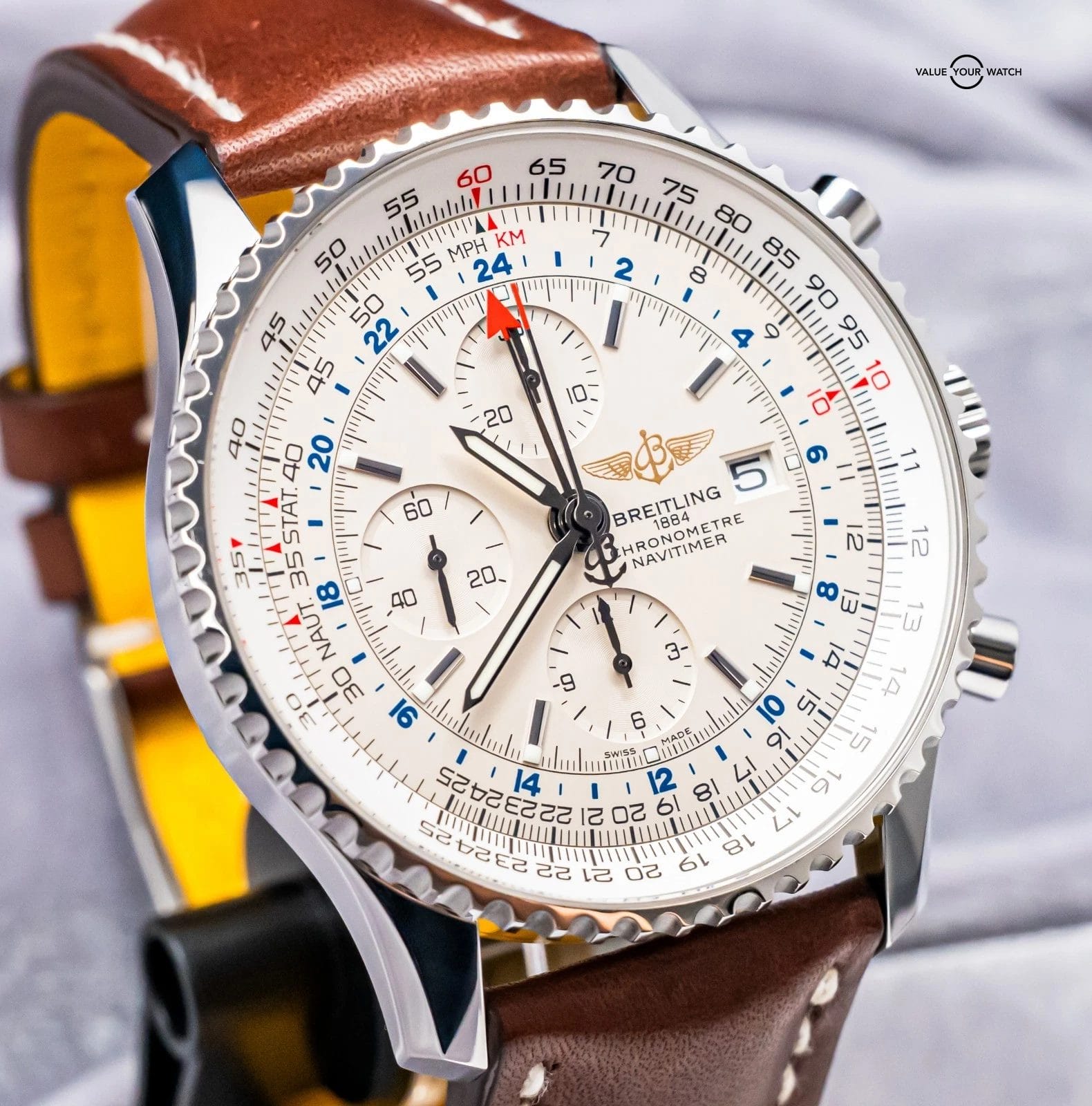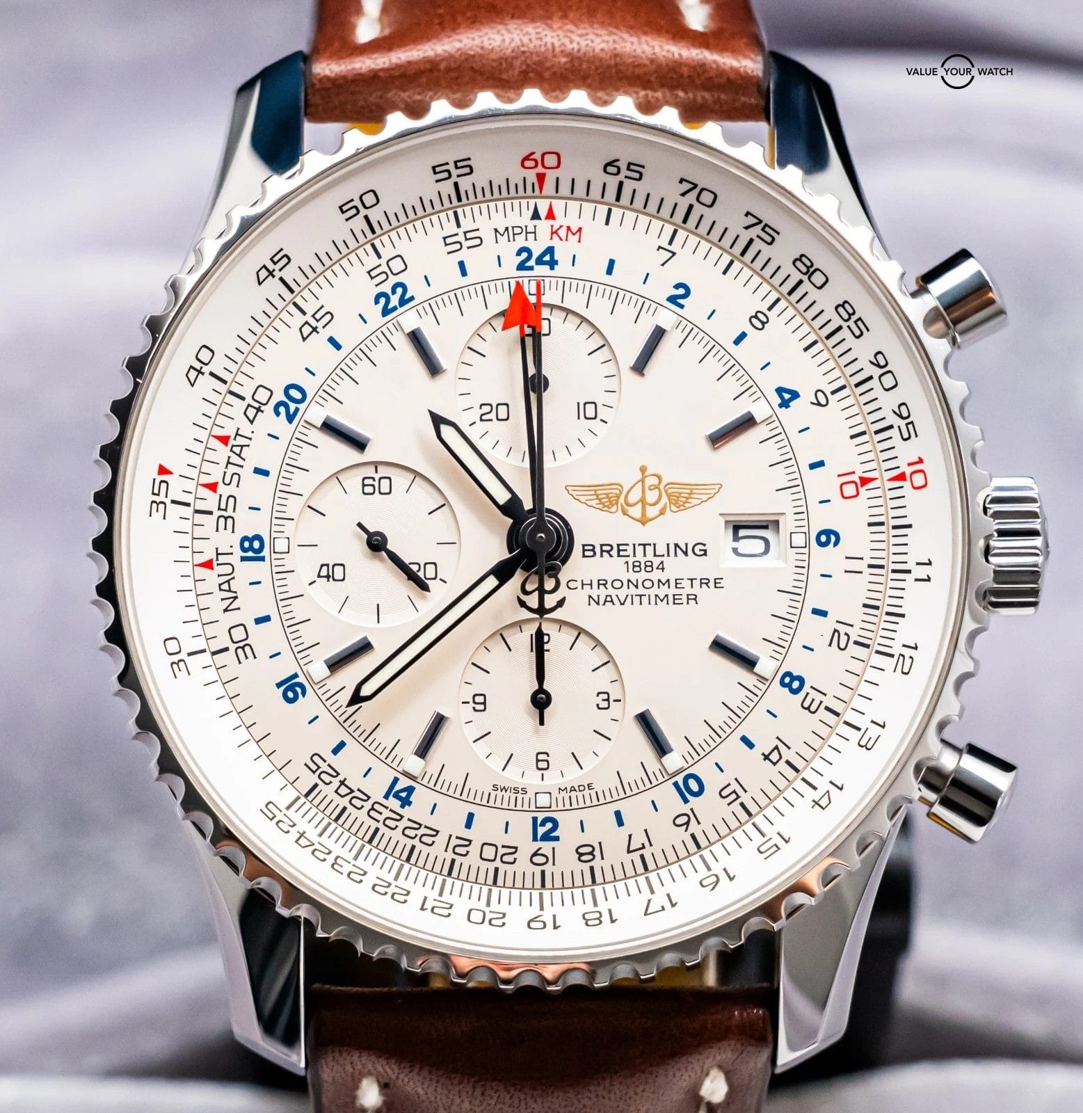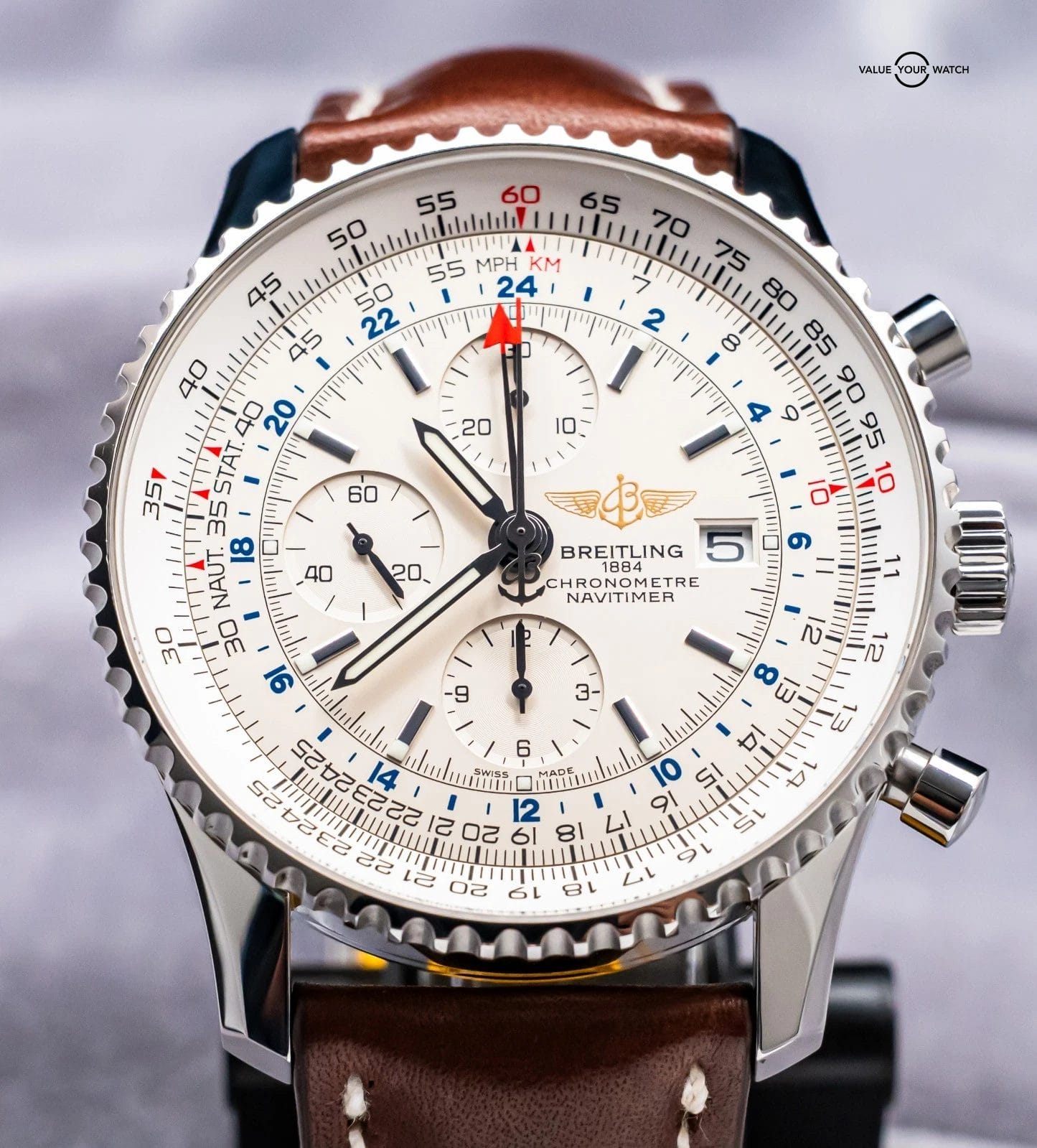 STUNNING Breitling Navitimer World GMT 46 mm with Silver Dial on BRAND NEW UNWORN Brown Breitling Leather! Arrives as watch only and is one of my top recommendations for a Breitling, and I find the World to be the most iconic Navitimer ever made, being Breitling’s most popular model between its inception in 2005 and discontinuation in 2022. The Silver Dial and Brown Leather is a classy look with the iconic discontinued “Winged-B” Logo!