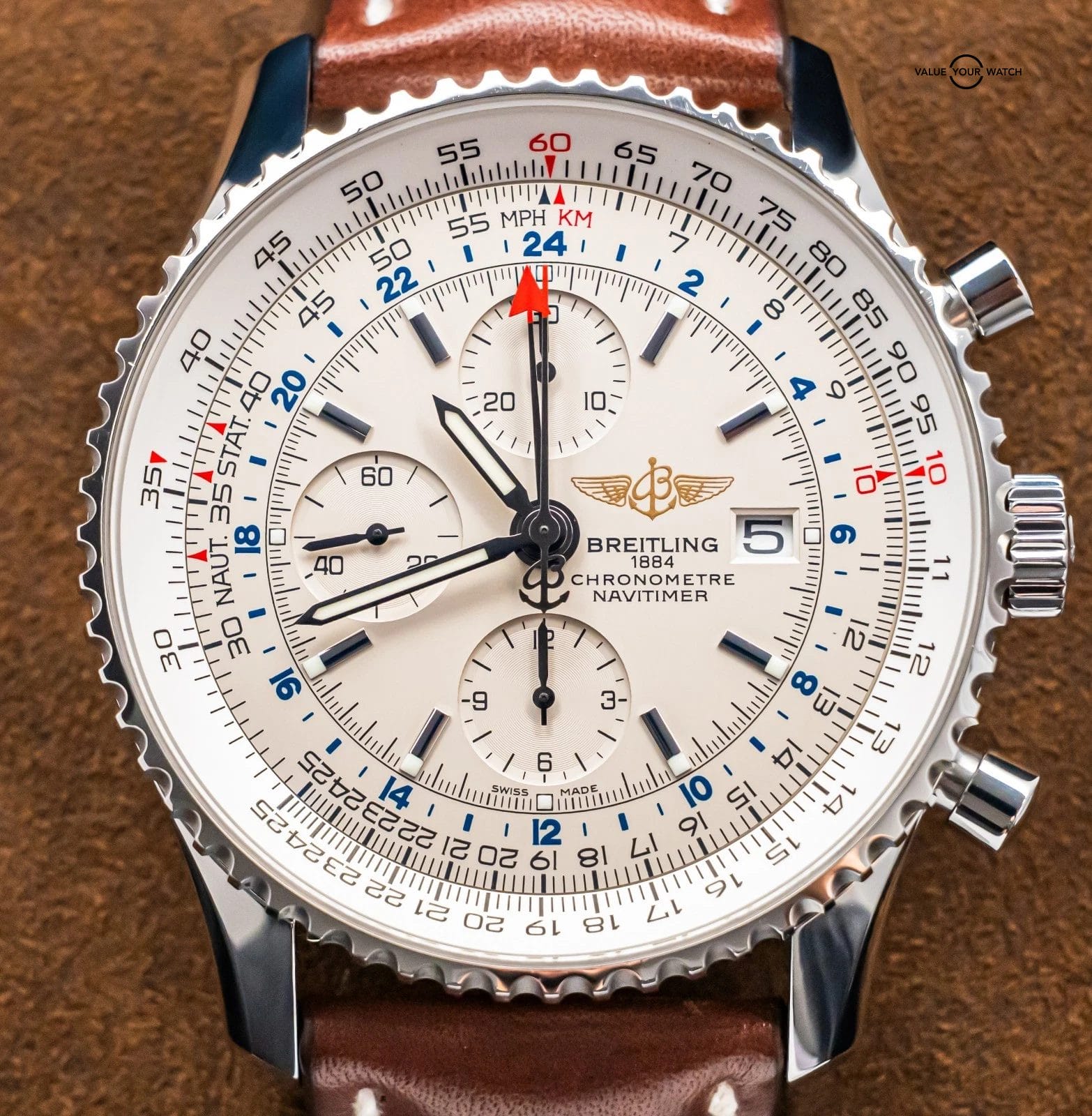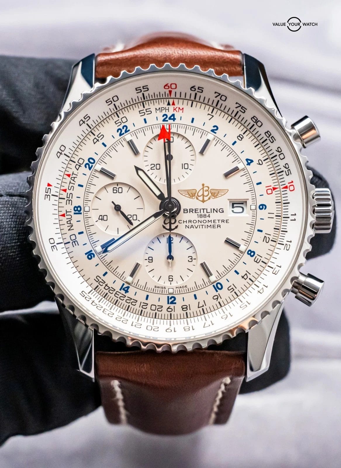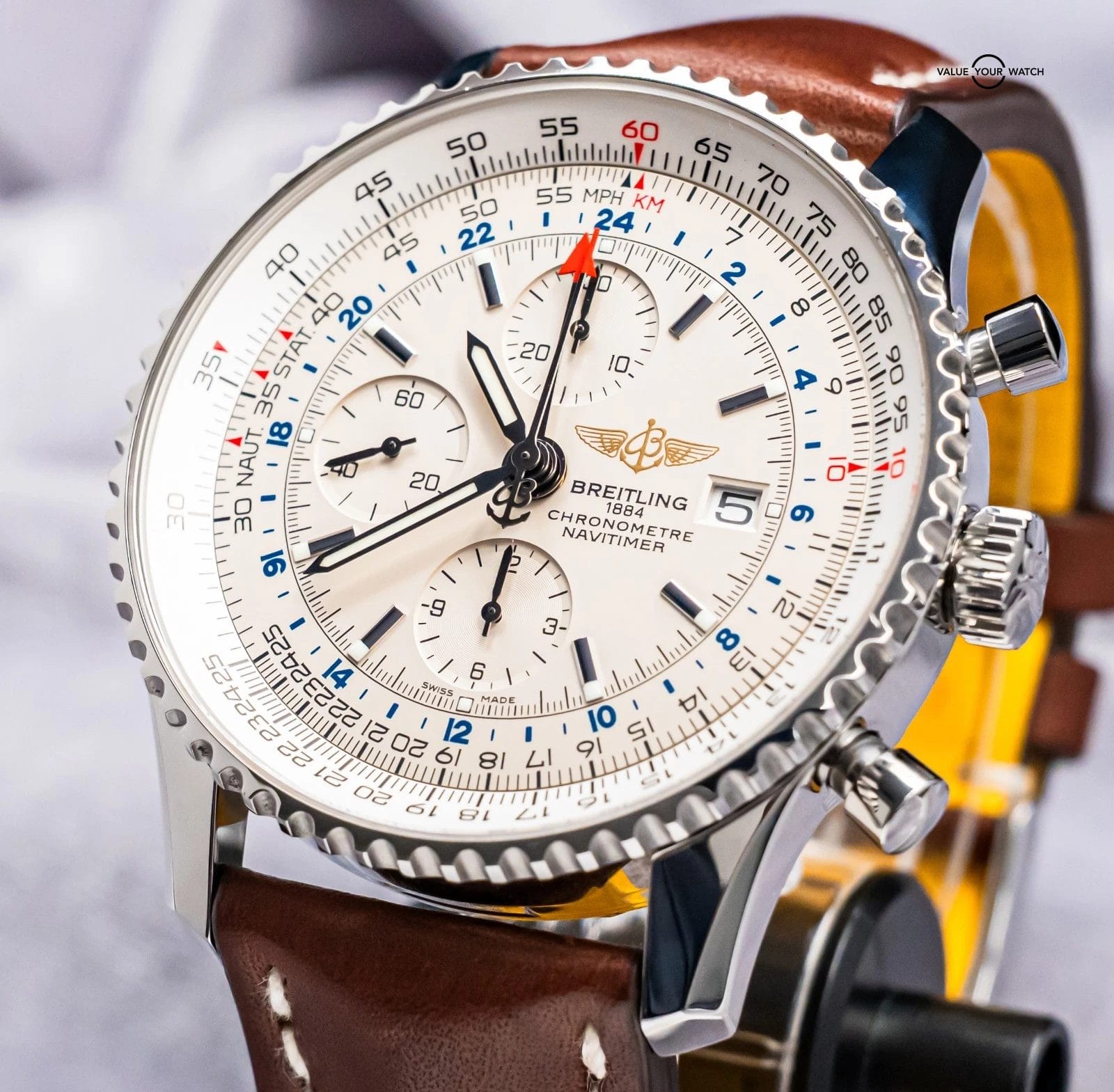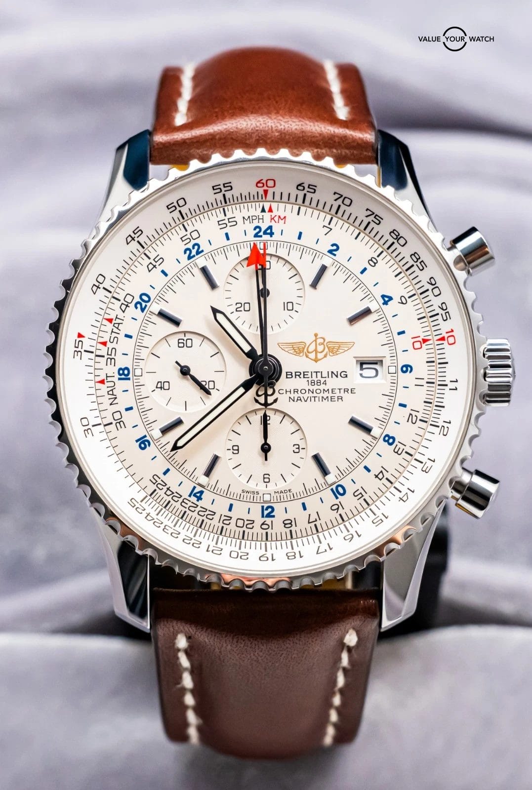 STUNNING Breitling Navitimer World GMT 46 mm with Silver Dial on BRAND NEW UNWORN Brown Breitling Leather! Arrives as watch only and is one of my top recommendations for a Breitling, and I find the World to be the most iconic Navitimer ever made, being Breitling’s most popular model between its inception in 2005 and discontinuation in 2022. The Silver Dial and Brown Leather is a classy look with the iconic discontinued “Winged-B” Logo!
