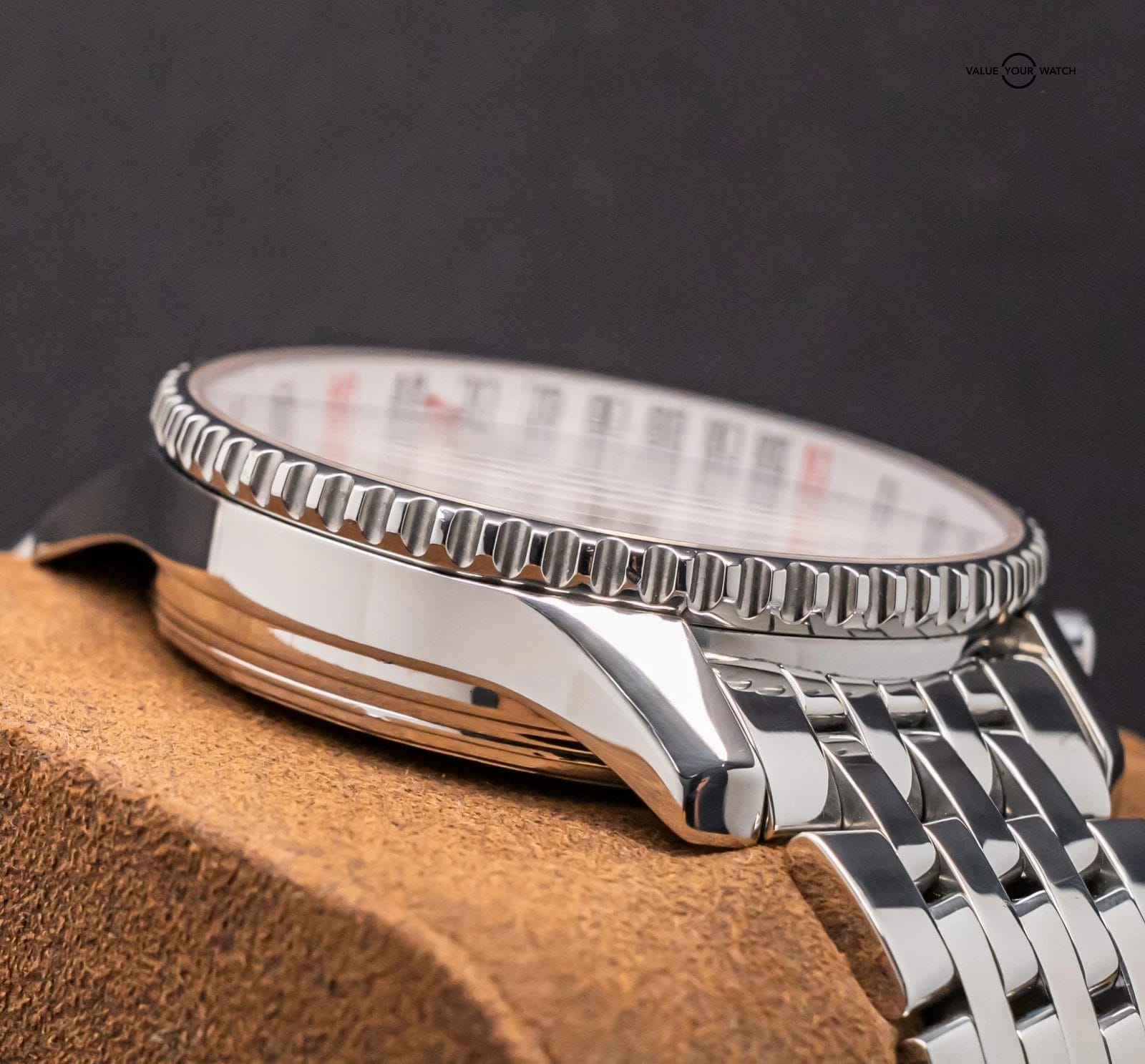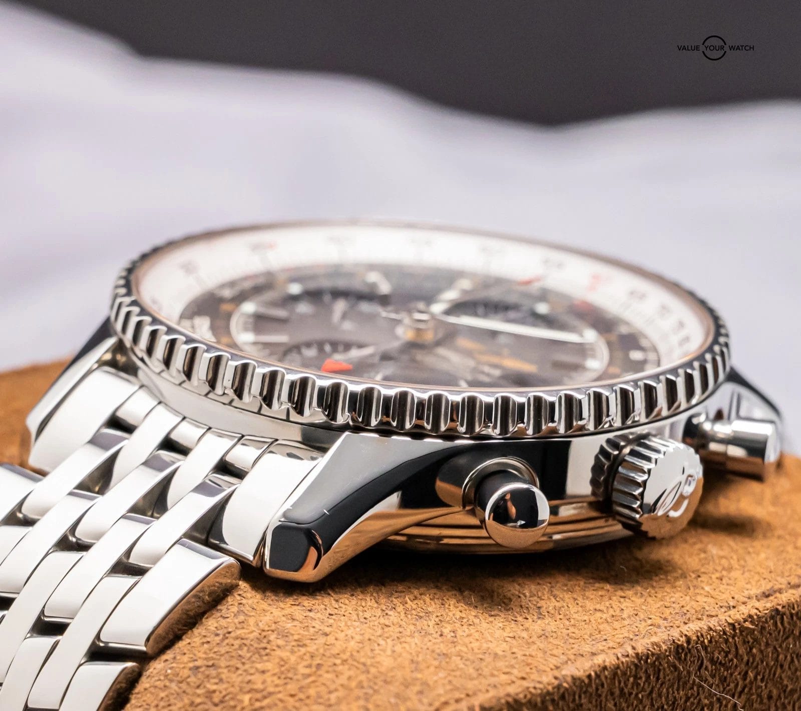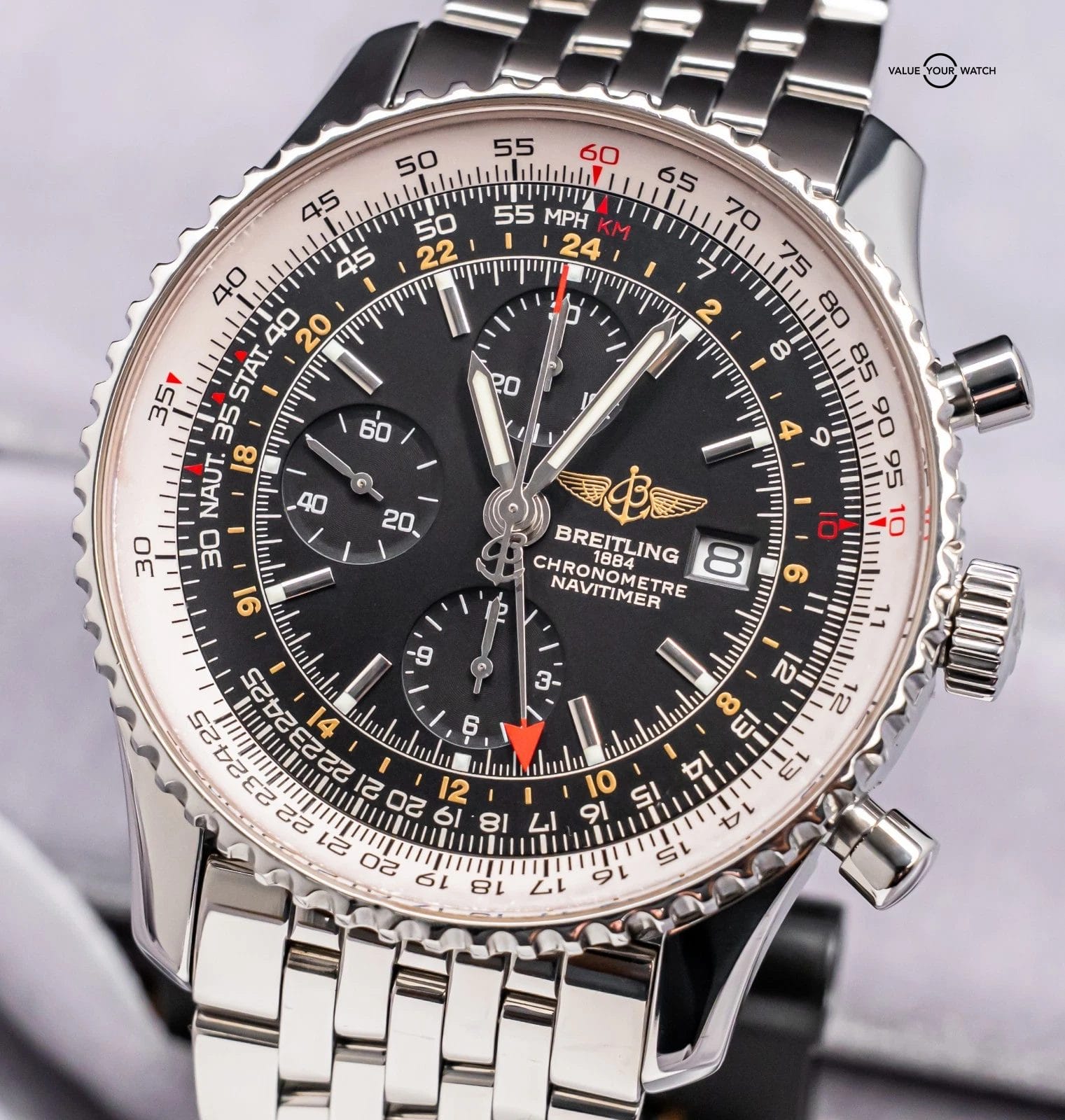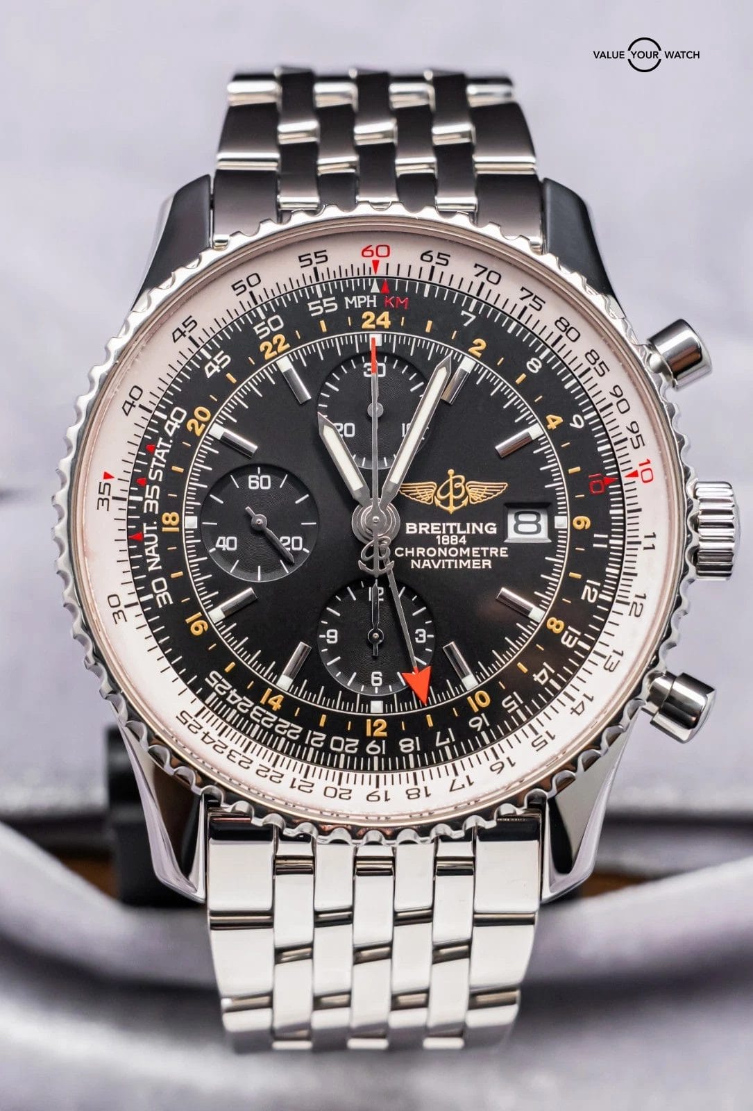 STRIKING Breitling Navitimer World GMT 46 mm with Black Dial on Polished Stainless Steel Navitimer Bracelet! Arrives as watch only and was SERVICED at my watchmaker in January 2026, a huge value-add. The black on steel looks fantastic, I always get compliments on these. So striking and desirable, iconic with the discontinued “Winged-B” Logo and is ready to be on wrist!