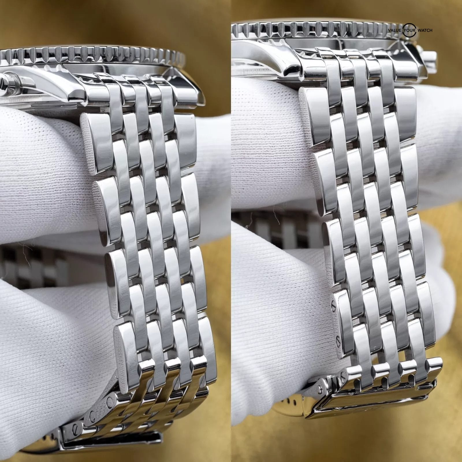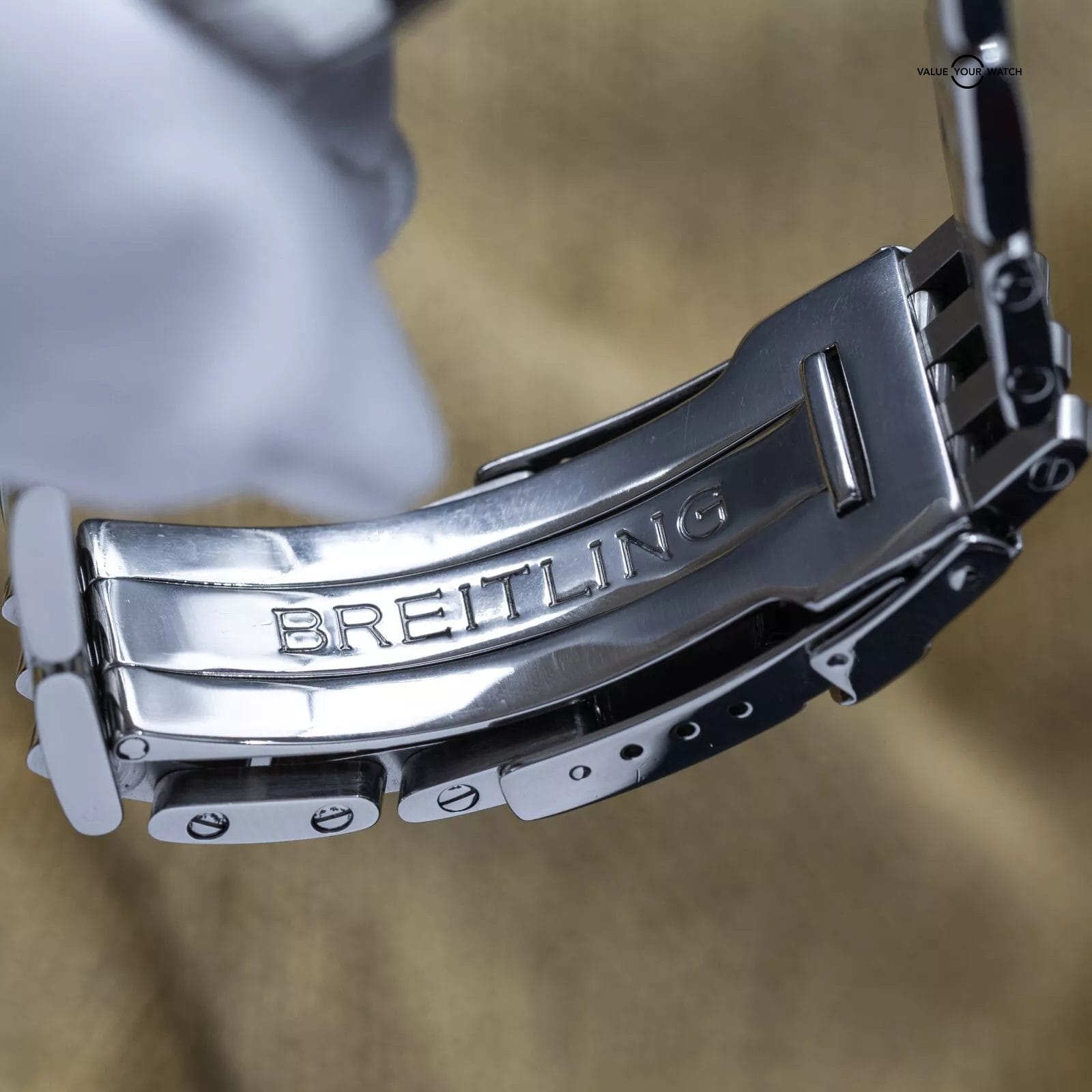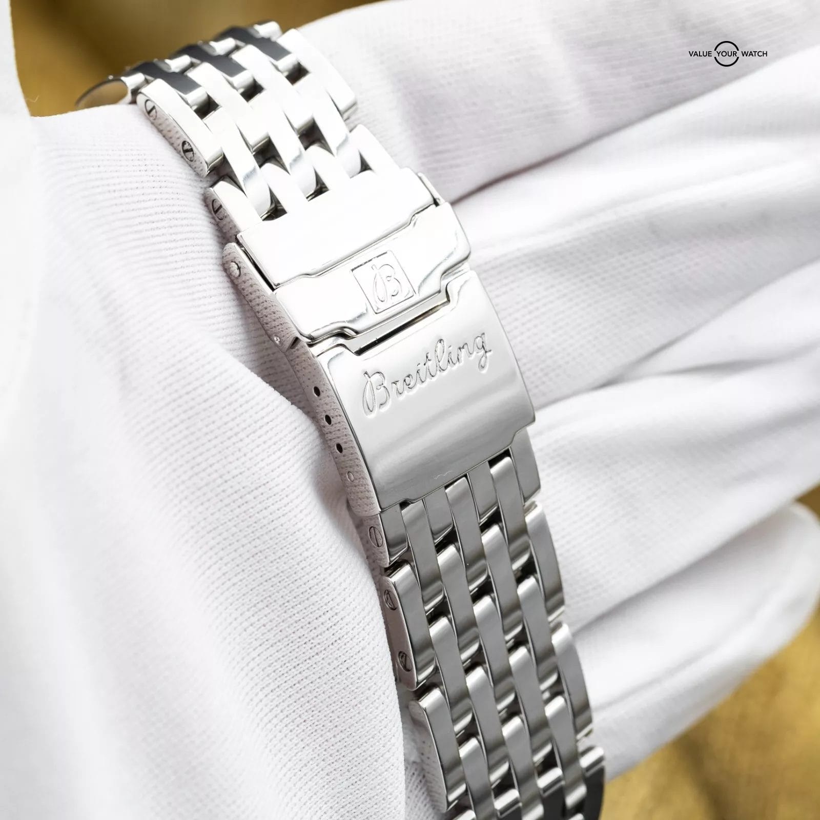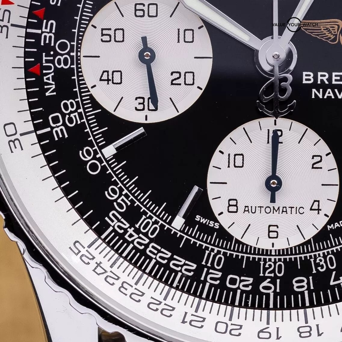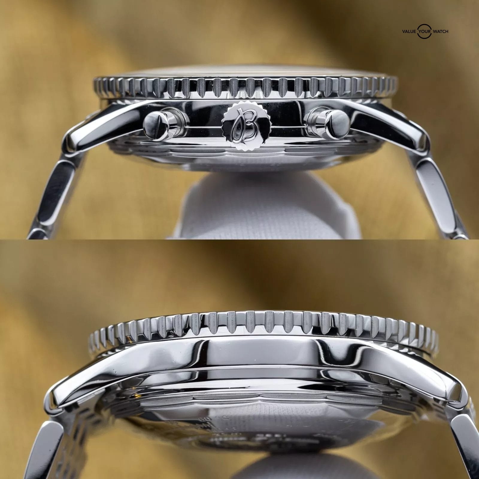 A timeless watch indeed! This is the 41mm version of the Navitimer chronograph with the sought after original layout. The dial in the highly desired black color…one of the best looking on the Navitimers for sure! Enjoy the famous Navitimer rotating slide rule bezel and that classic dial made so famous by these watches. So much to keep you interested on this one!