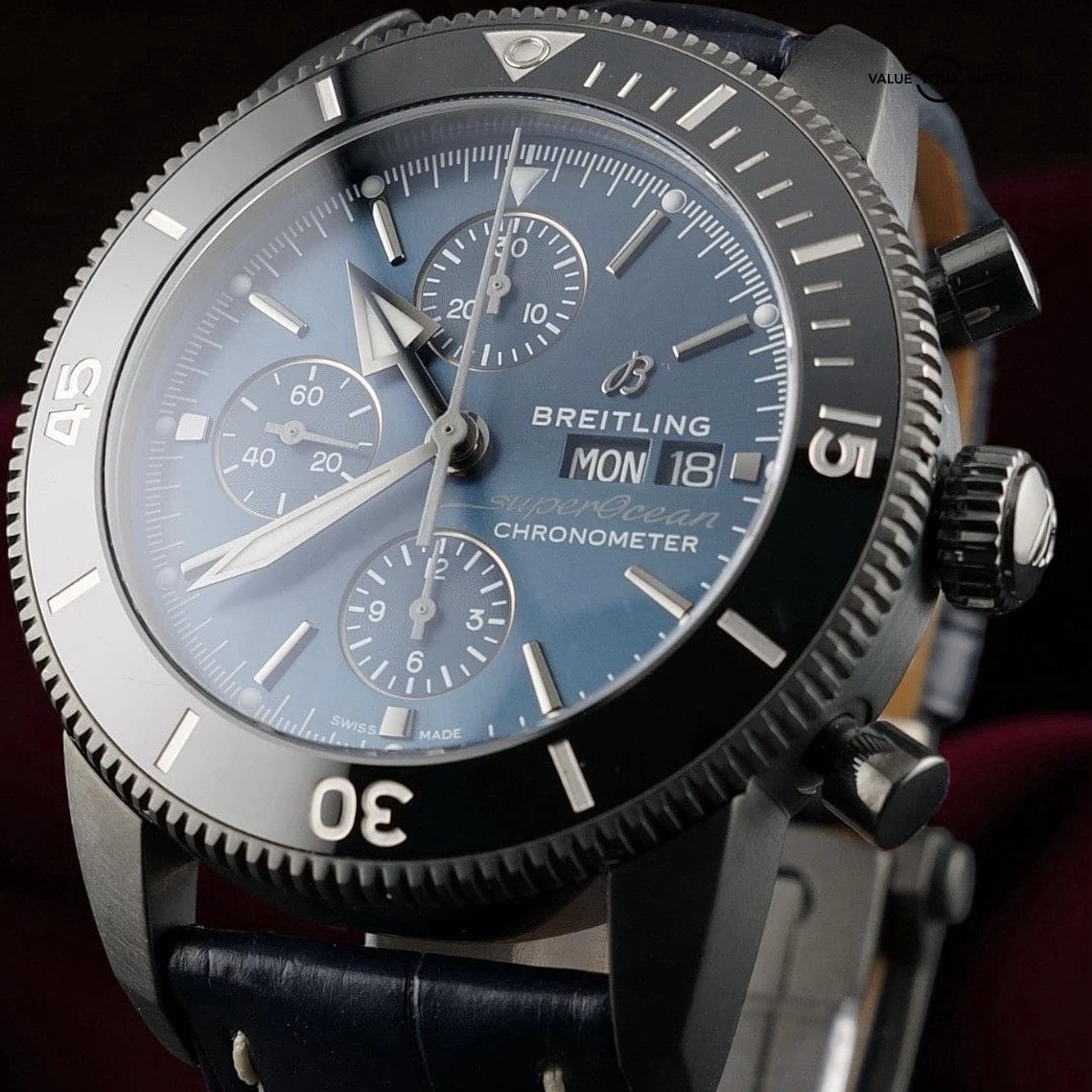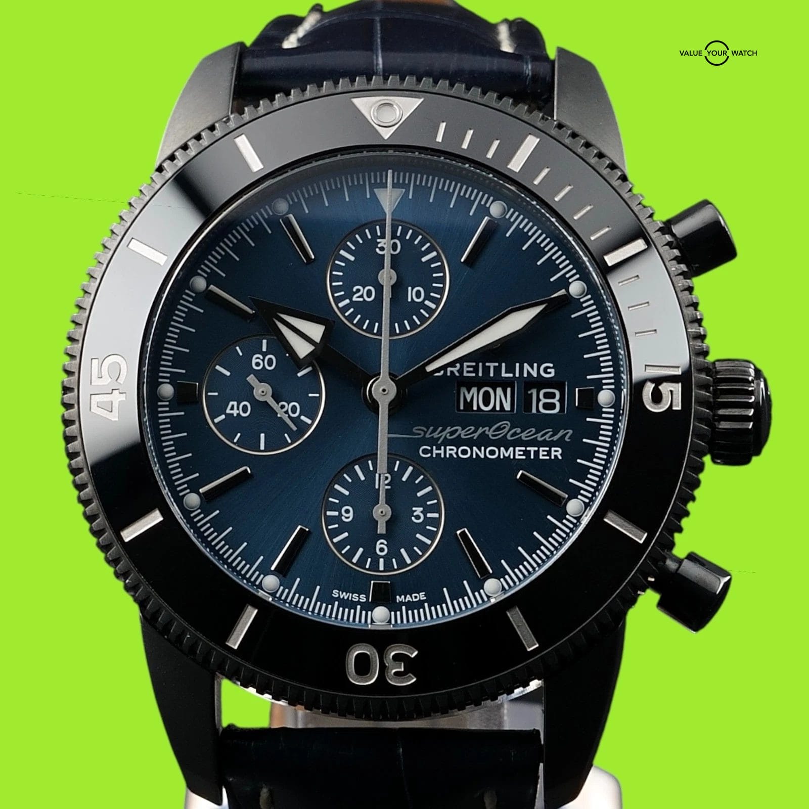 With the black coated case, blue dial, and limited production run tied to Kelly Slater’s surf brand, this reference has become a recognizable chapter in the Superocean Heritage line. It wears like a modern tool chronograph yet still carries the vintage inspired bezel and markers that made the Heritage series a hit with collectors.