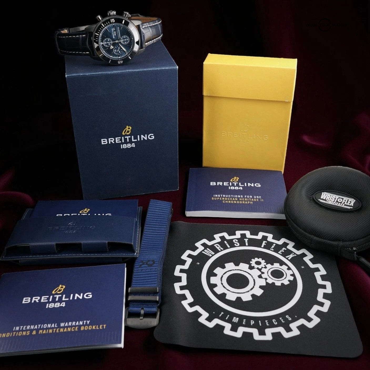 Breitling inner box, outer box, and yellow branded sleeve