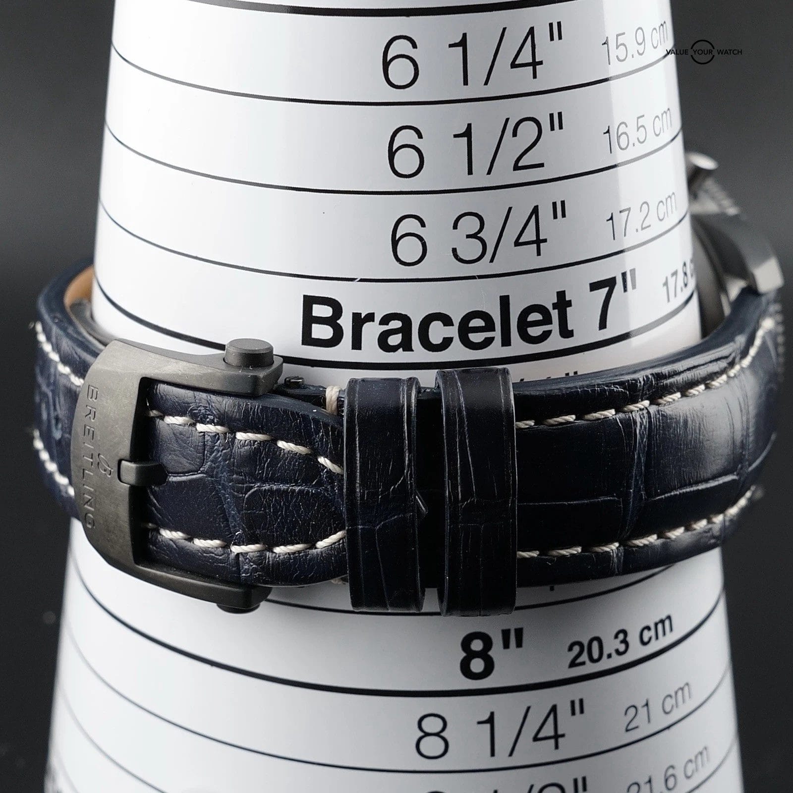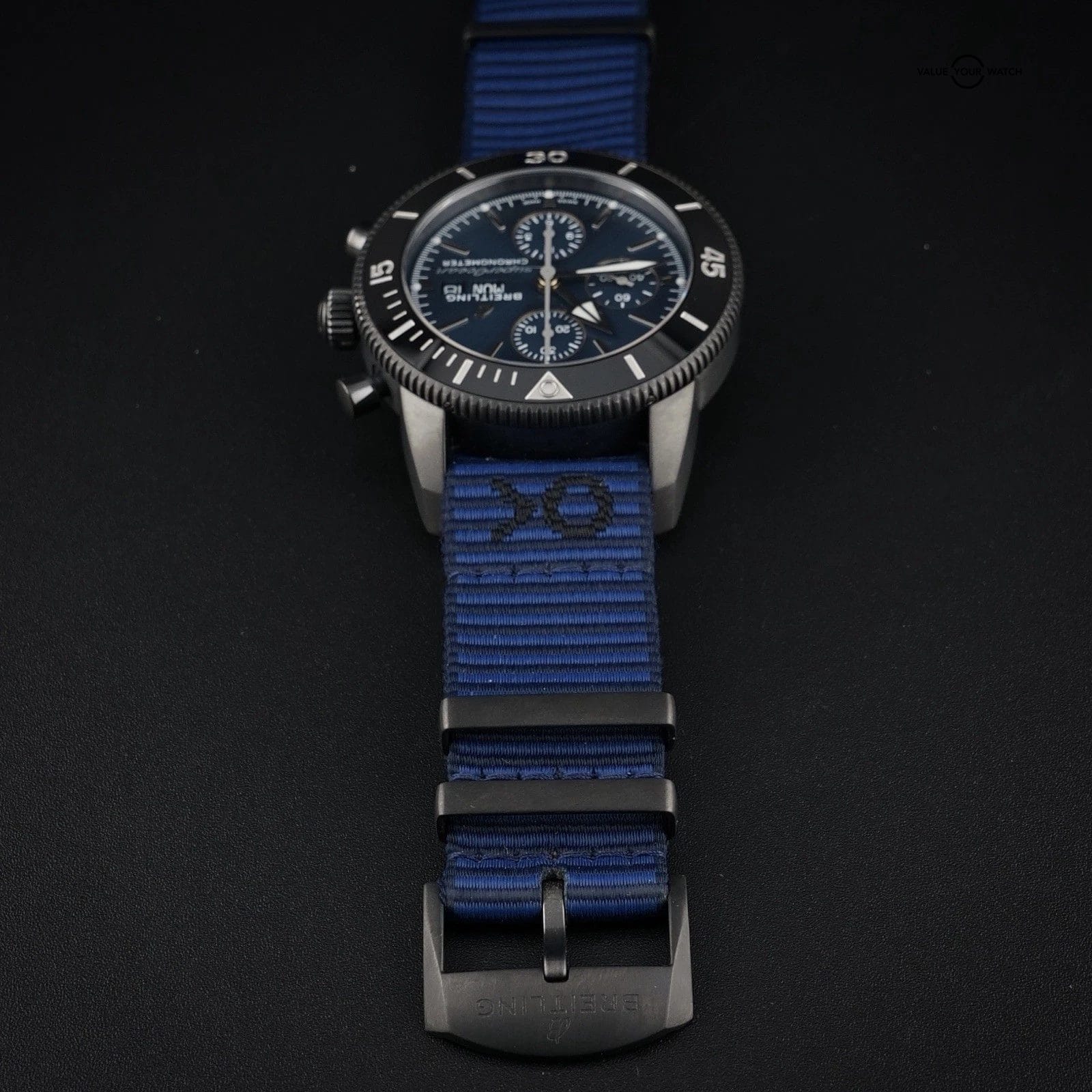 Straps & buckles • Original blue Outerknown ECONYL yarn single piece strap with black DLC Breitling tang buckle • Breitling blue leather strap with tan inner and contrasting stitching on matching black coated tang buckle • Leather strap comfortably fits up to about 8.0 inch wrist – Outerknown strap up to about 9.0 inches