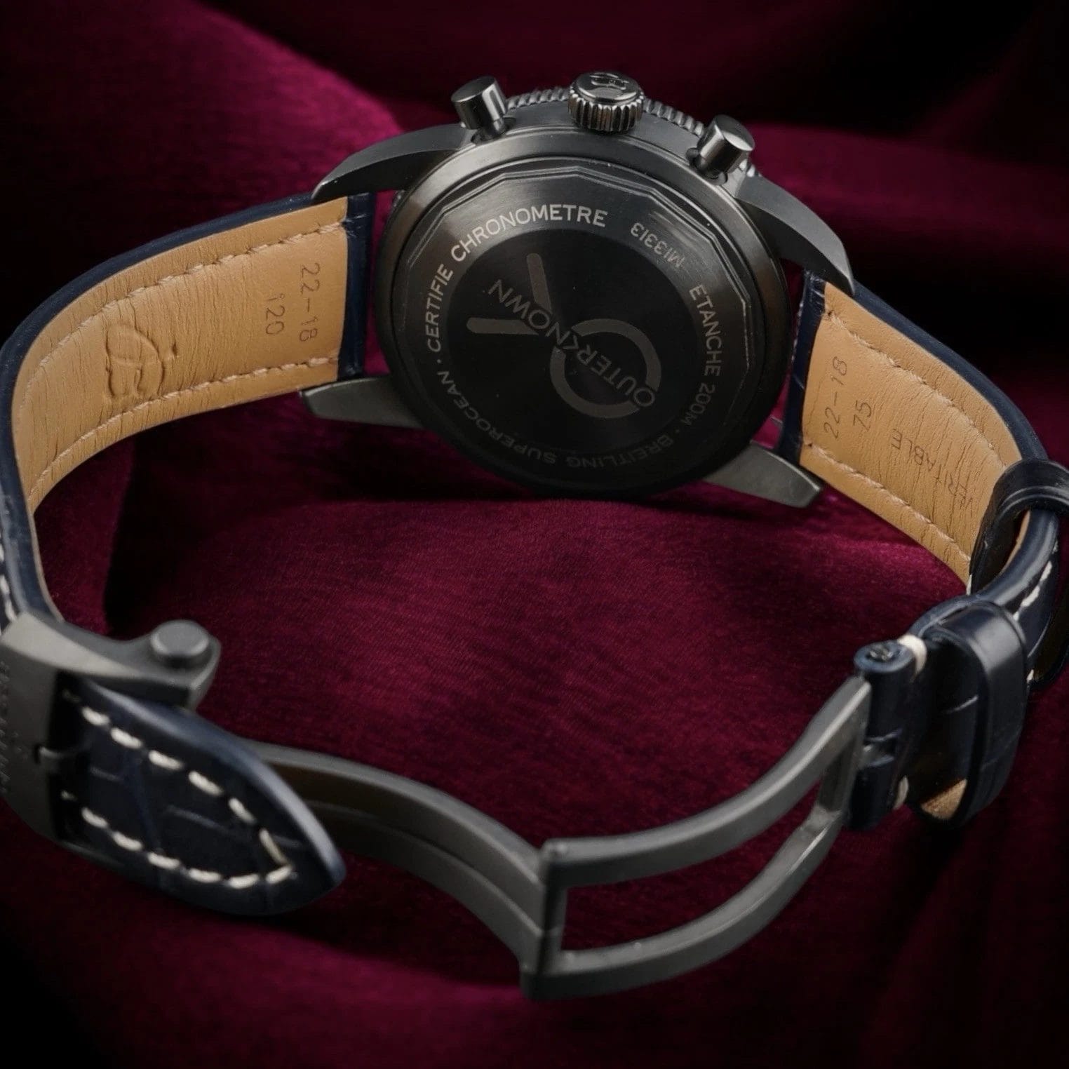 This example takes the collaboration a step further by including both the original Outerknown single piece strap and a Breitling blue leather strap with contrasting stitching, each on its own black coated buckle. You get the laid back surf ready NATO look for weekends and a more dressed alligator style for the office, all in one complete, collector friendly kit.