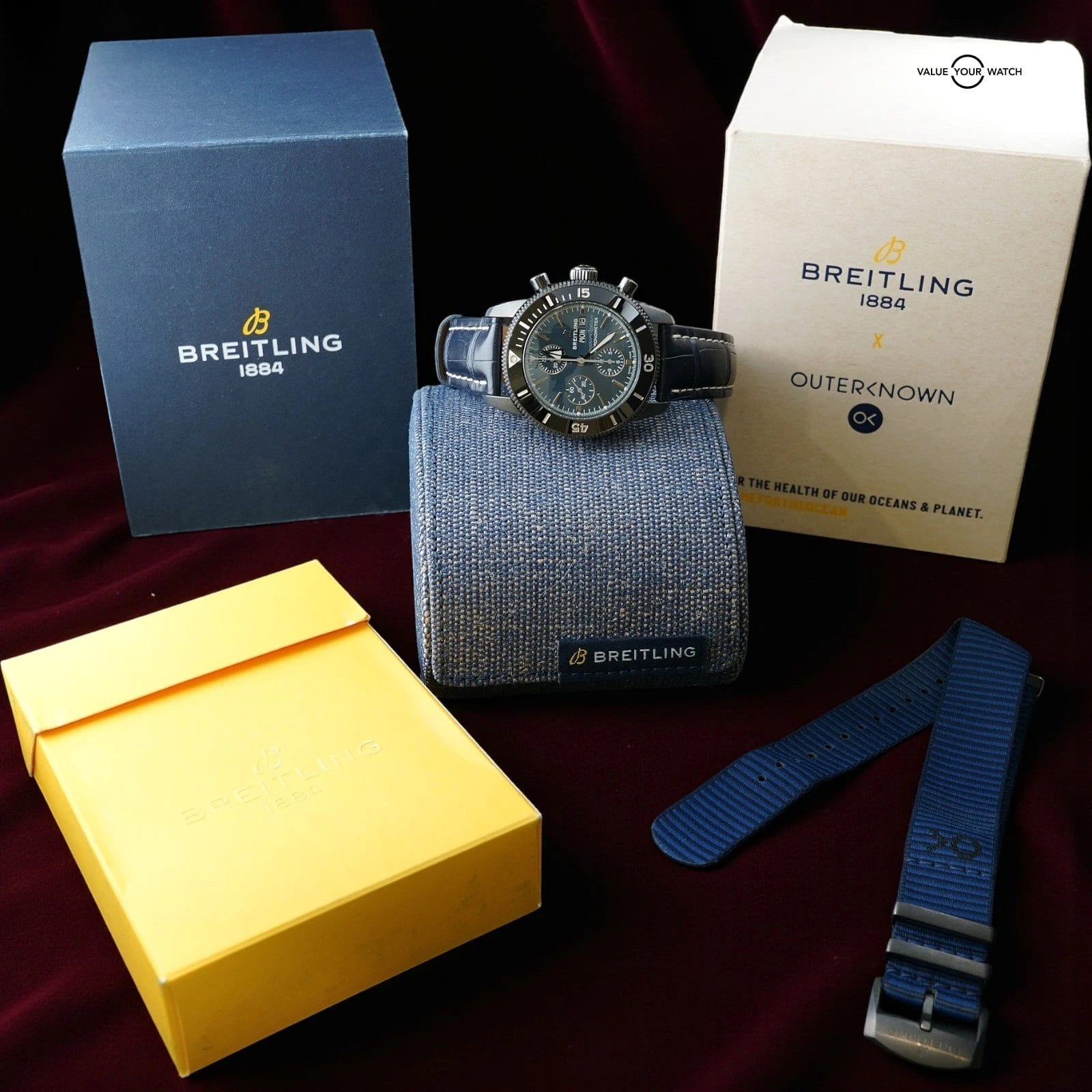 This Superocean Heritage Chronograph 44 Outerknown comes as a complete, presentation ready set that highlights the full collaboration story and keeps everything together for the next owner.