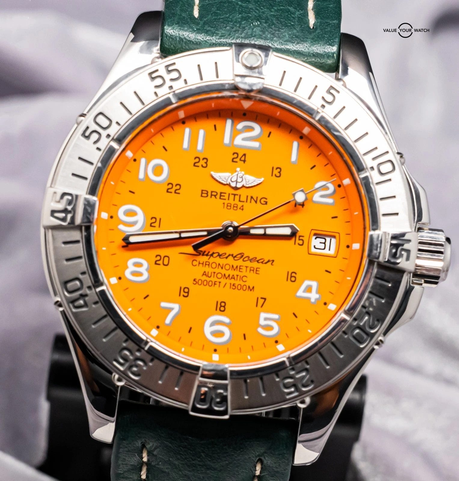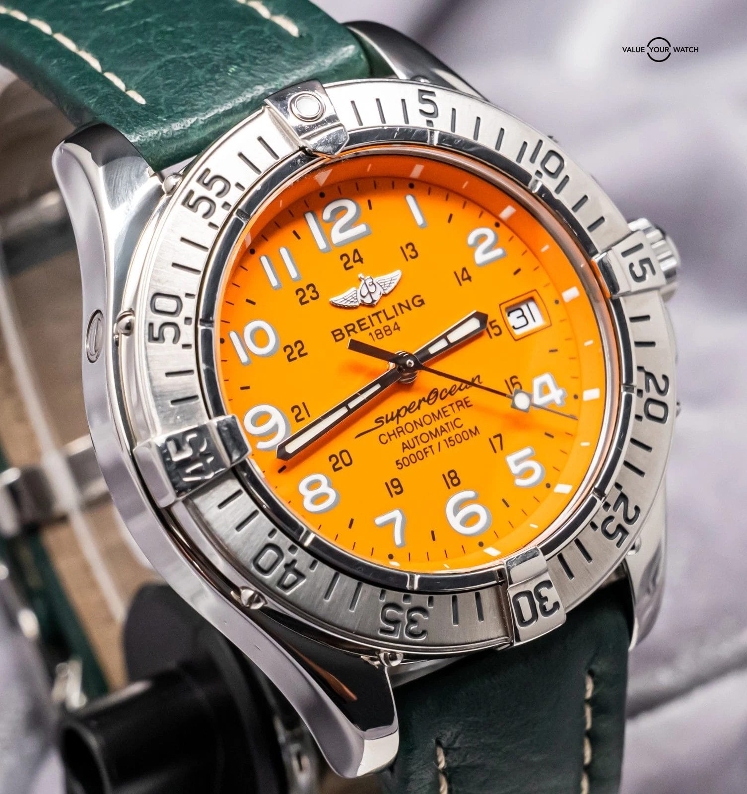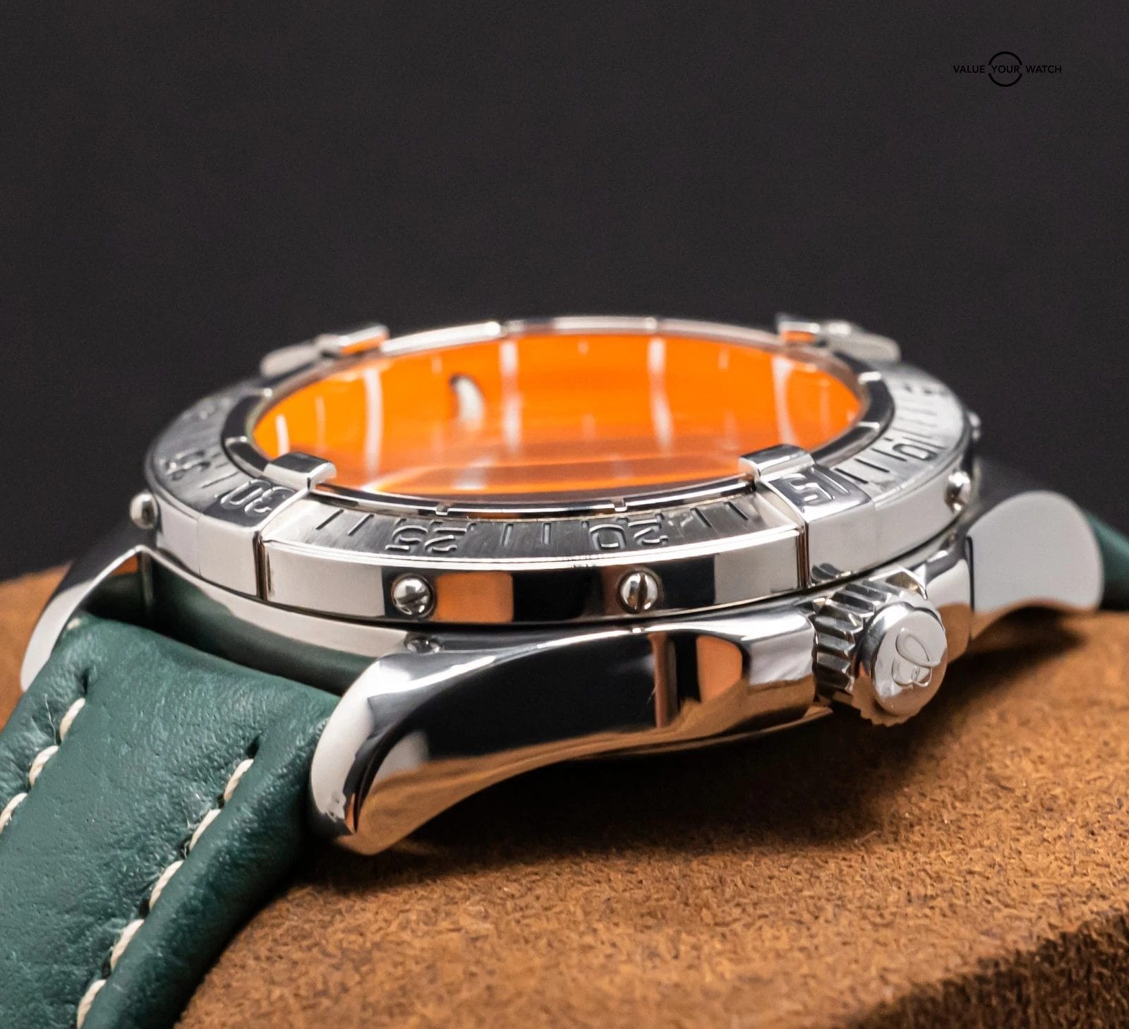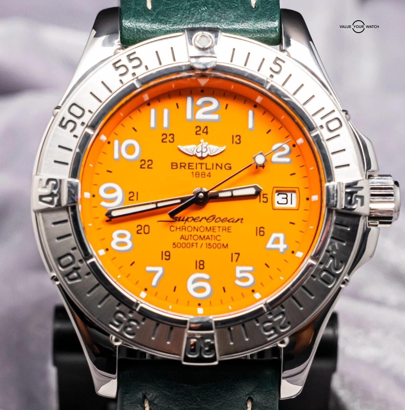 STUNNING Breitling Superocean Automatic 42 mm with Coral Orange Dial on Green Breitling Leather Strap & Deploy Clasp! Comes with original Breitling boxes and was FULLY SERVICED at my watchmaker in April 2025, a huge value-add. Being automatic, 42 mm, clean, and keeping good time, this Superocean presents itself as a fantastic value proposition at the dollar!