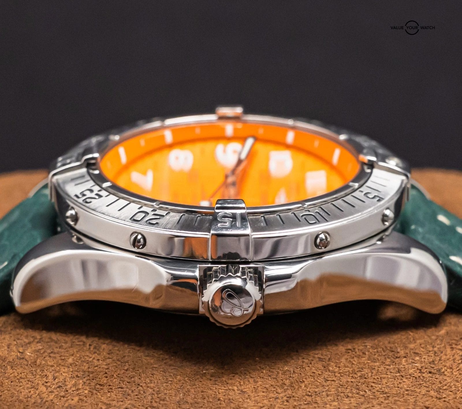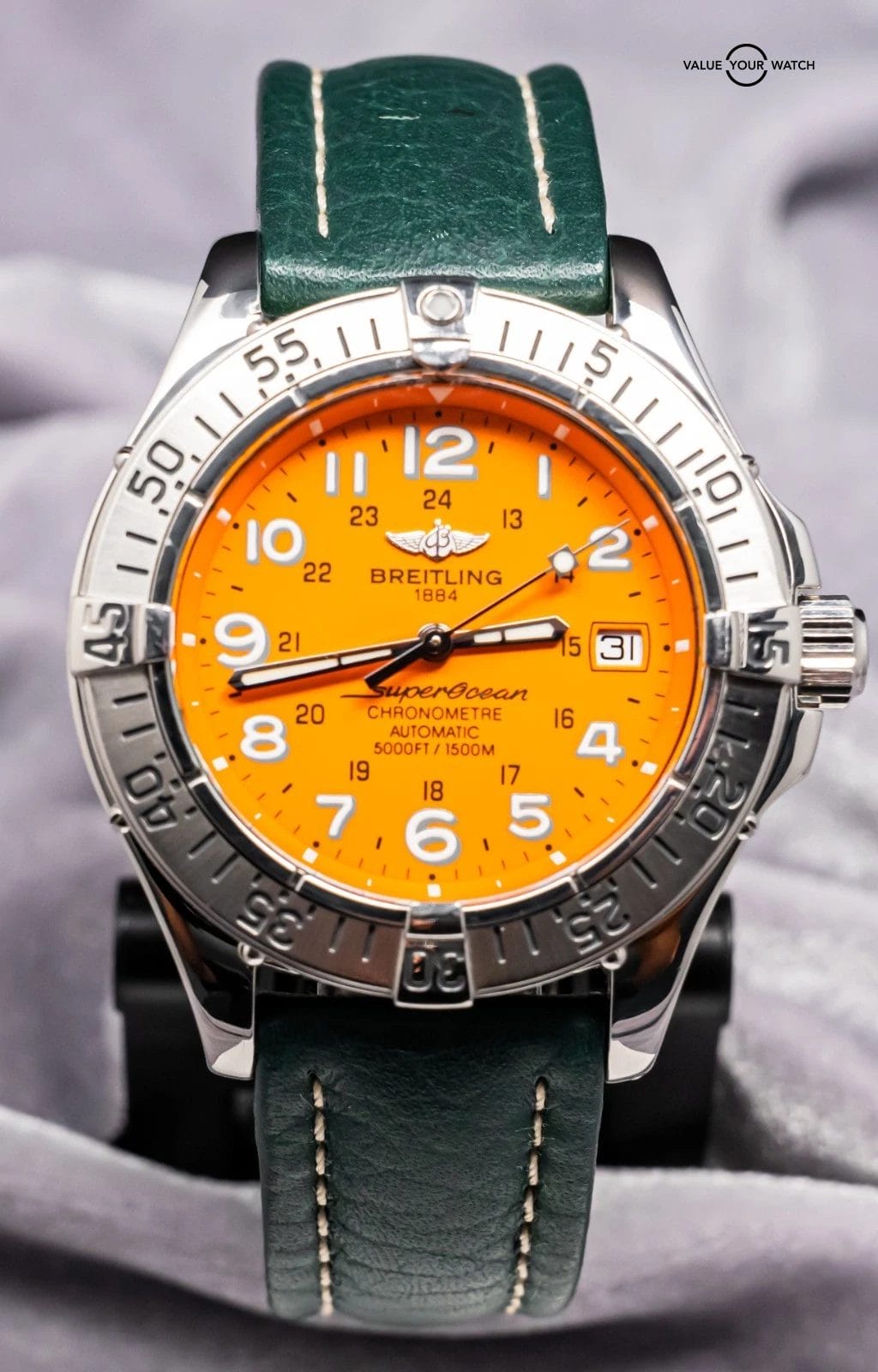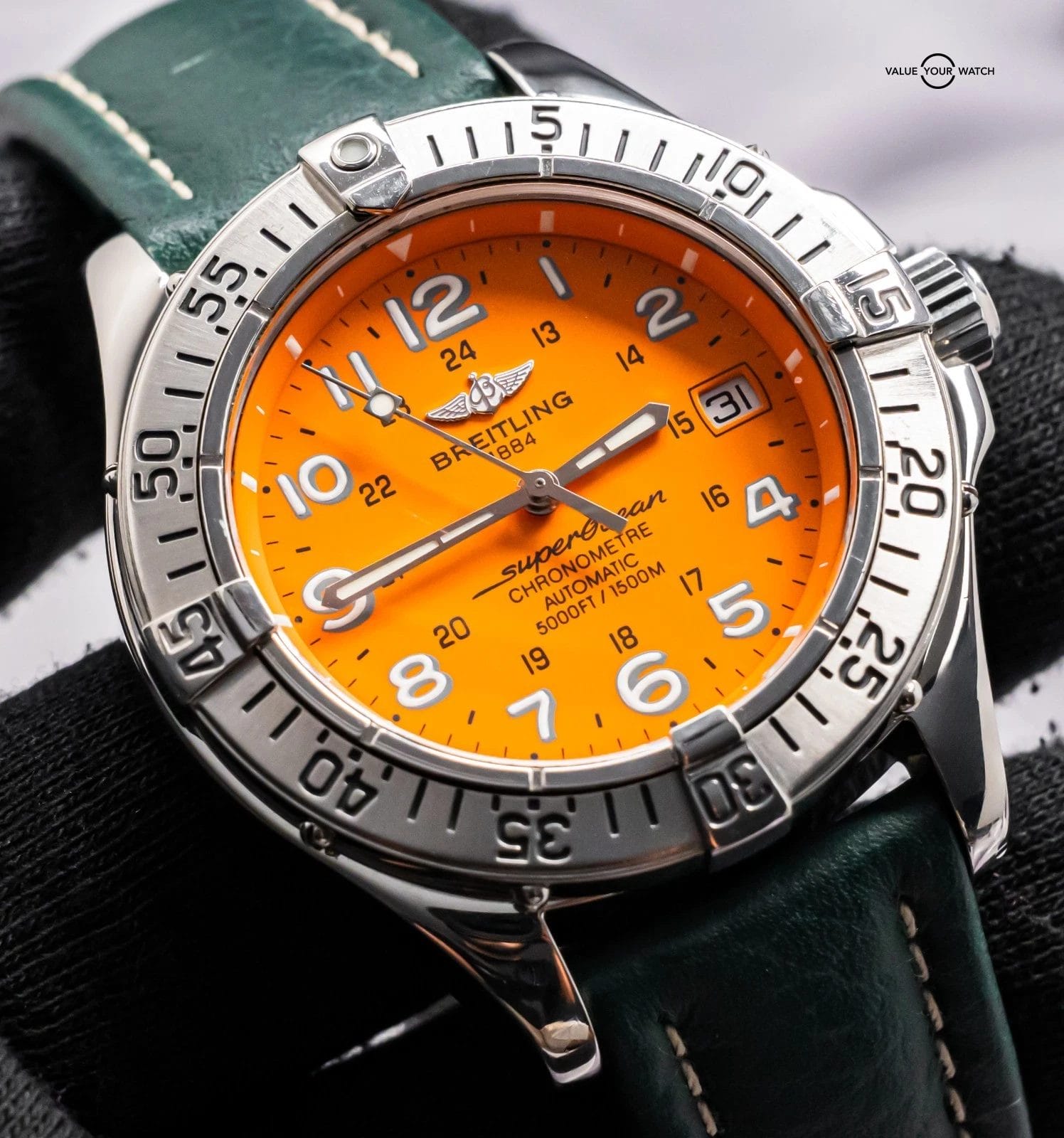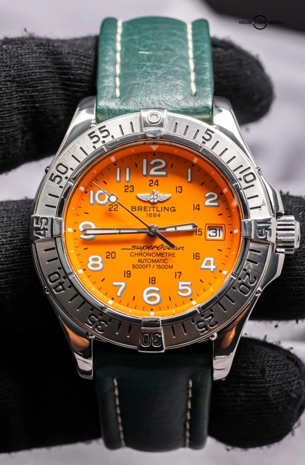 STUNNING Breitling Superocean Automatic 42 mm with Coral Orange Dial on Green Breitling Leather Strap & Deploy Clasp! Comes with original Breitling boxes and was FULLY SERVICED at my watchmaker in April 2025, a huge value-add. Being automatic, 42 mm, clean, and keeping good time, this Superocean presents itself as a fantastic value proposition at the dollar!