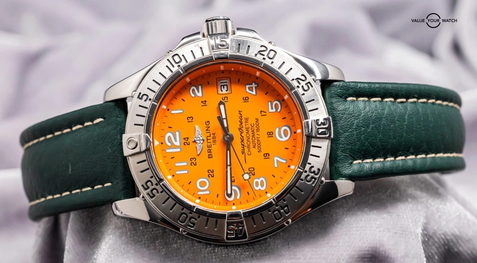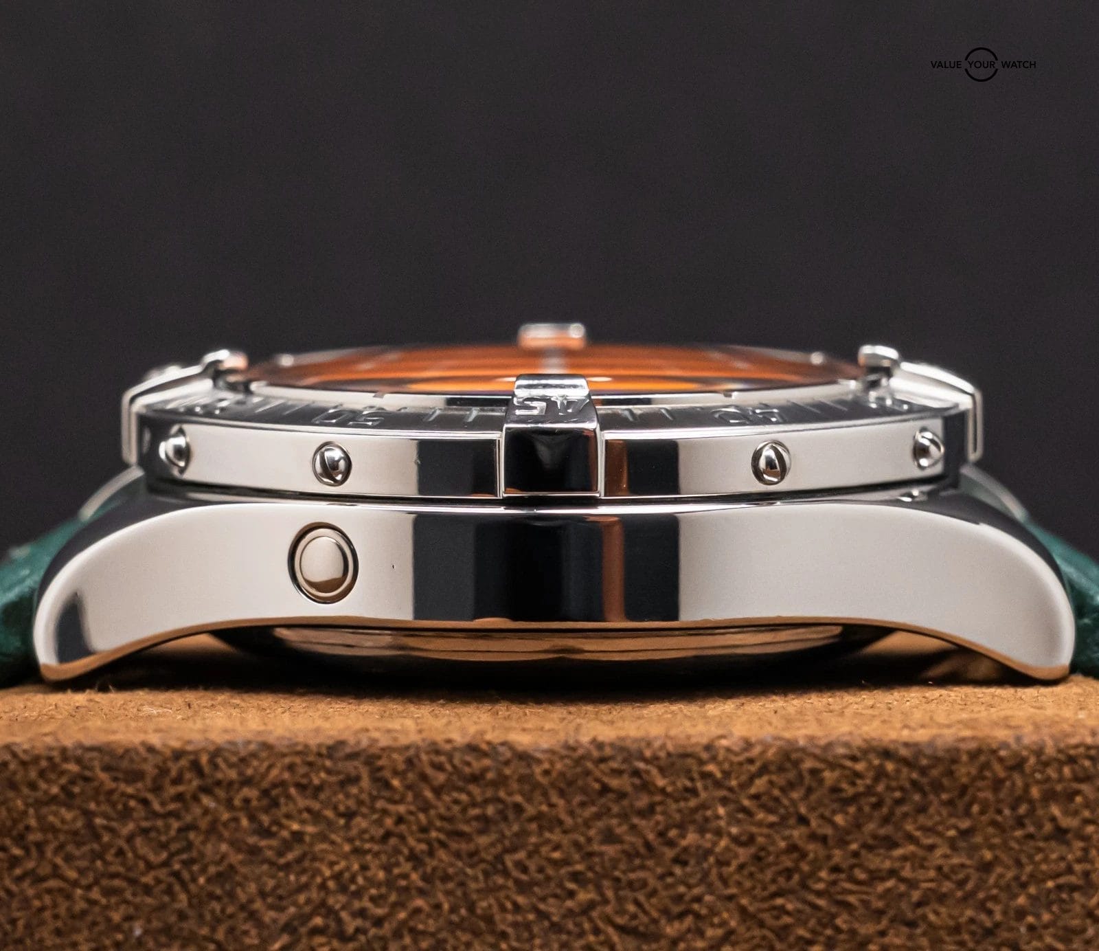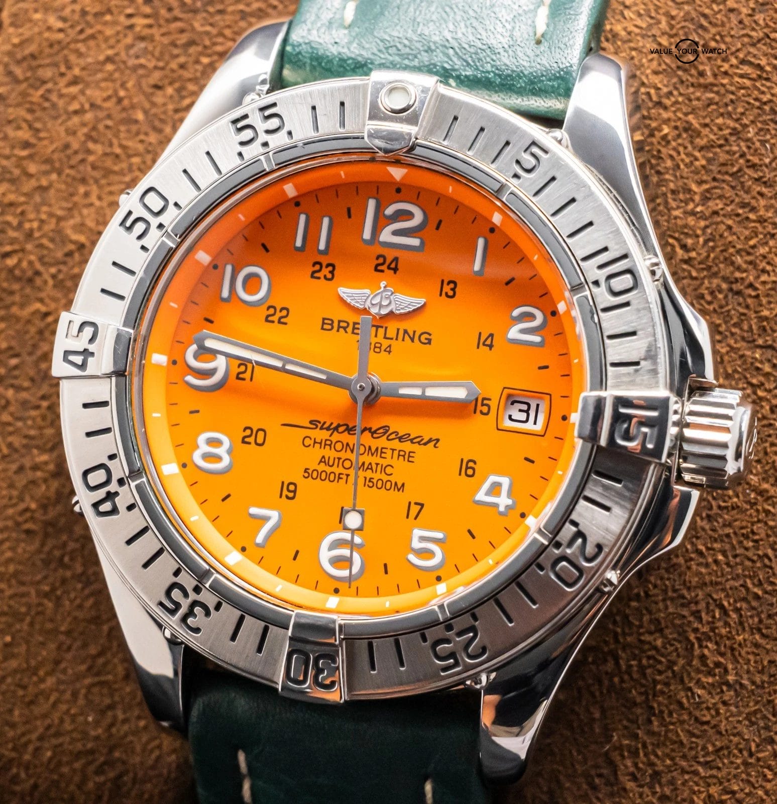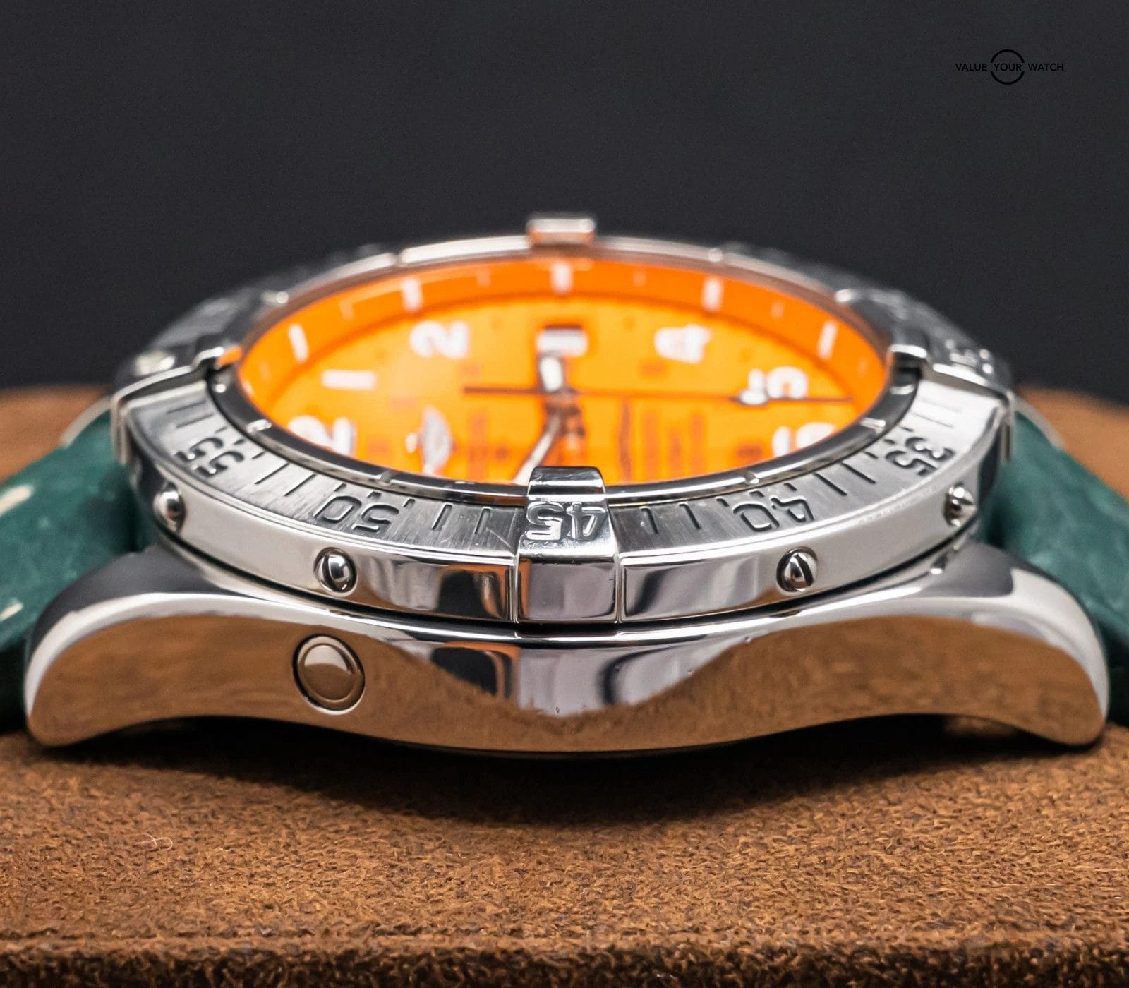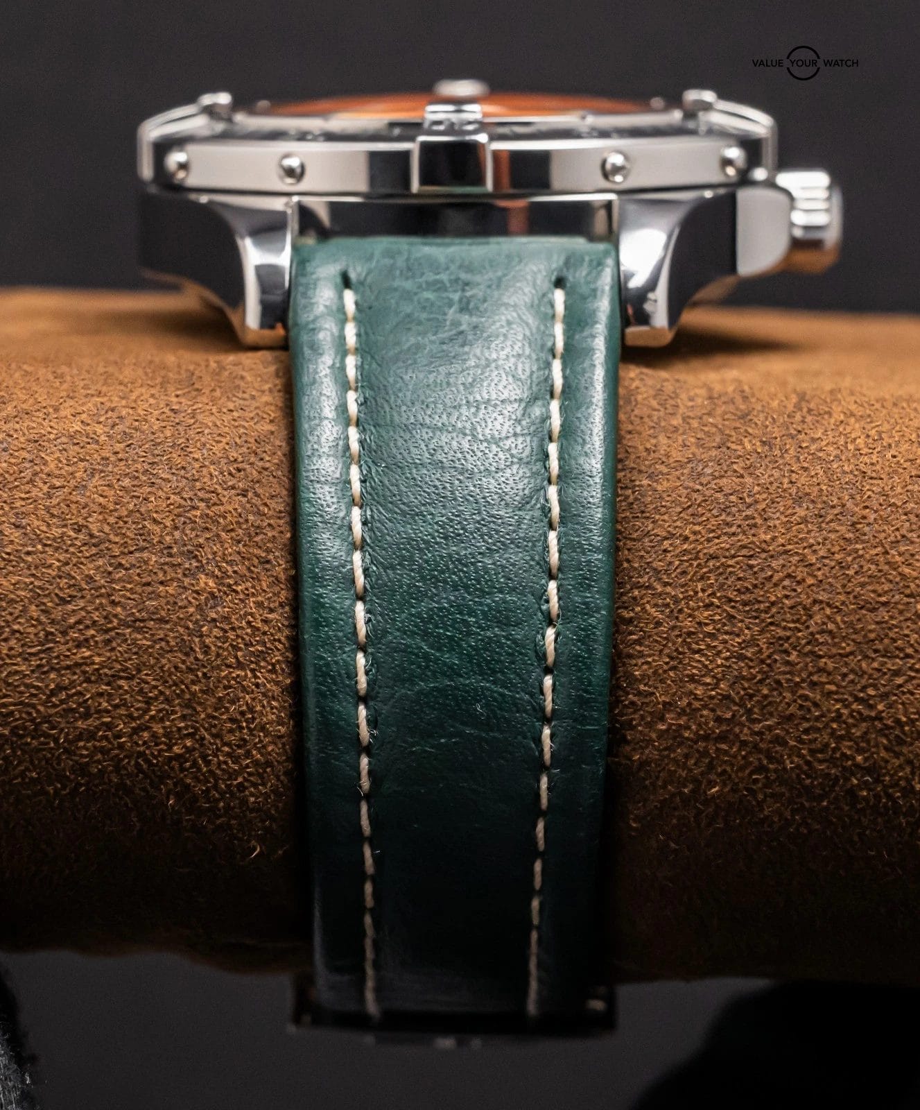 STUNNING Breitling Superocean Automatic 42 mm with Coral Orange Dial on Green Breitling Leather Strap & Deploy Clasp! Comes with original Breitling boxes and was FULLY SERVICED at my watchmaker in April 2025, a huge value-add. Being automatic, 42 mm, clean, and keeping good time, this Superocean presents itself as a fantastic value proposition at the dollar!