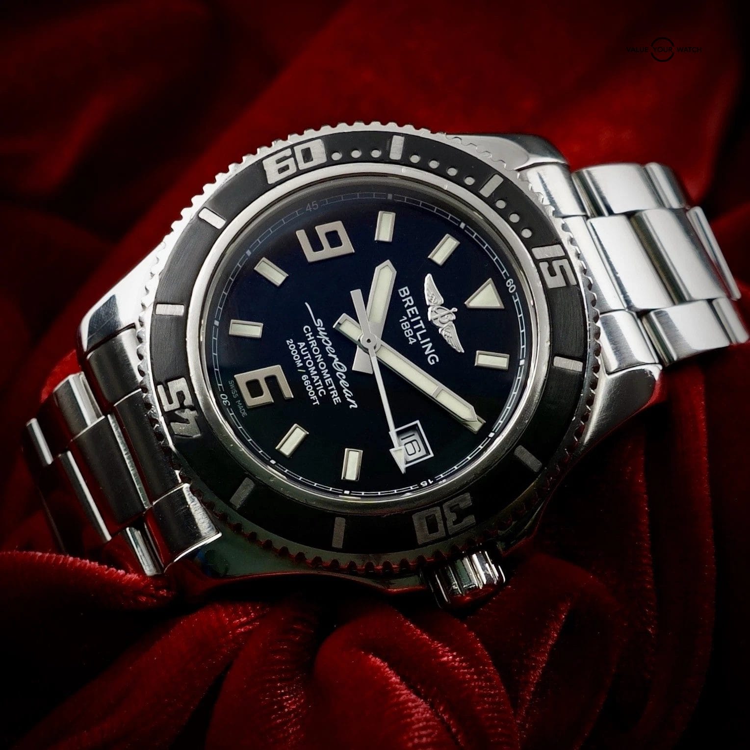 Breitling Superocean 44 A17391 for sale, Breitling Superocean 2000m diver watch, Breitling Superocean full set Mayors USA, Breitling A17391 black dial steel bracelet, Breitling collector watch Boca Raton, buy Breitling Superocean complete set, Wrist Flex Timepieces Breitling dealer