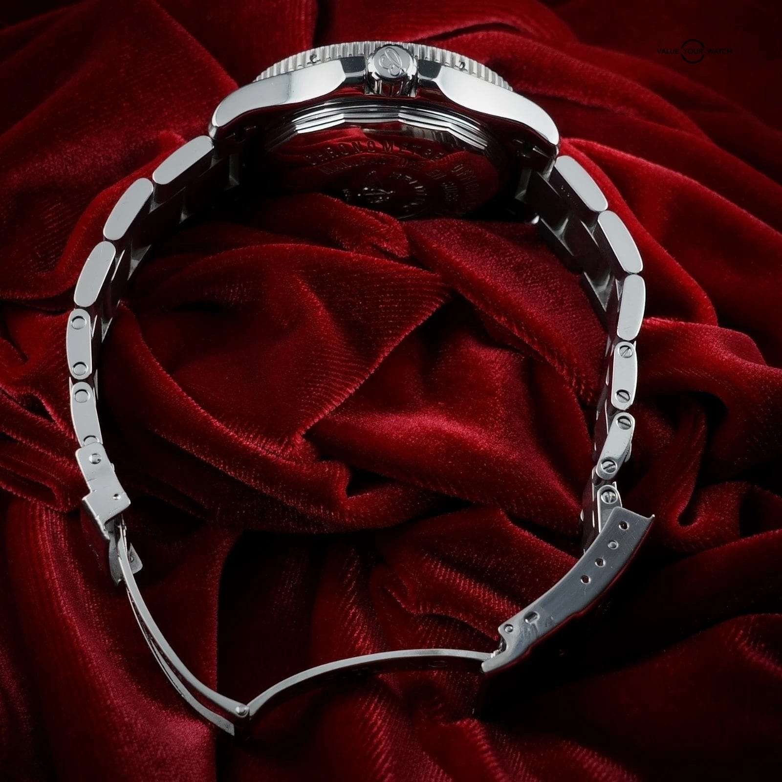 This Breitling Superocean 44 A17391 is presented as a full complete set – exactly what serious collectors and enthusiasts look for. The watch showcases Breitling’s legendary dive-ready engineering with an impressive depth rating and timeless black dial aesthetic.