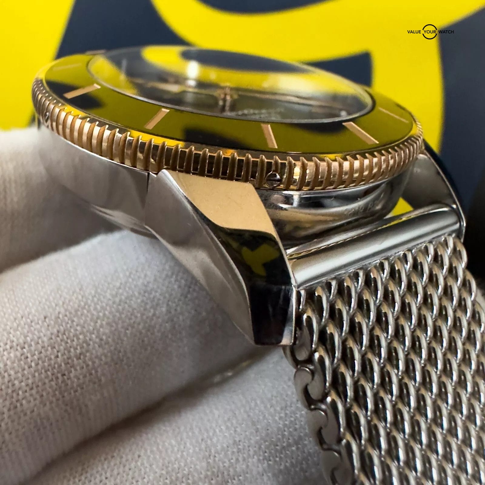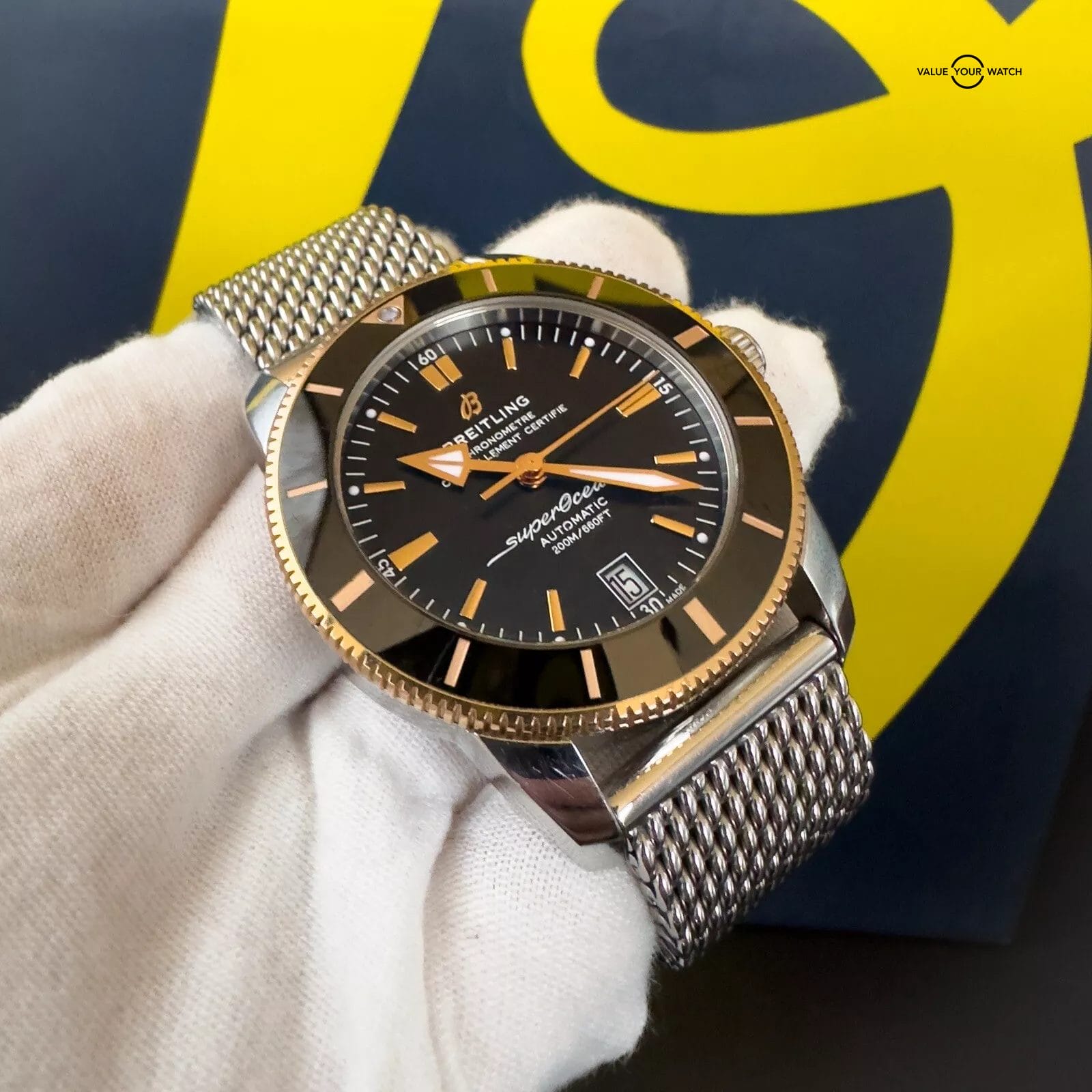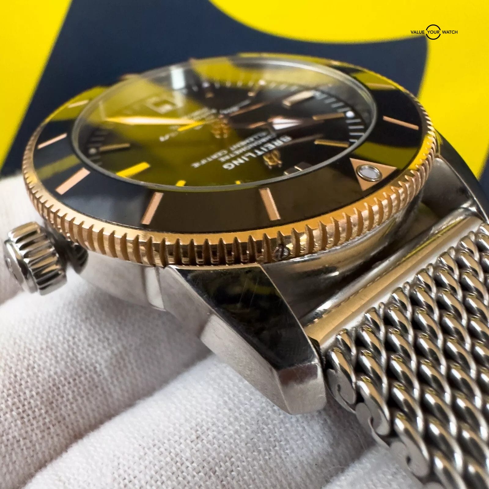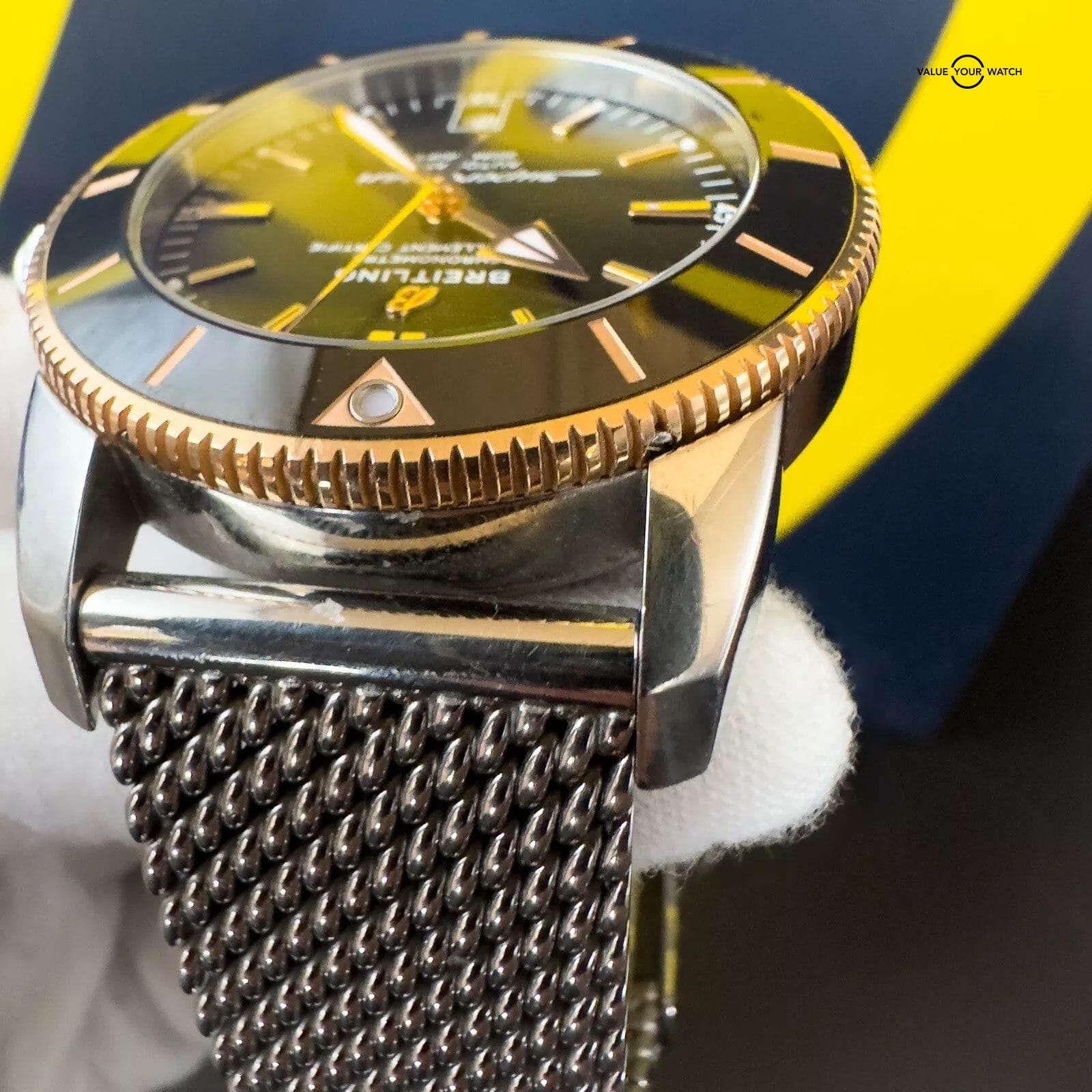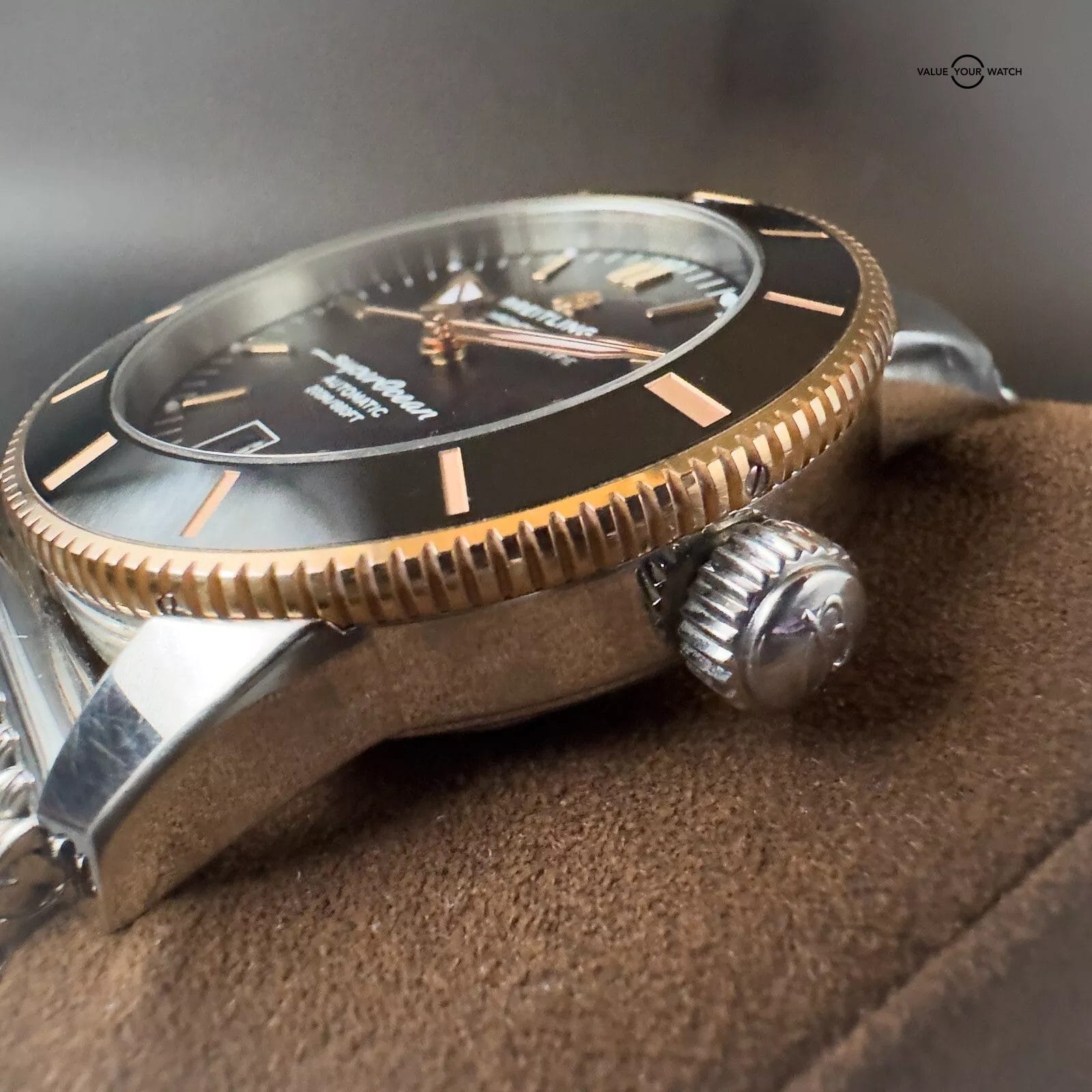 Introducing the epitome of elegance and performance – the Breitling Superocean Heritage II Red Gold 42mm watch. Crafted with precision and passion, this timepiece is a celebration of Breitling’s legacy of excellence. This beautiful model has a black dial and bezel with accents of brilliant red gold. It’s in amazing condition, with a clean bezel, minimal wear on the case and clasp, and a light scratch over the date window. I’m happy to provide more pictures upon request!