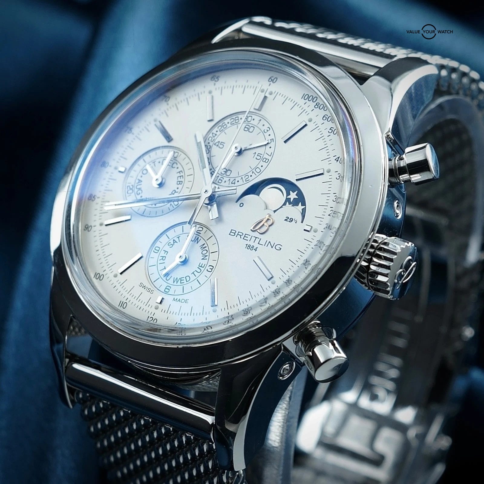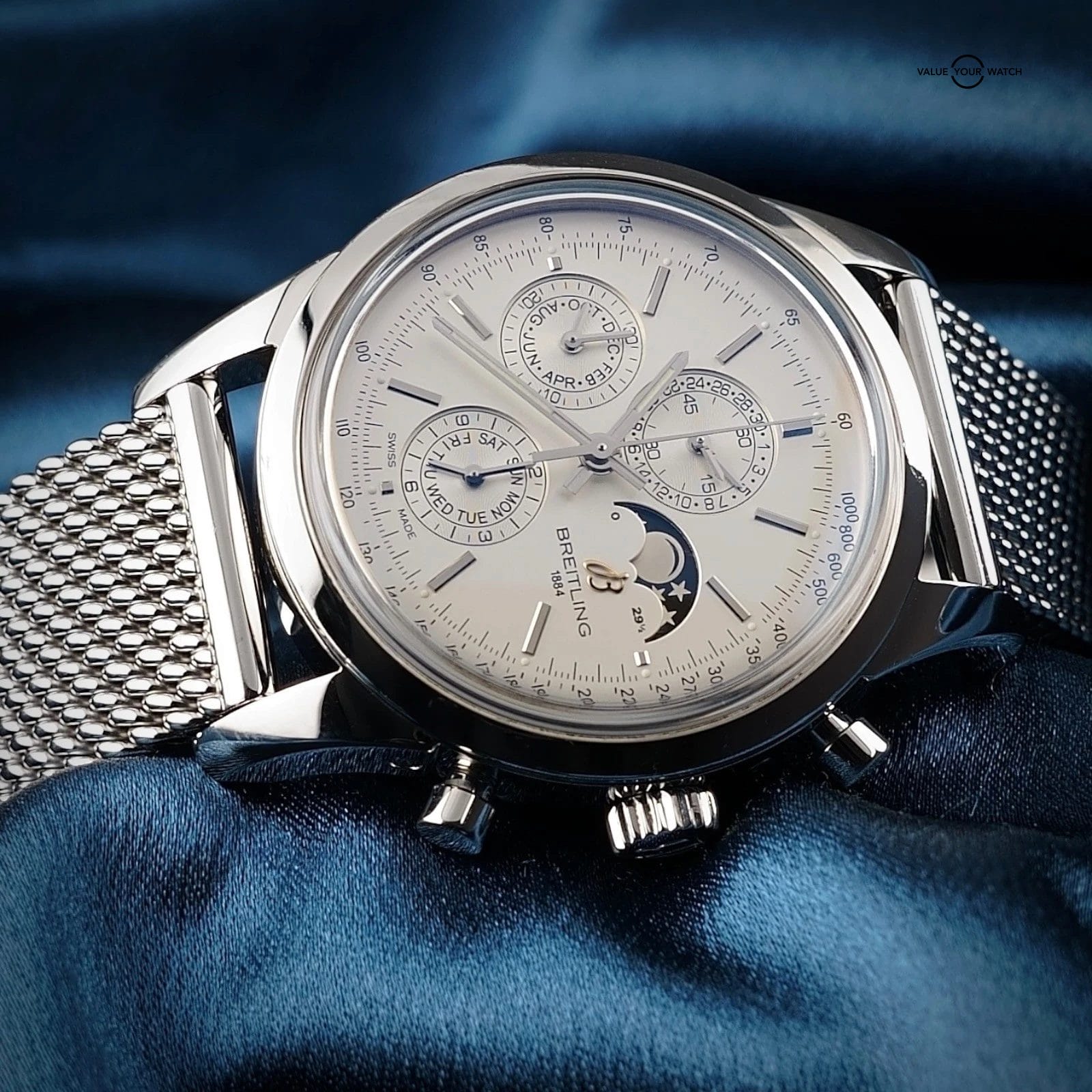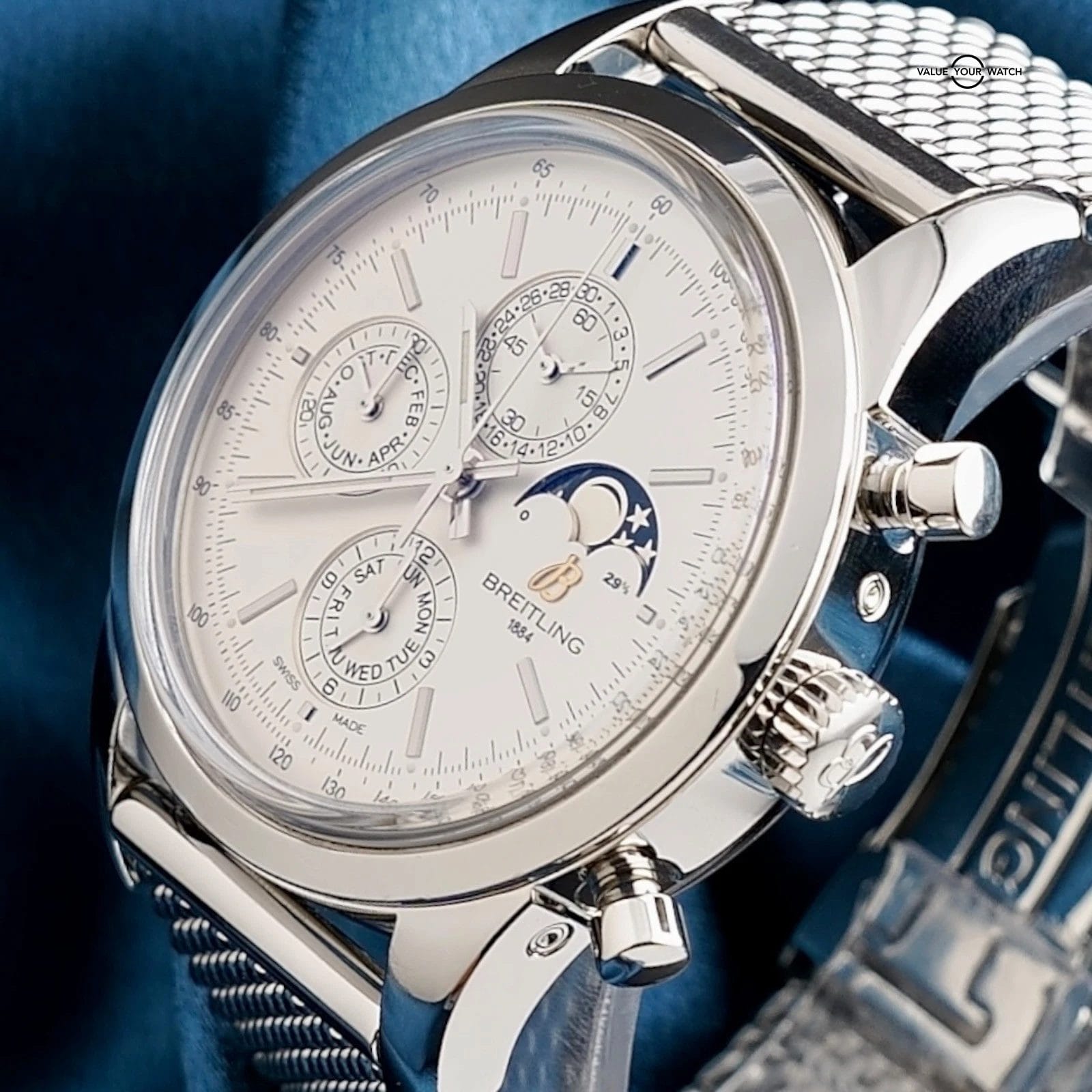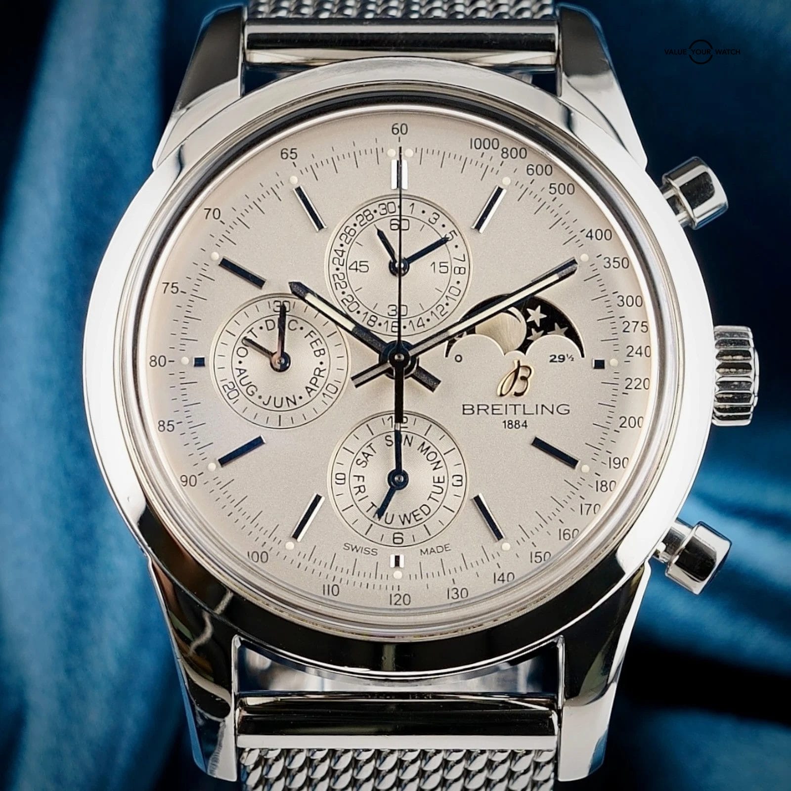 A refined Breitling complication piece with chronograph, moonphase, and full calendar appeal