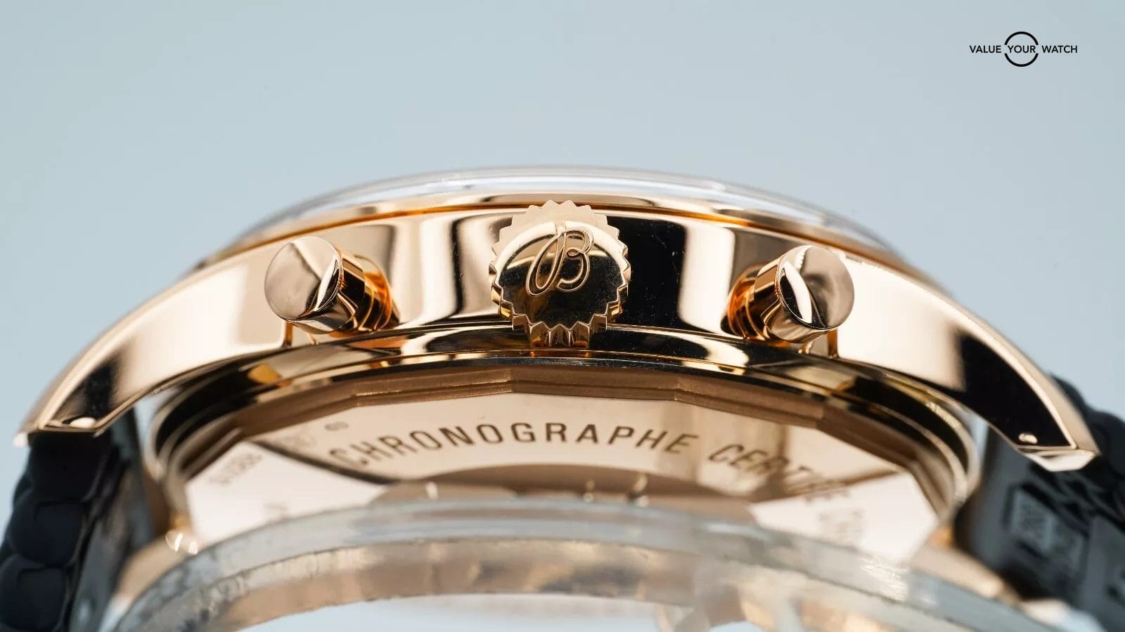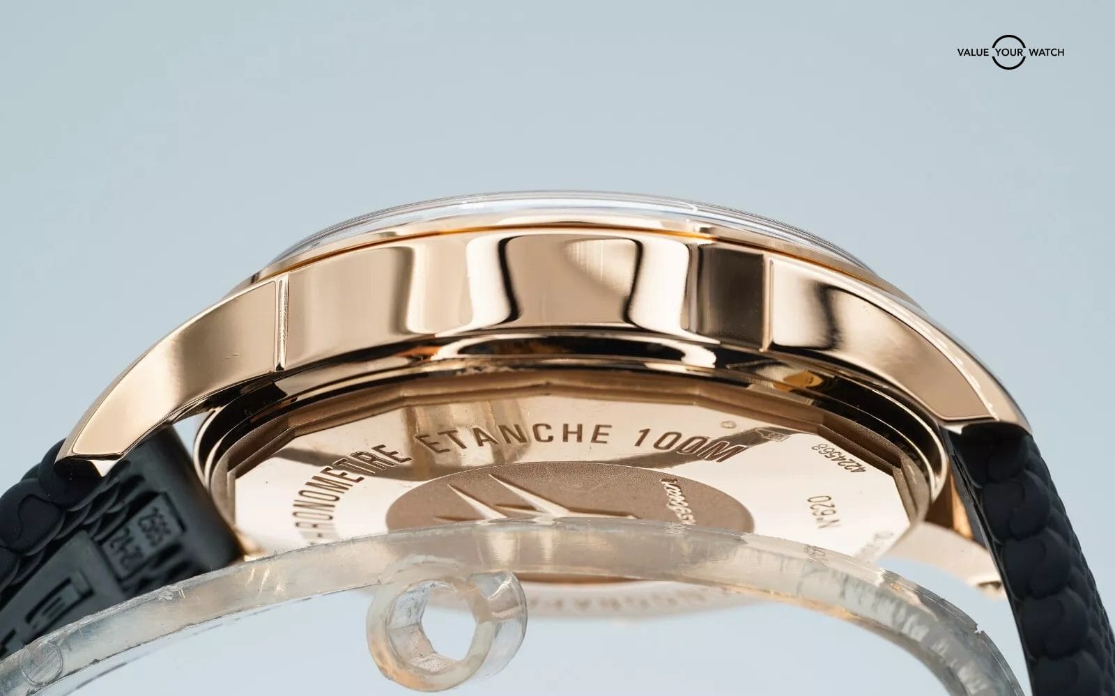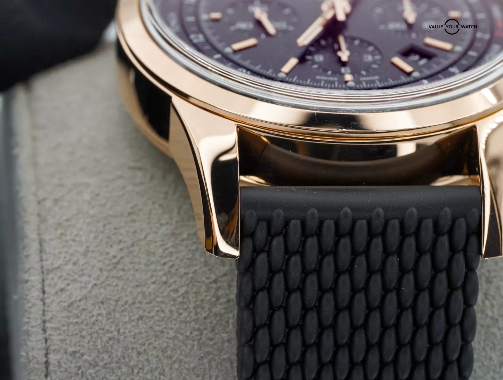 This beautiful timepiece comes with the outer black box, inner wooden box, Inner travel roll and instruction booklet. The watch is in phenomenal pre-owned condition with very light cosmetic wear throughout the case and clasp. At 46mm set in Rose Gold this is a piece sure to stand out in any collection. The crystal AR coating shows typical wear throughout. The rubber band will accommodate up to a 8” wrist. The last known MSRP was $37,800. Pay close attention to the pictures as they accurately describe the condition. Mechanically the watch is functioning as it should. Serial numbers and names are blurred in photos only for privacy reasons.
