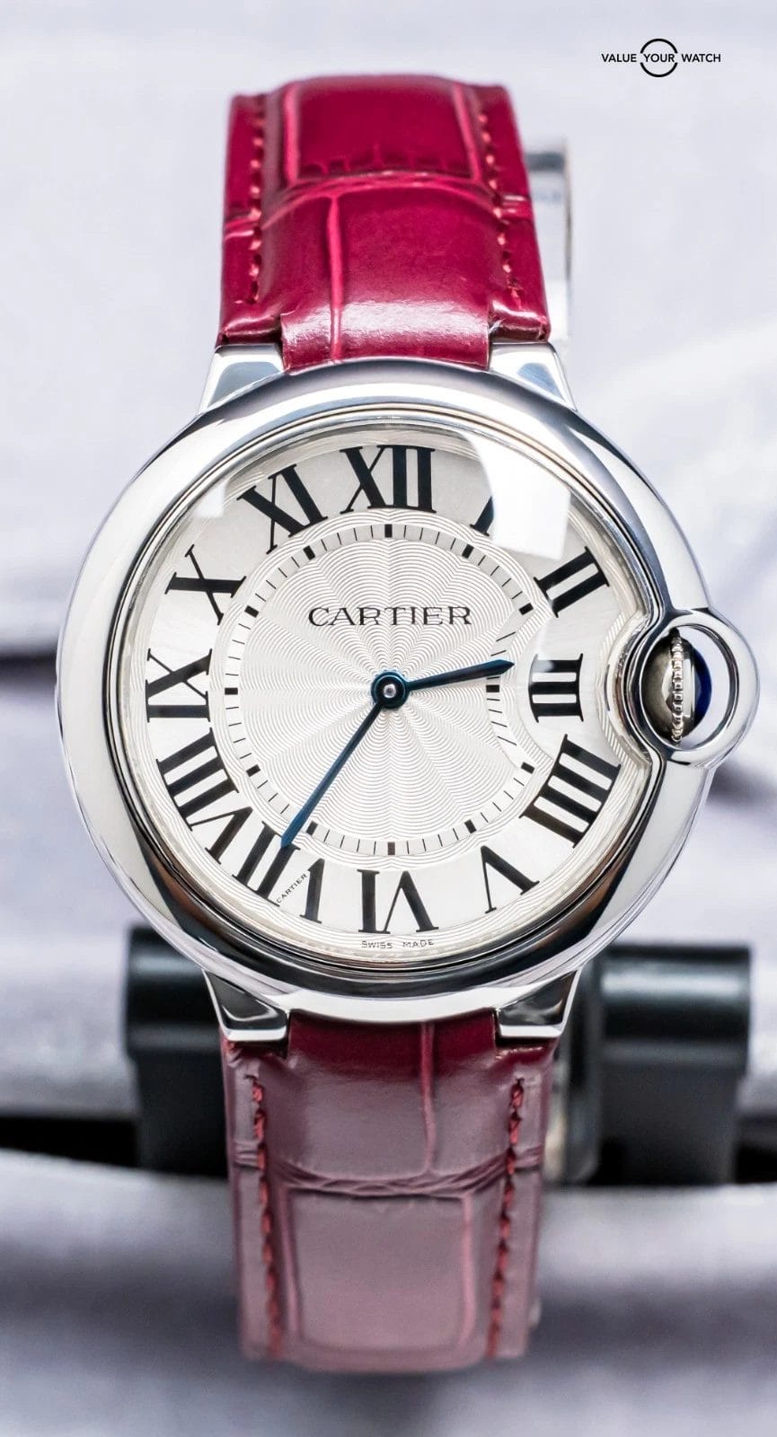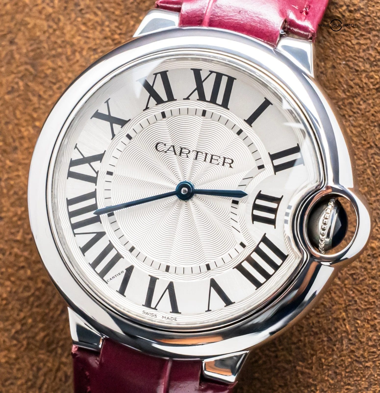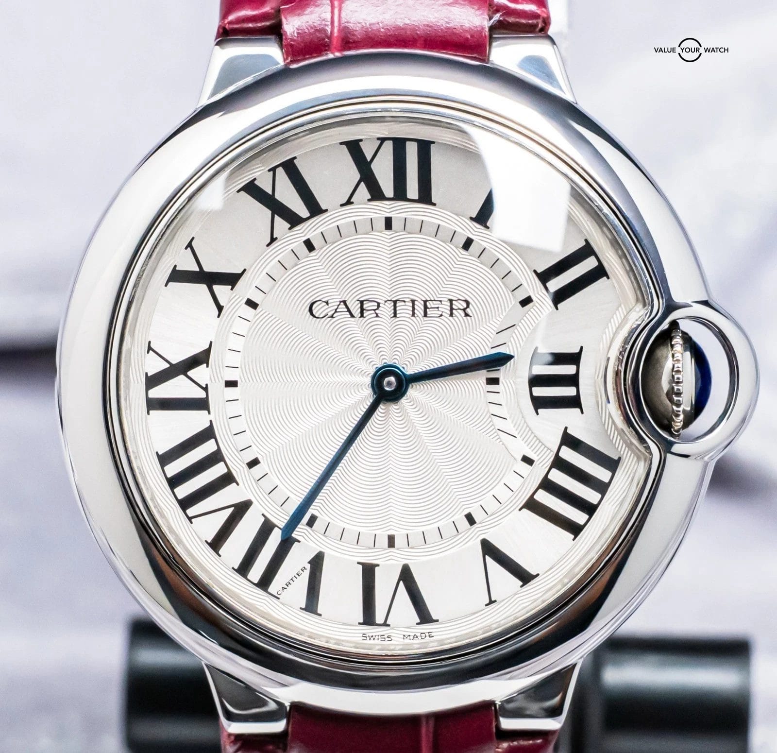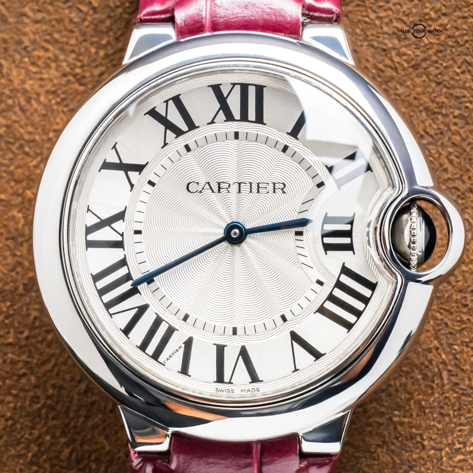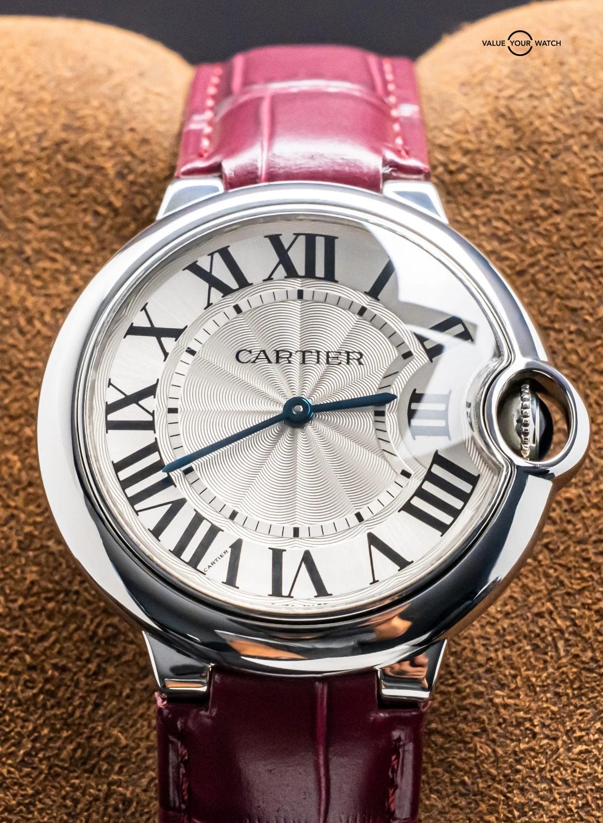 STRIKING Cartier Ballon Bleu 36 mm Quartz with Silver Dial on Purple Cartier Alligator Strap! Super classy and a very wearable size for women at 36mm, my most recommended size when it comes to Cartier women’s recommendations. Arrives as watch only and is a super fun look on wrist with the Purple Cartier Strap. Ready to be on wrist!