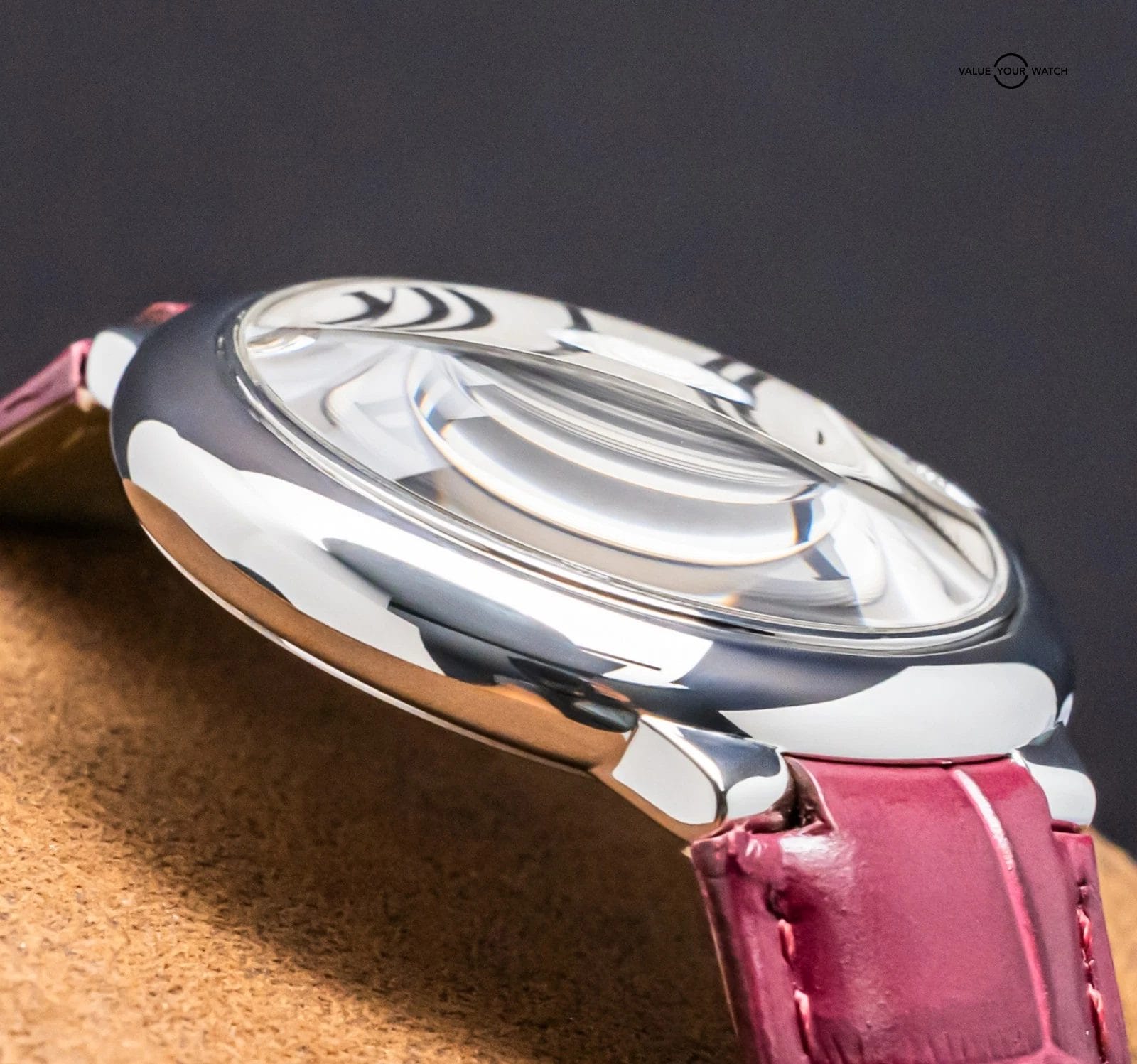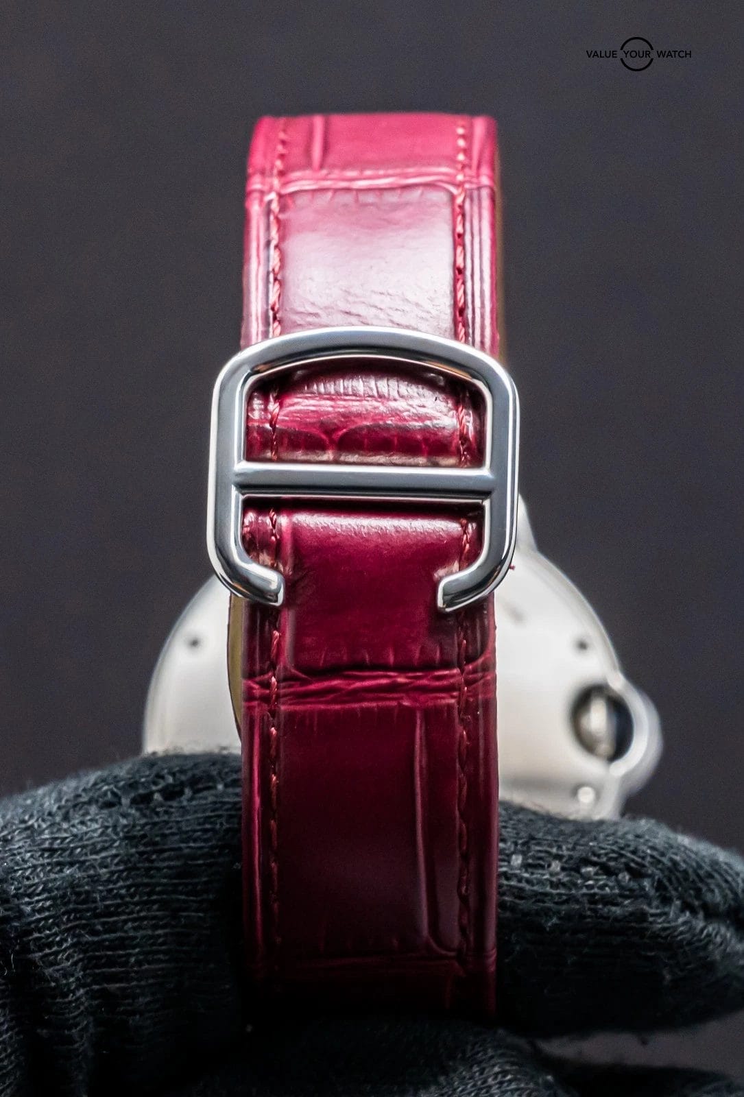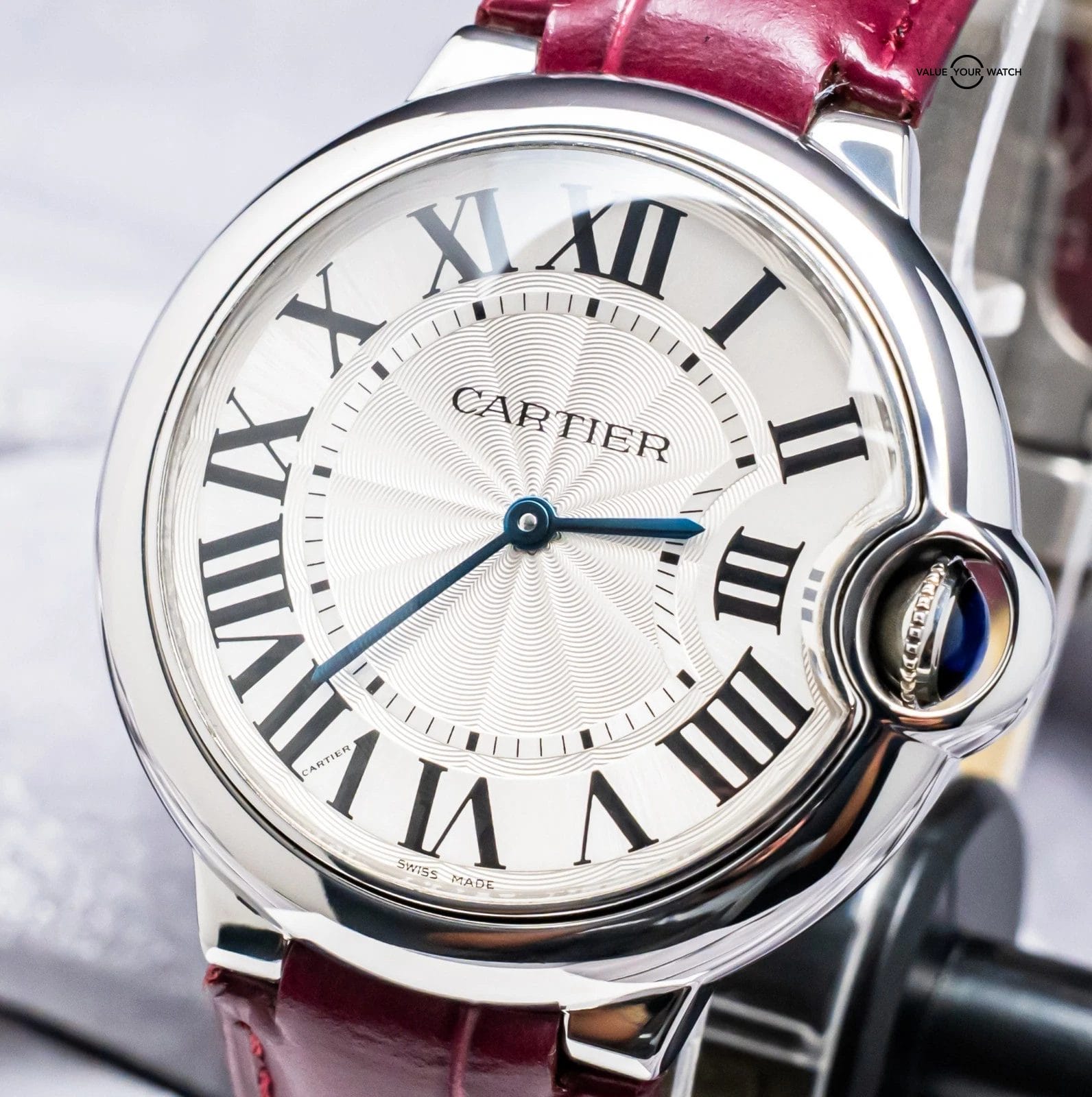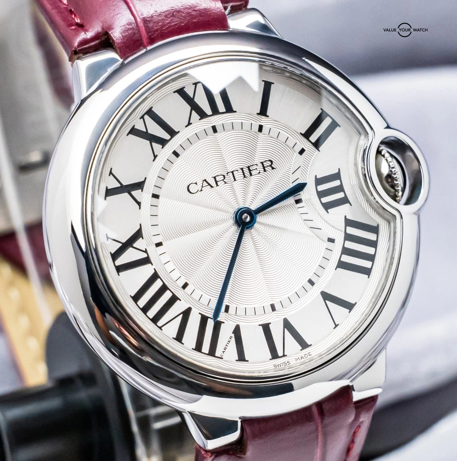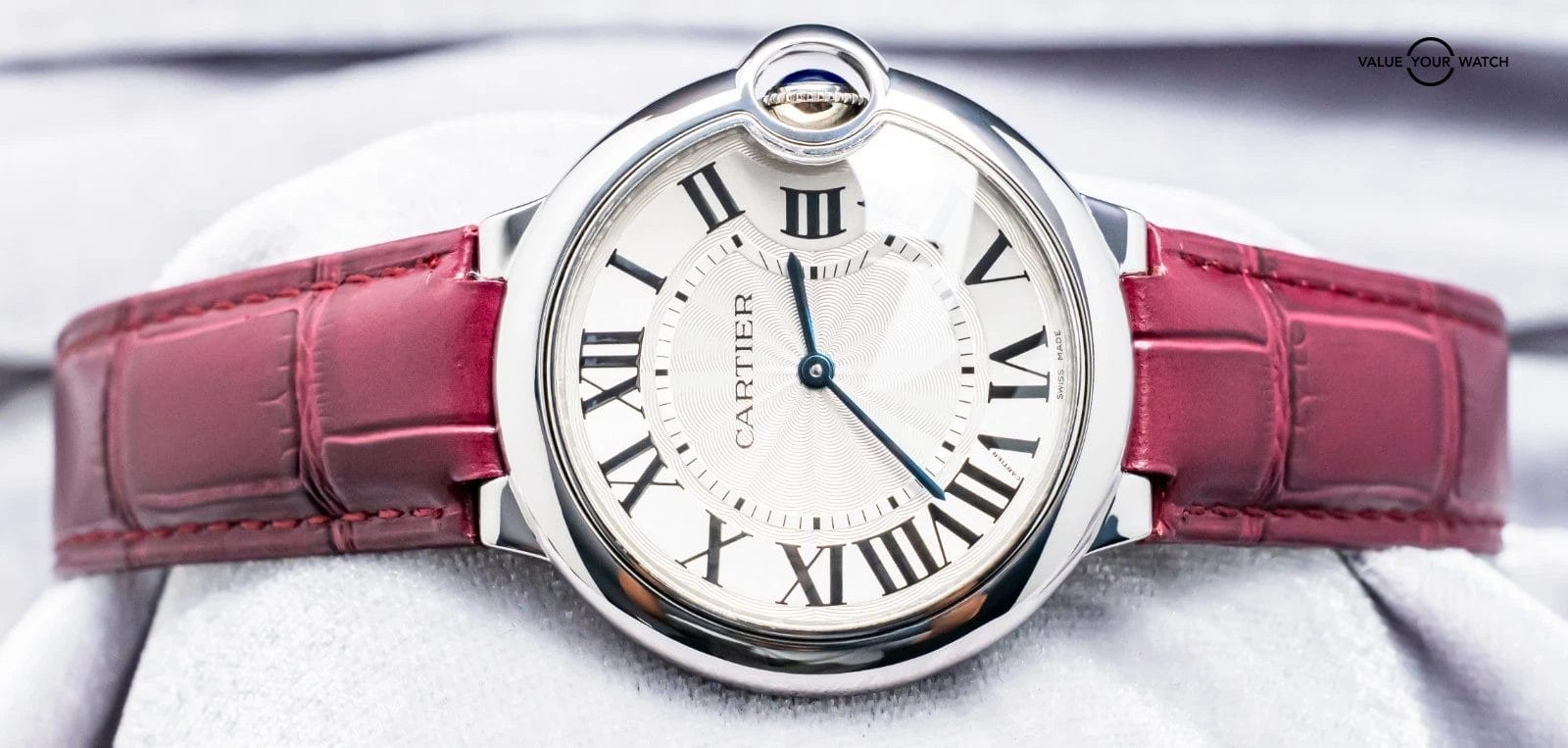 STRIKING Cartier Ballon Bleu 36 mm Quartz with Silver Dial on Purple Cartier Alligator Strap! Super classy and a very wearable size for women at 36mm, my most recommended size when it comes to Cartier women’s recommendations. Arrives as watch only and is a super fun look on wrist with the Purple Cartier Strap. Ready to be on wrist!