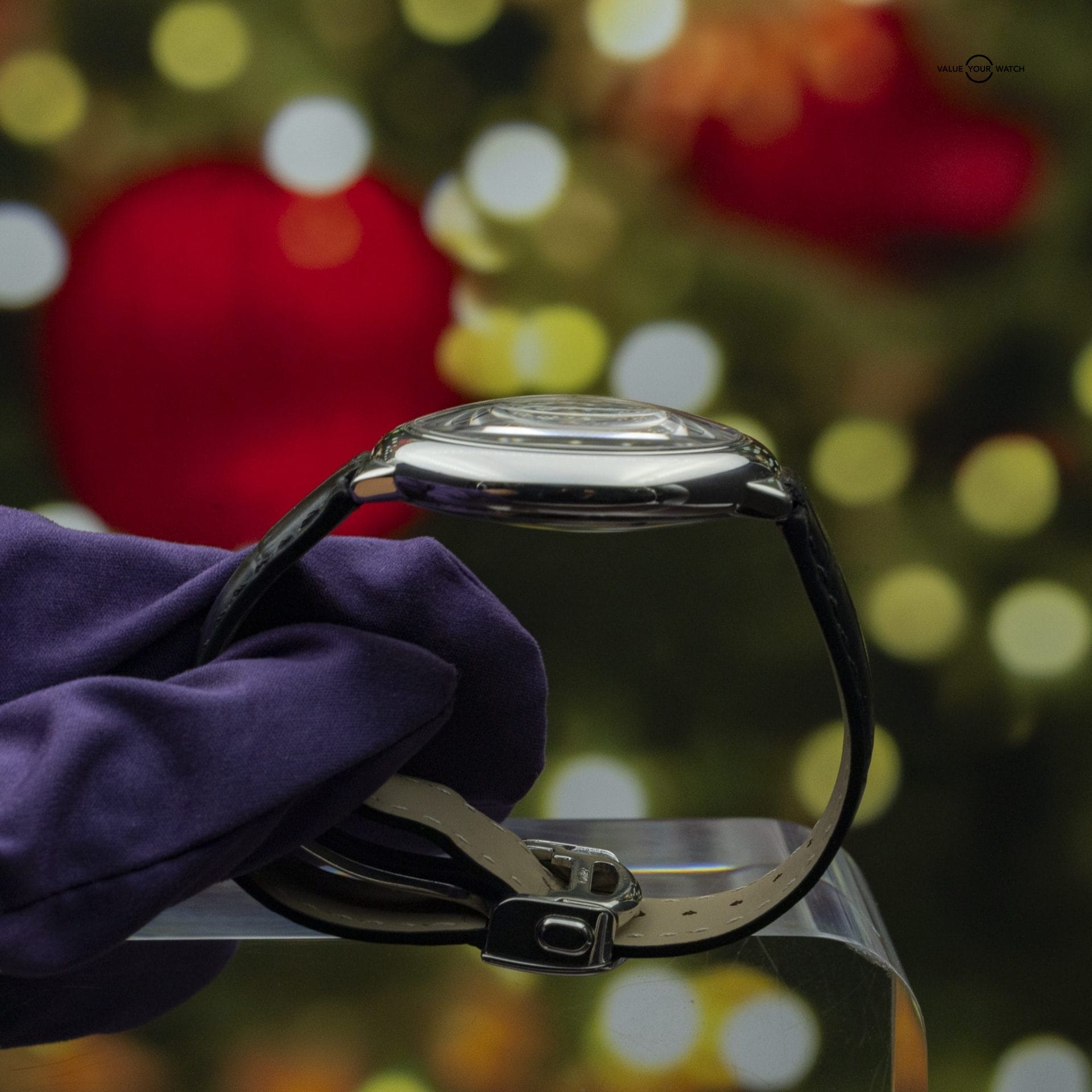 This 2023 example maintains excellent condition throughout. Case and crystal show no notable wear. The silver guilloché dial remains pristine—no fading or moisture damage. Movement running accurately with smooth date transition. The black leather strap shows light wear around the clasp area from occasional use, which is normal and expected for leather, while the rest of the strap remains in excellent condition. Complete presentation set with box and papers makes this ideal for gifting or personal collection.