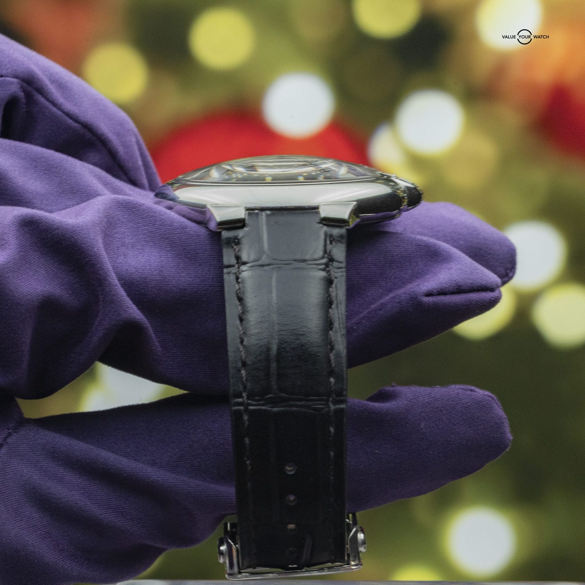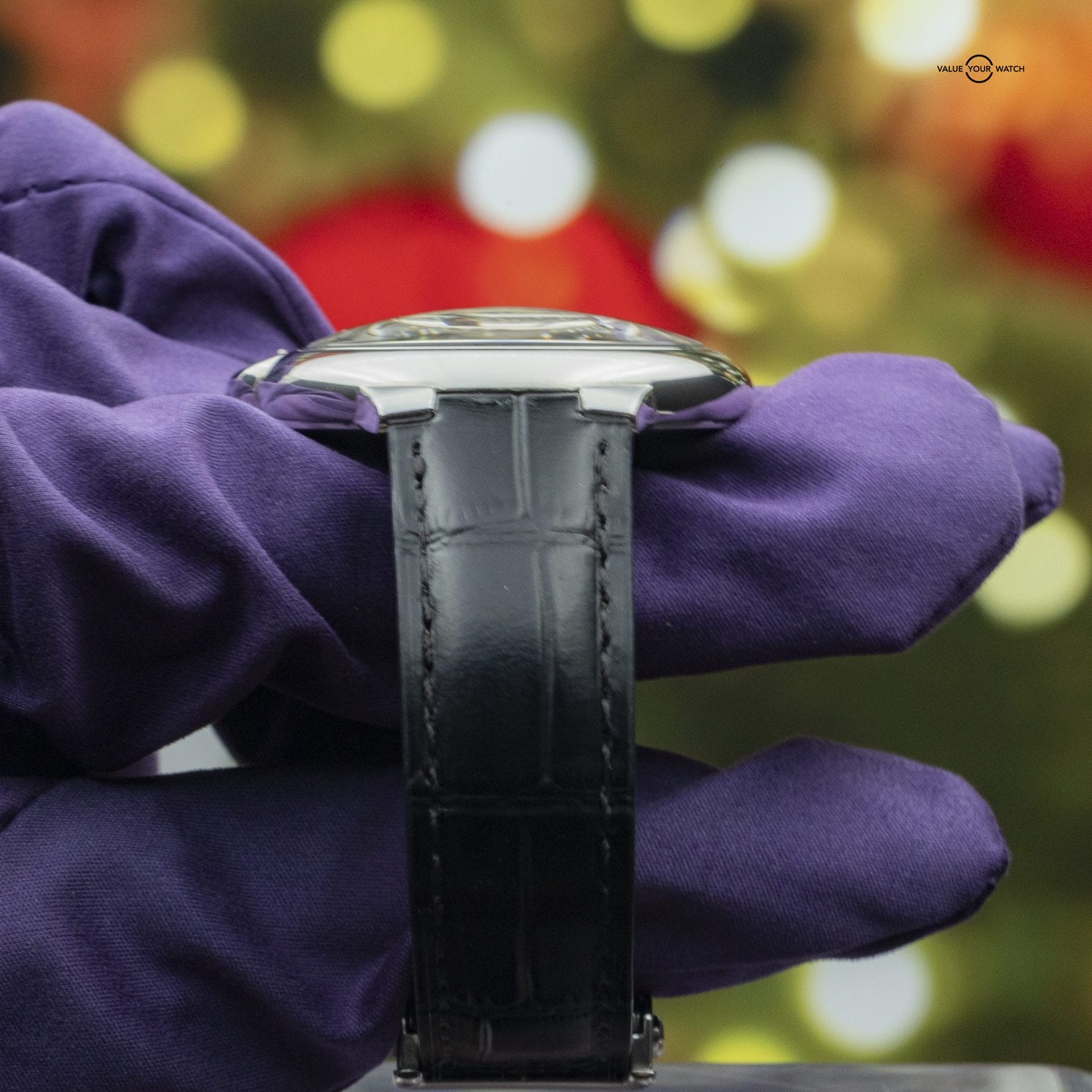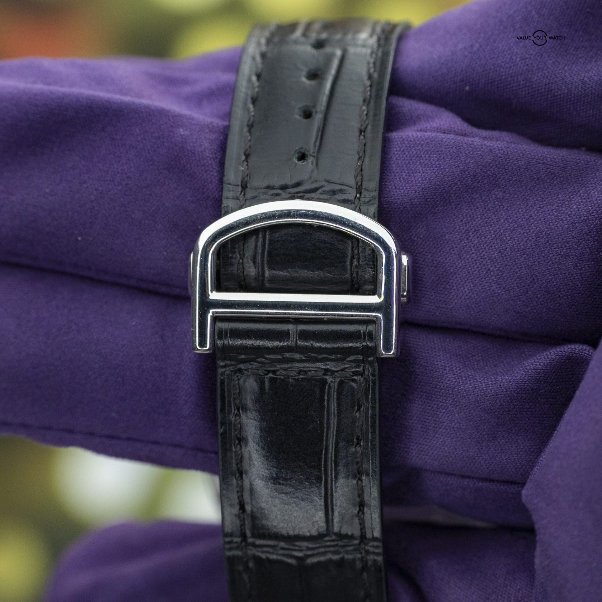 Excellent condition. Stainless steel case shows no notable marks throughout. Polished bezel excellent with no scratches. Sapphire crystal clear without scratches or chips. Signature sapphire cabochon crown in excellent condition. Silver guilloché dial pristine with no fading or moisture damage—the hand-engraved pattern remains sharp and beautiful. Movement running accurately with date function operating correctly. Black leather strap with crocodile embossing shows light wear around clasp area from occasional use, which is normal and expected for leather straps—rest of strap in excellent condition. Cartier buckle excellent. Complete original presentation set included.