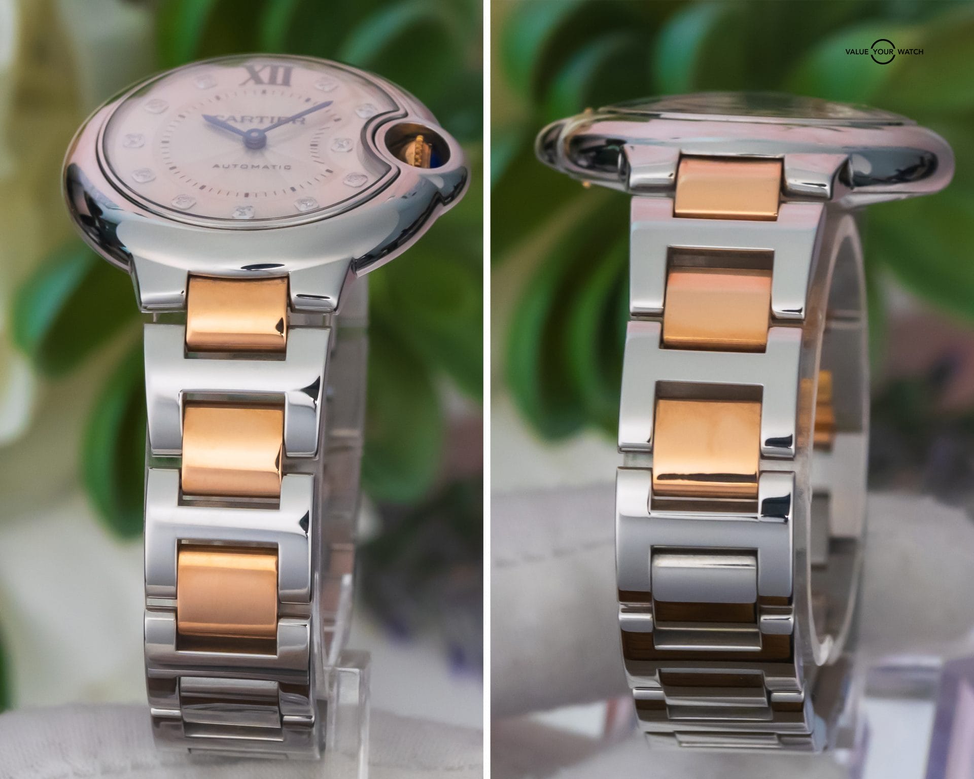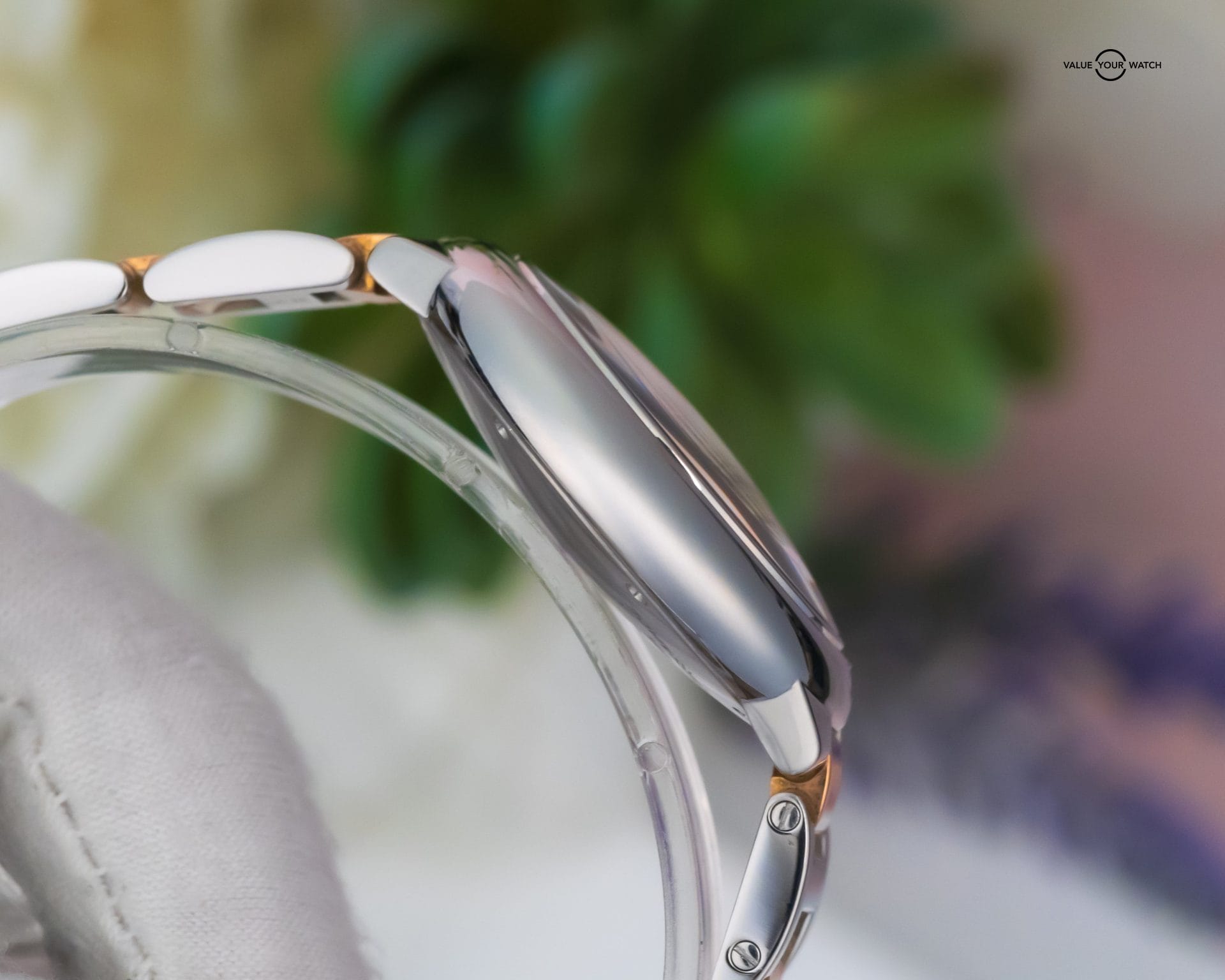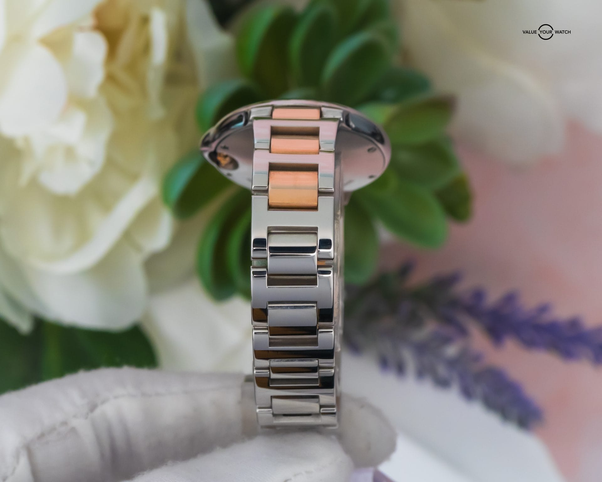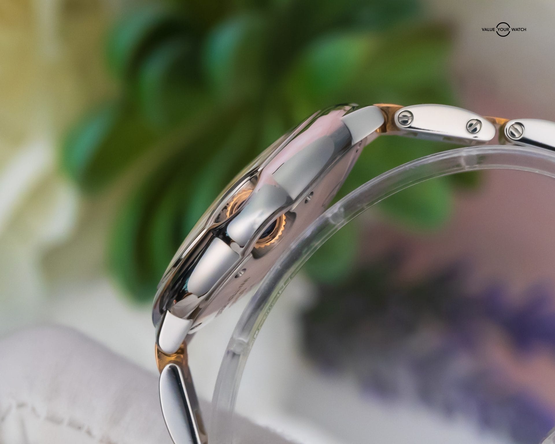 The Ballon Bleu de Cartier is one of the most iconic ladies’ watches ever created, effortlessly merging fine jewelry and horology. This two-tone version brings warmth and sophistication with its 18kt rose gold accents. The polished inner links and cabochon-set crown create a luxurious contrast against the cool steel case while The softly rounded profile, diamond hour markers, and blued-steel sword hands form a graceful composition that feels refined, feminine, and unmistakably Cartier.