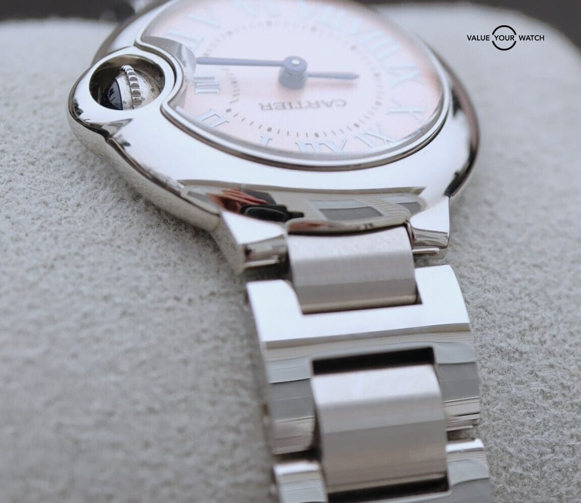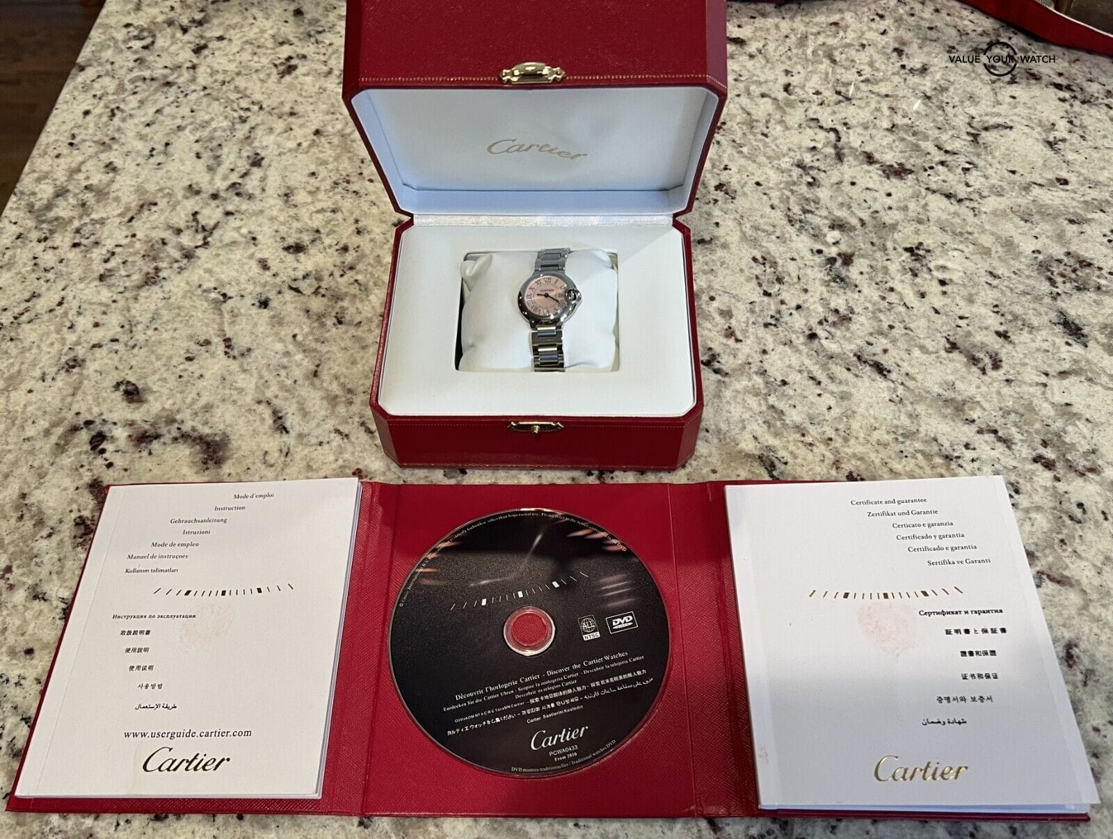 Cartier Ballon Bleu Pink Dial 28mm Boxes/Papers This set comes complete with the original Box & Paperwork. The watch is in nice pre-owned condition with very minimal cosmetic wear throughout. It is rare to find this pink dial combination and as a nice complete set. The original owner spent $5,100 + tax on this timepiece. Mechanically the watch is functioning as it should. Serial numbers & names are blurred in photos only for privacy reasons. I am happy to answer all questions about the watch. Just reach out to me via messages. I have many references in the watch world and am happy to provide as many as needed. Feel free to search my username “thegolferguy” in the Rolex Forums under the “Who’s Who” section and see ample feedback.