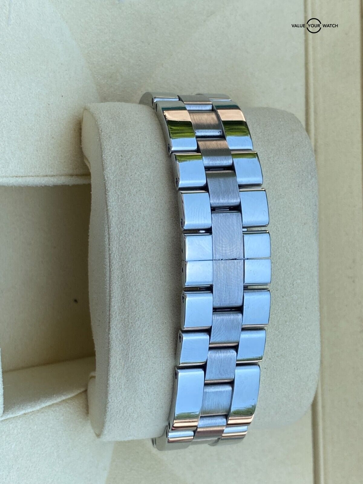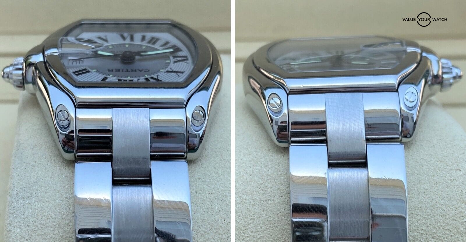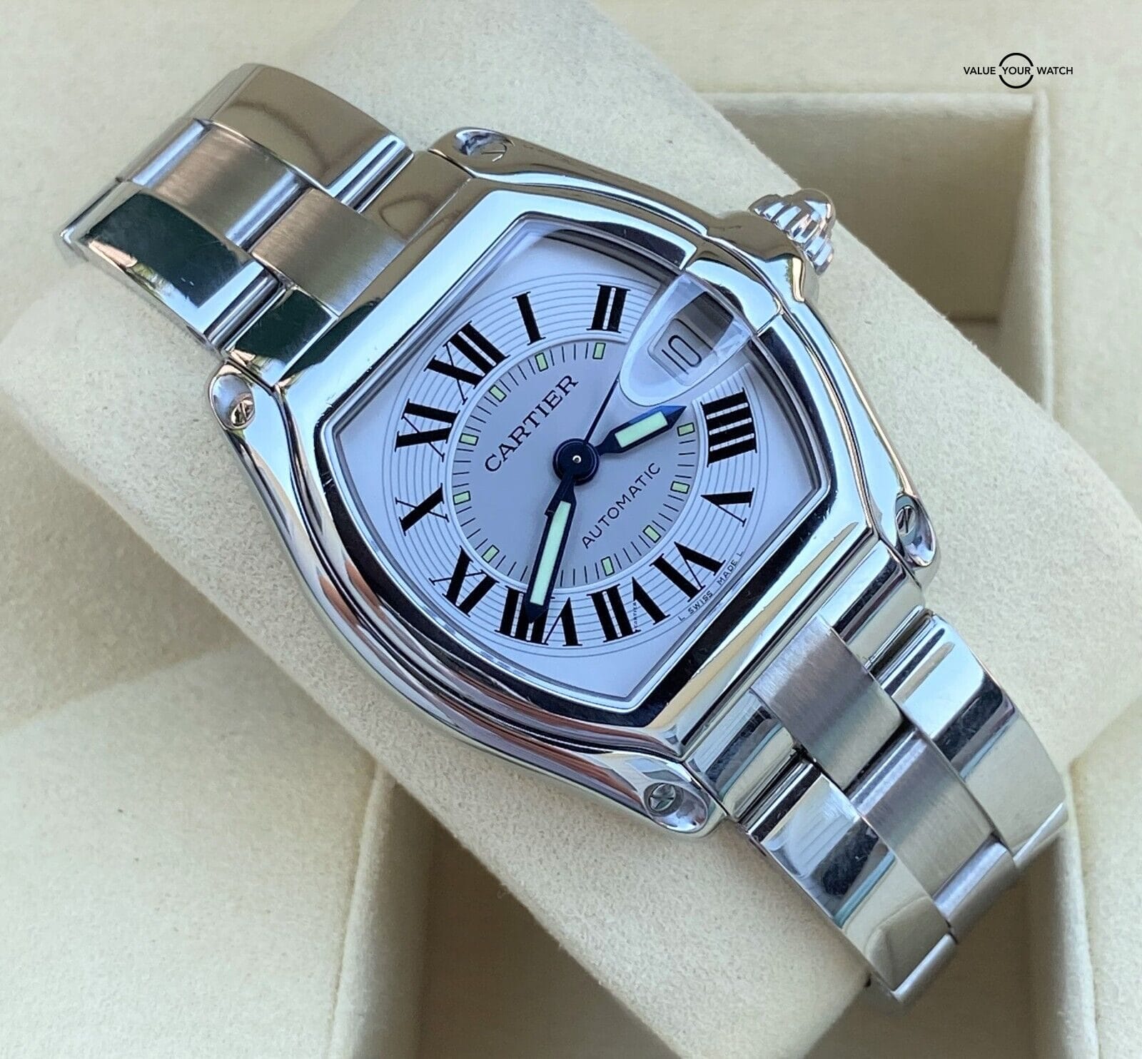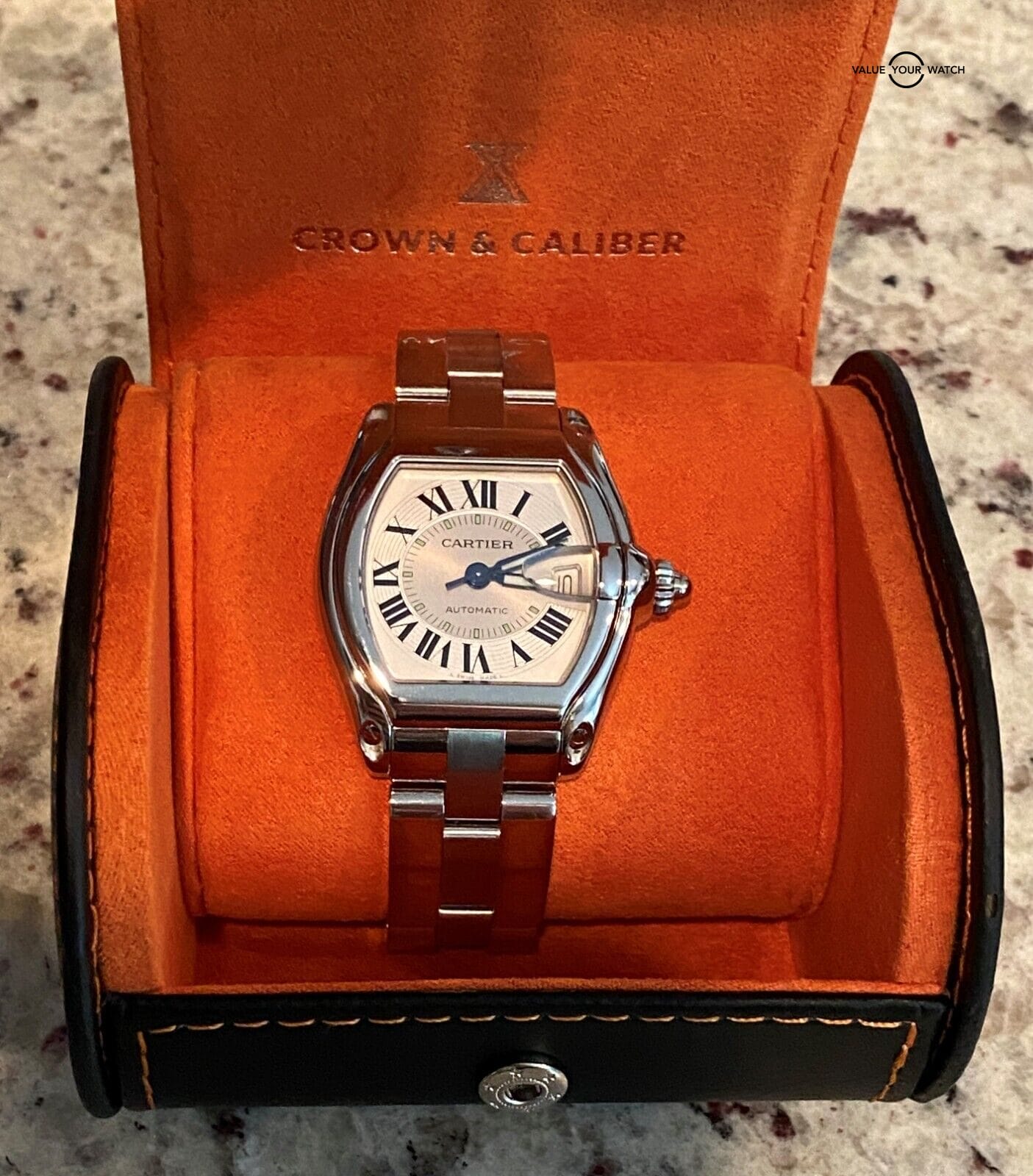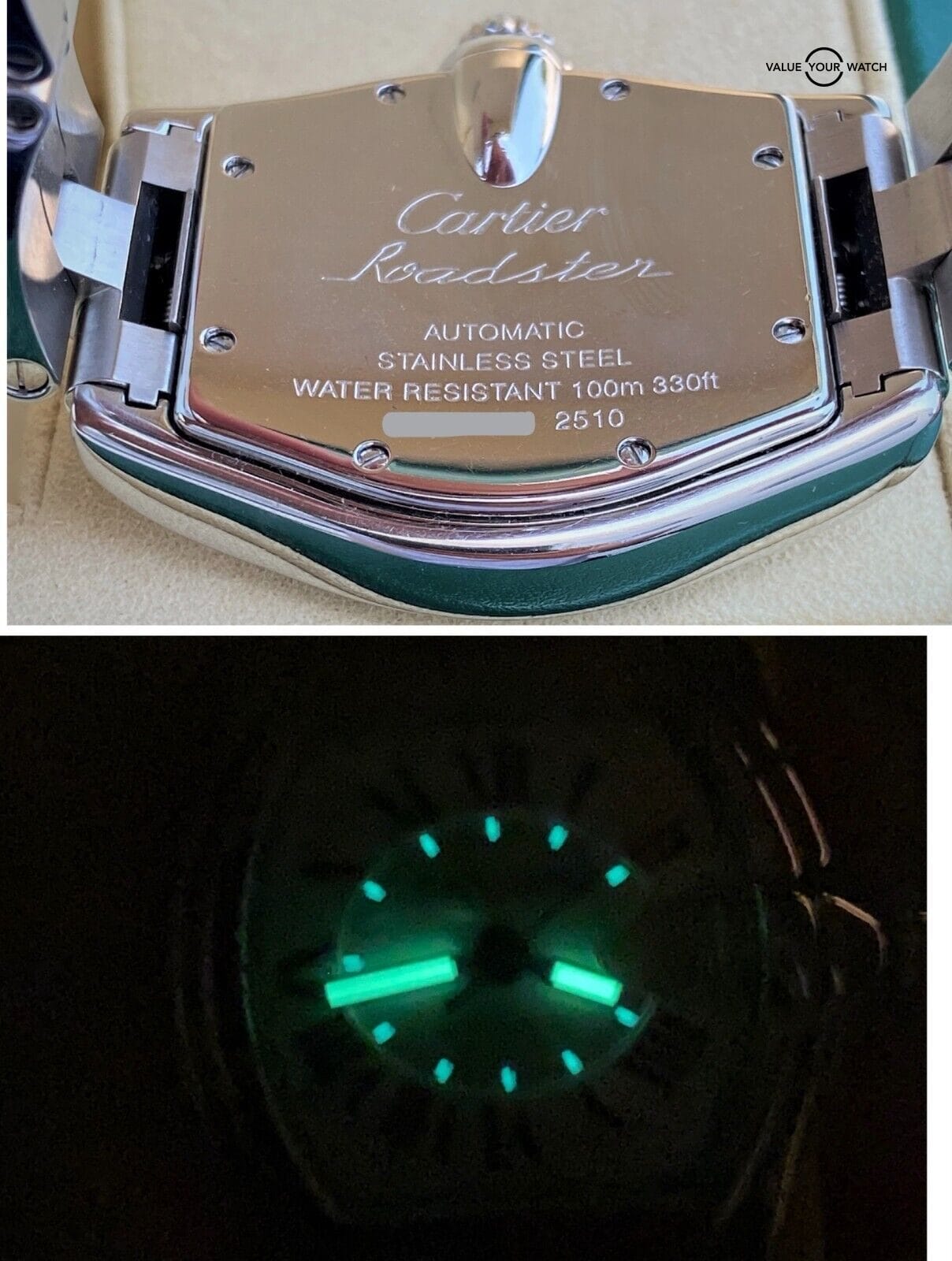 This is a watch only sale with the crown & caliber box. The preowned Cartier Roadster ref. 2510 boasts a case that measures 37mm and features a slight curve that closely hugs the wrist for a supremely comfortable hold. Additionally, the case wears on a supple multi-link bracelet that wraps nicely around the wrist and features a very distinctive large crown and bold silver dial topped with the brand’s signature tall Roman hour markers. Central hands filled with lume create an easy reading in most environments, and the date is displayed at the 3-hour marker beneath a magnifying lens. The bracelet has the quick strap change system as well which allows you to change without any tools. The watch was worn and shows some minor signs of wear throughout. Please pay close attention to the pictures as it accurately describes condition. The watch has a very healthy amount of links and will accommodate just up to a 8” wrist. Mechanically the watch is functioning as it should. Serial numbers and names are blurred in photos only for privacy reasons. I am happy to answer all questions about the watch. Just reach out to me via messages.