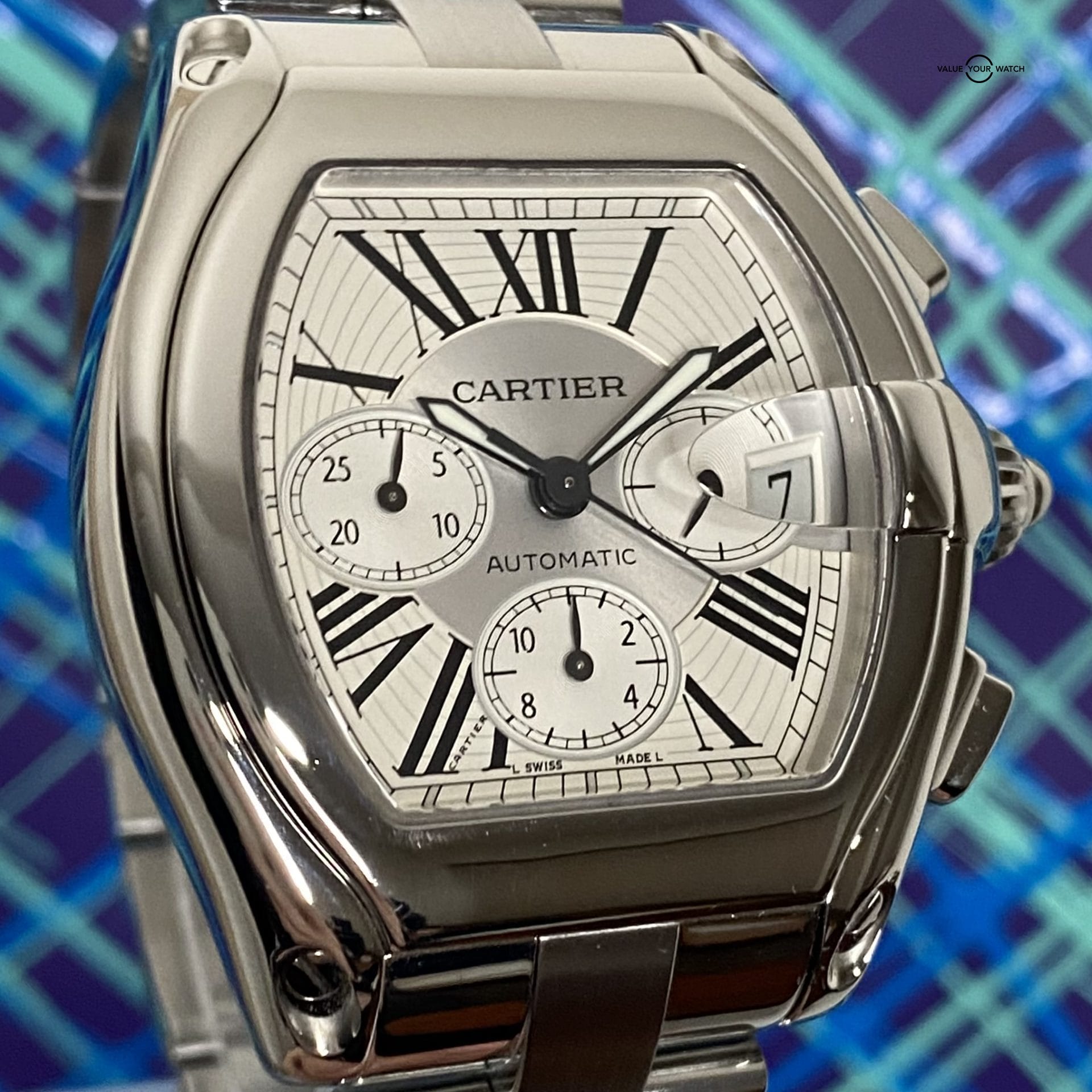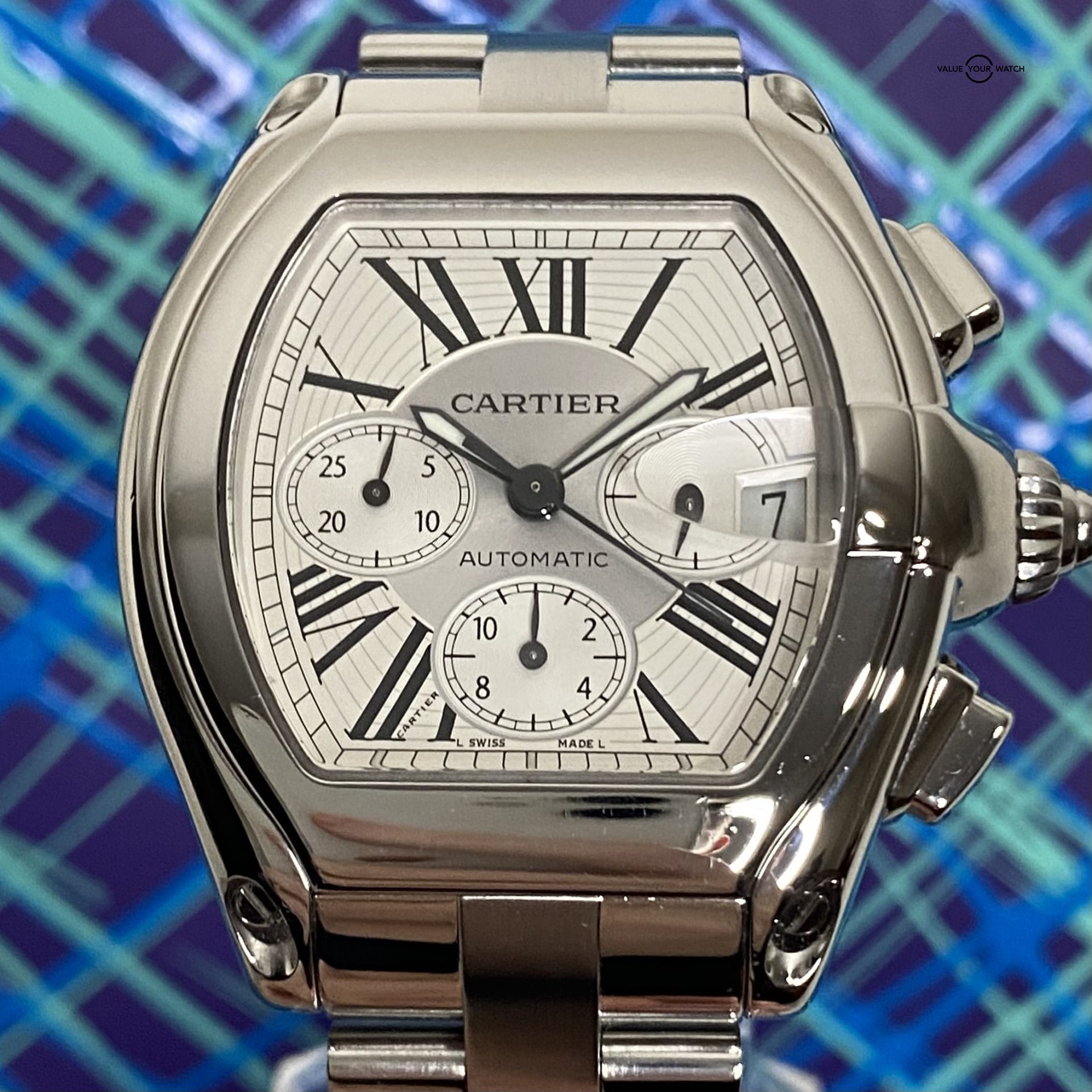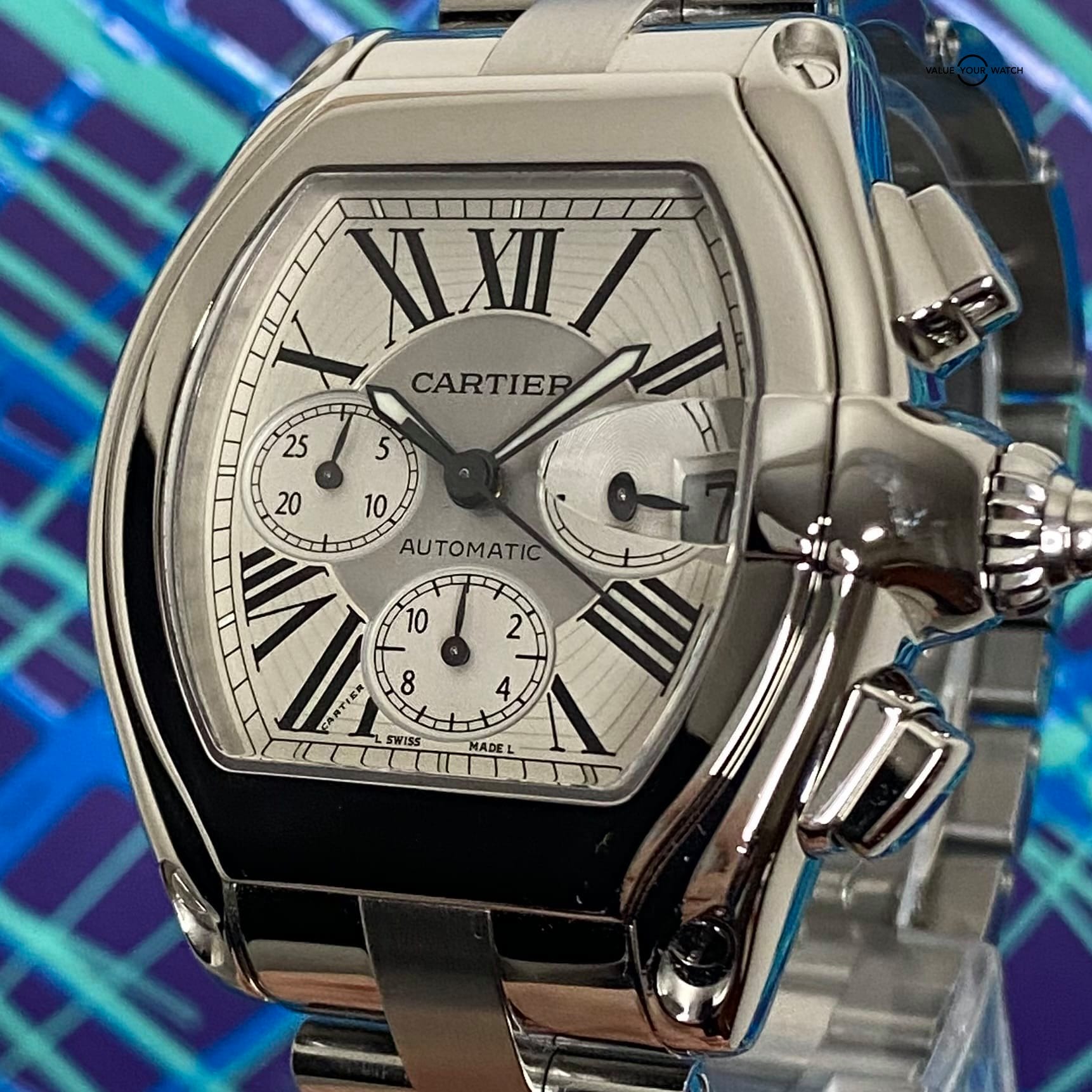 The Cartier Roadster XL chronograph W62019X6 in beautiful stainless steel.