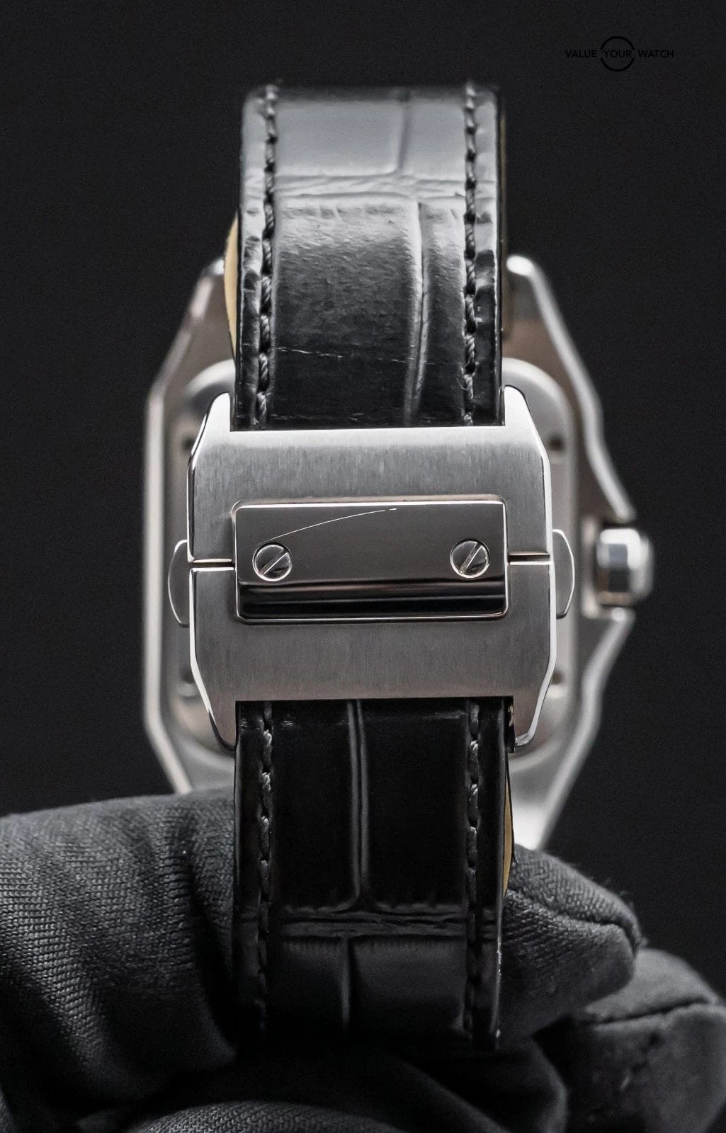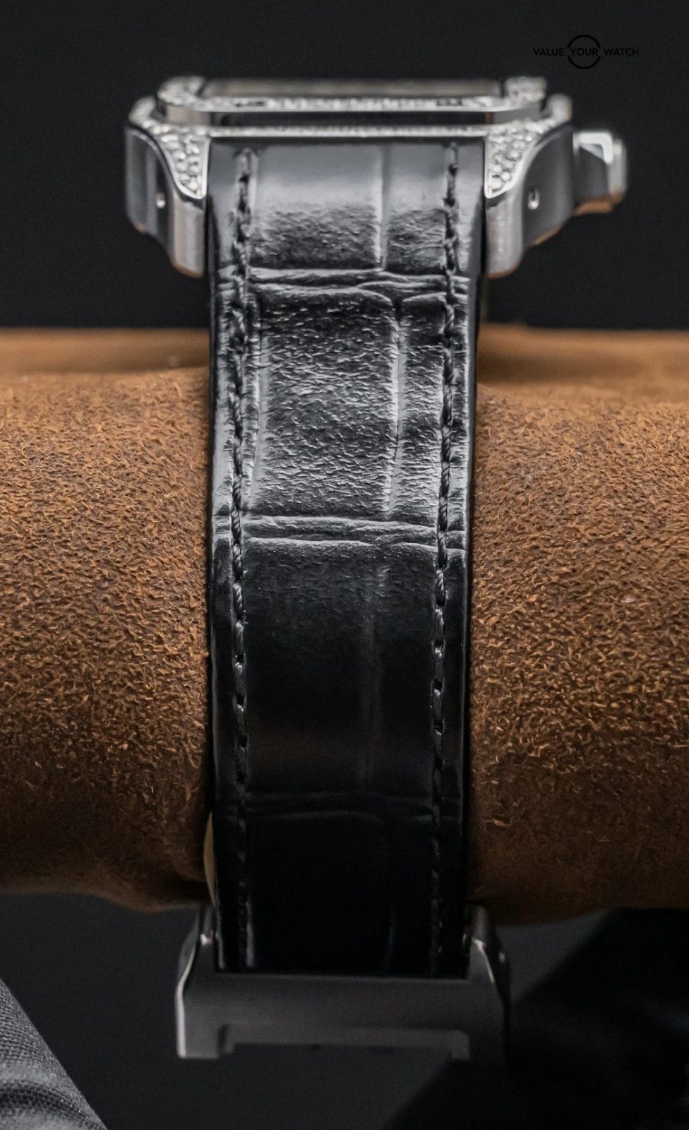 STRIKING Cartier Santos 100 Medium Model Midsize in Stainless Steel with Silver Dial on Black Cartier Alligator Strap! Stunning watch with the Custom Diamond Setting at a solid price point. Very versatile size whether worn by women or as a smaller piece for guys. This piece is simply classy and iconic!