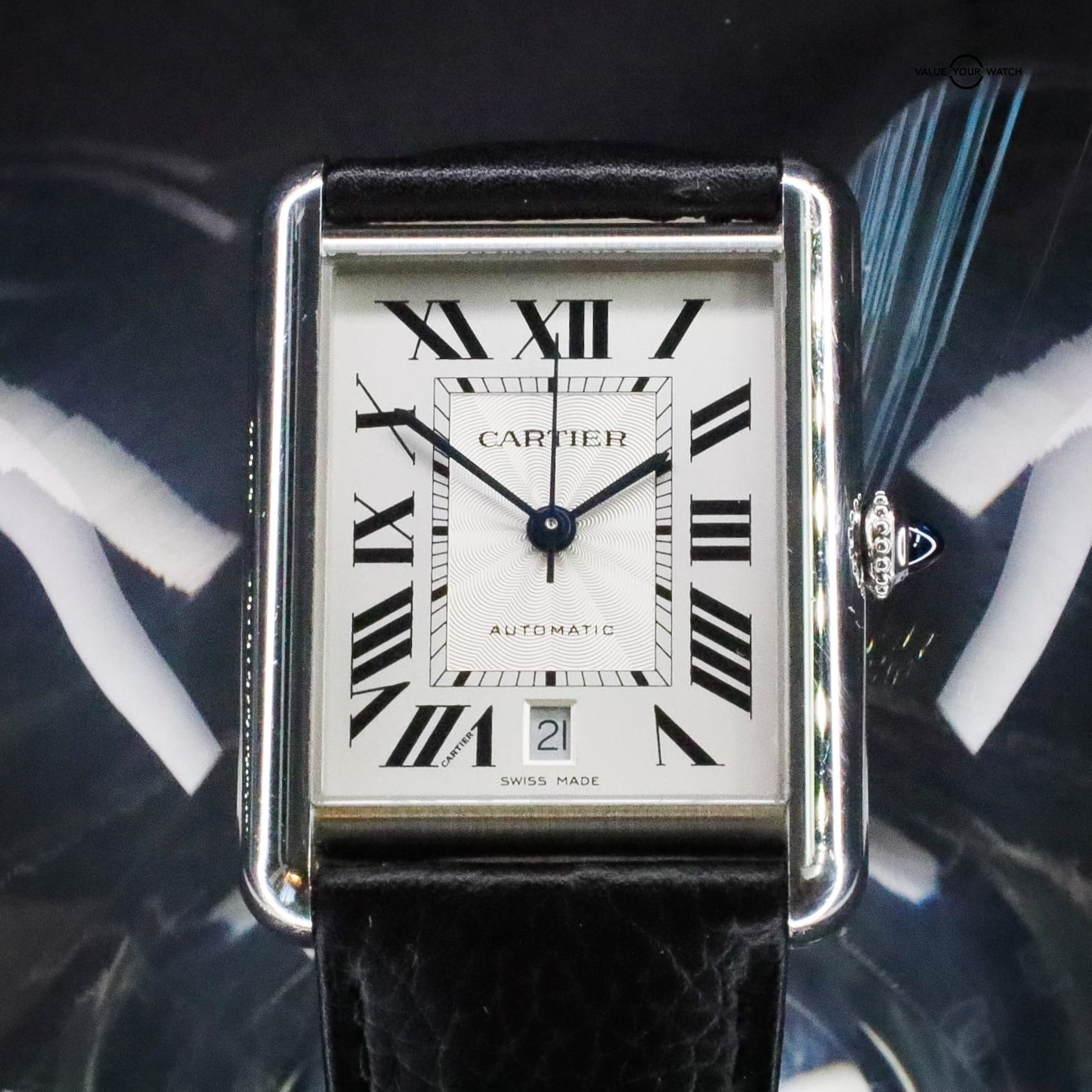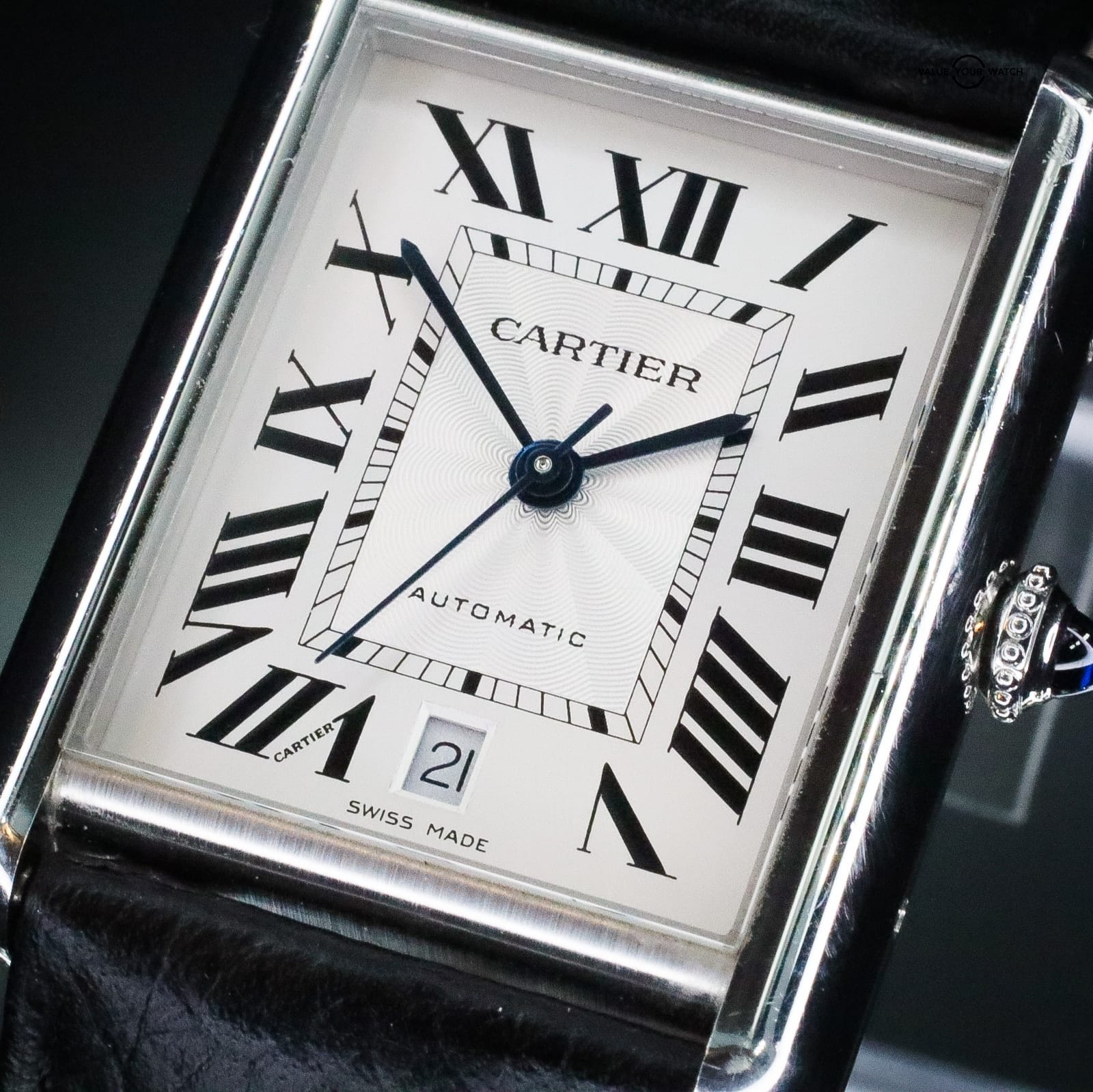 Offered here is a beautiful 2022 Cartier Tank Must (Ref. WSTA0040) featuring a silvered flinqué dial with a sunburst guilloché pattern at the center, complemented by classic Roman numerals, blued steel hands, and a date function — a timeless design that defines understated elegance.