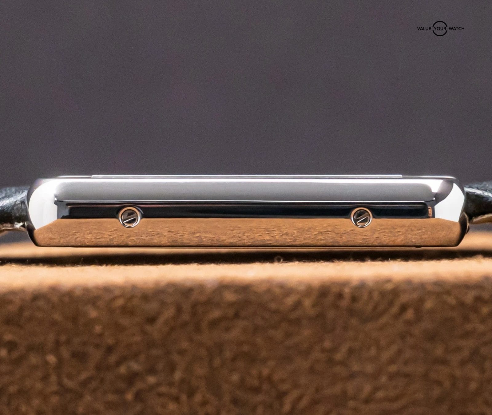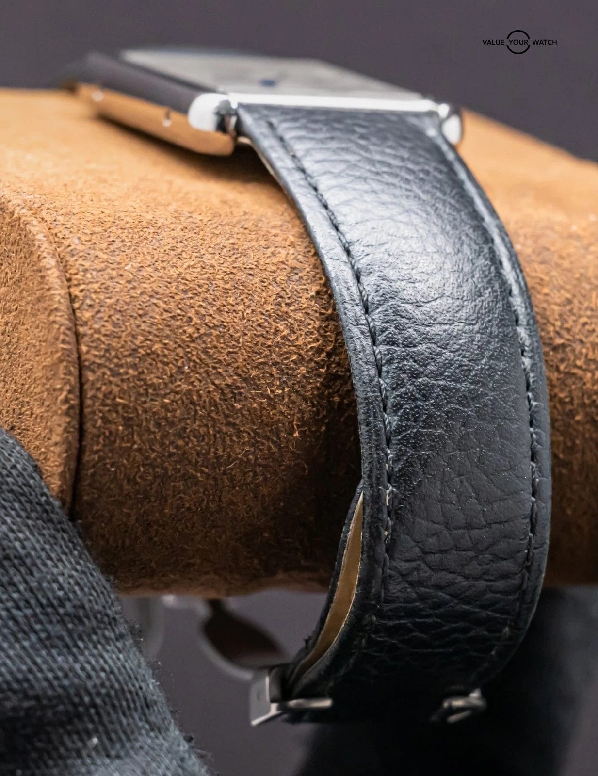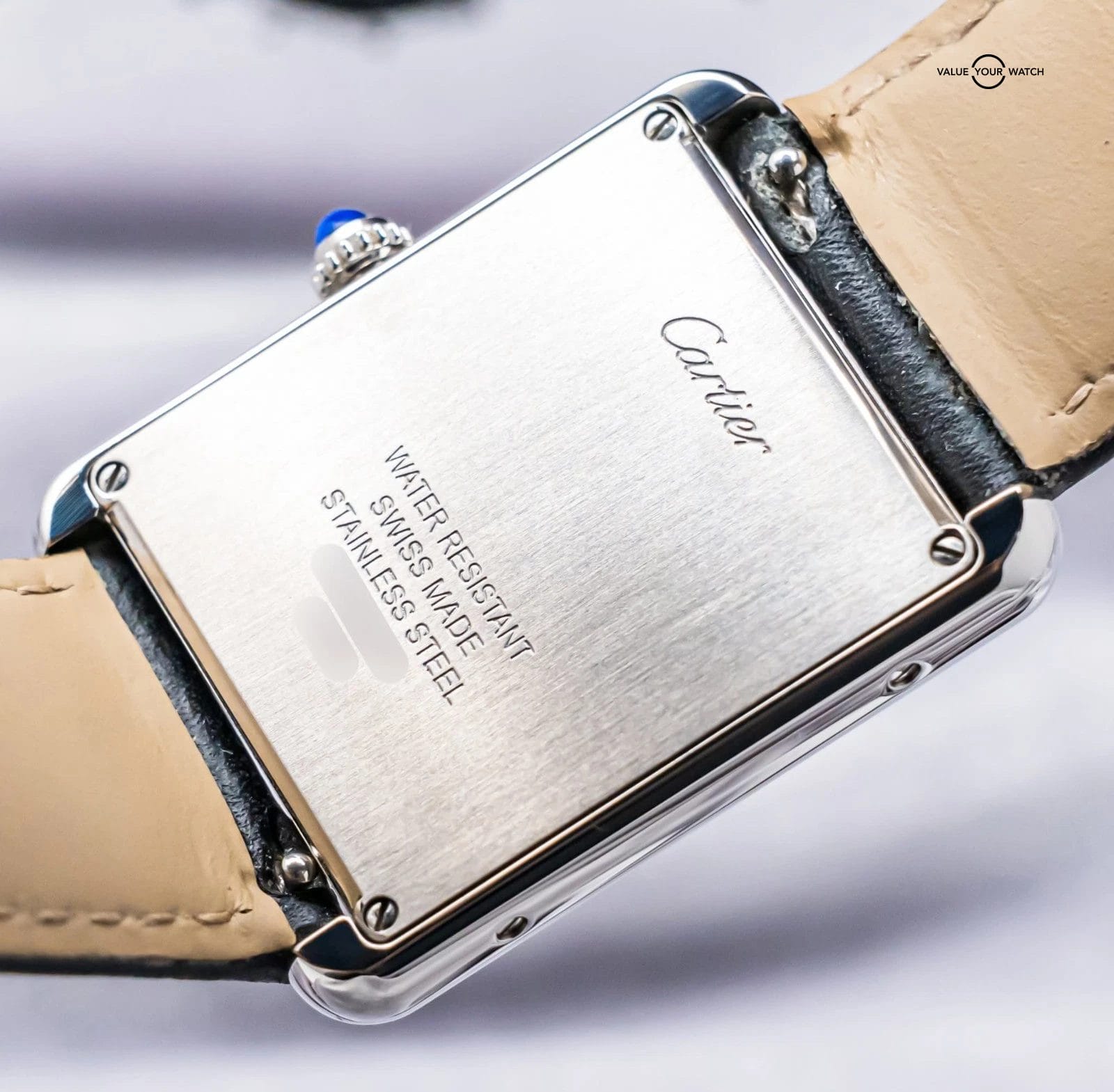 STRIKING Cartier Tank Solo Large Model 35 mm in Stainless Steel with Silver Dial on Black Cartier Leather! Arrives as watch only and was originally sold at Cartier in November 2019. This Tank Solo is a classic and iconic piece, one of the most popular pieces ever made for women!
