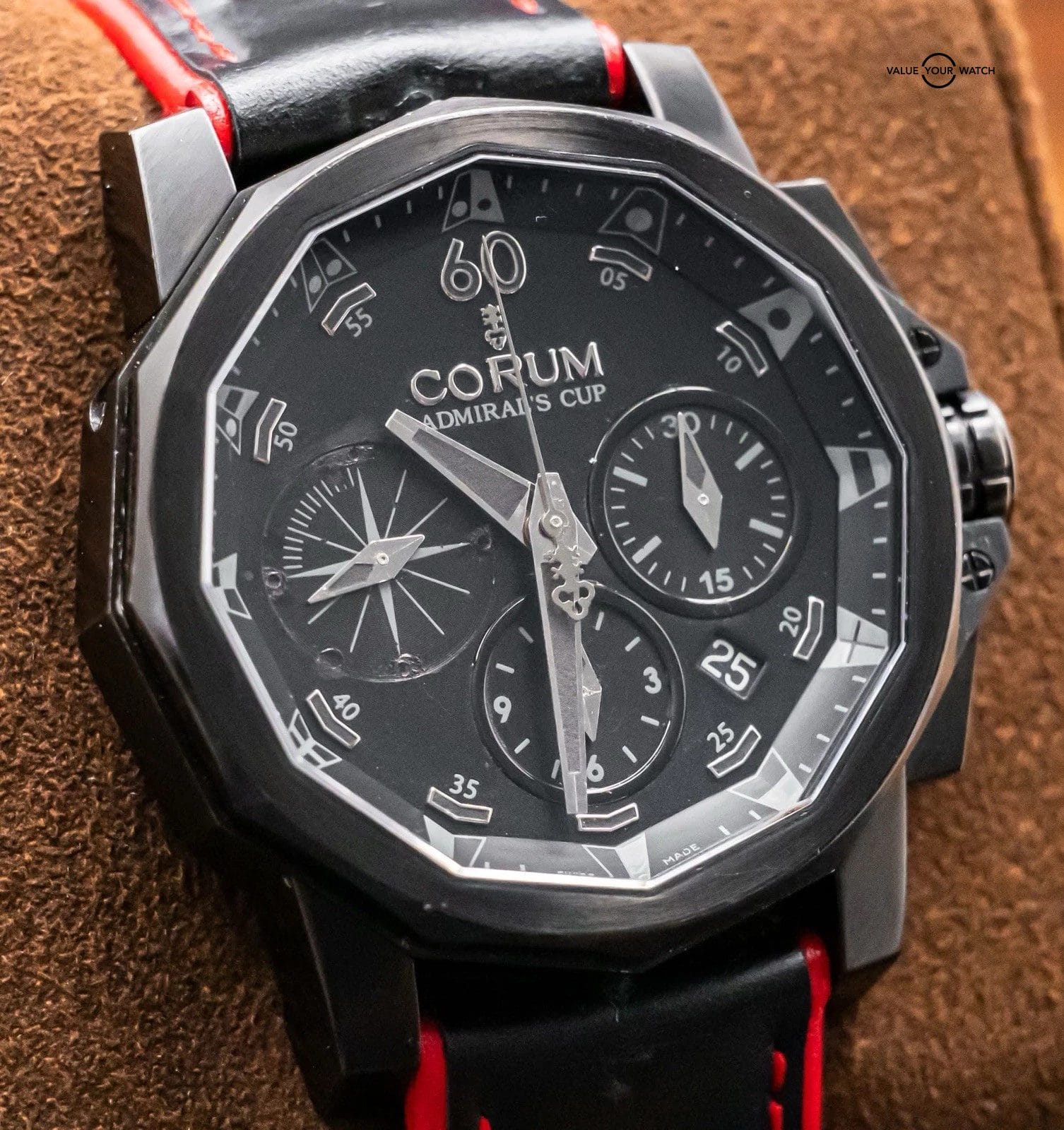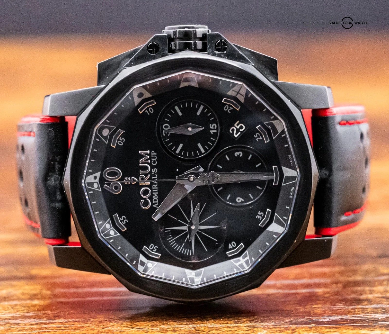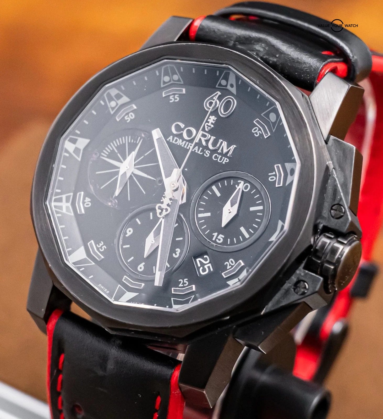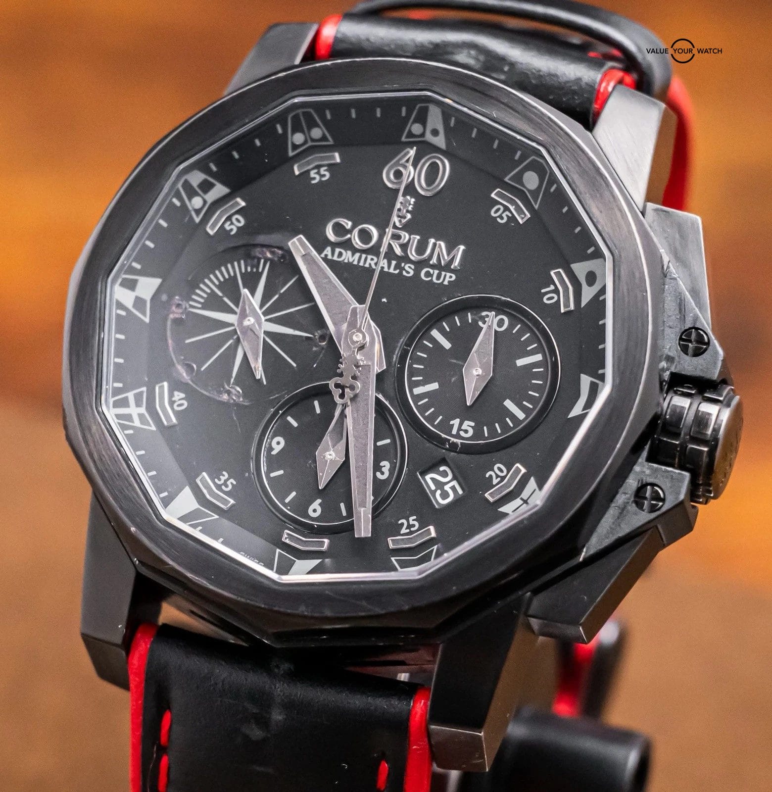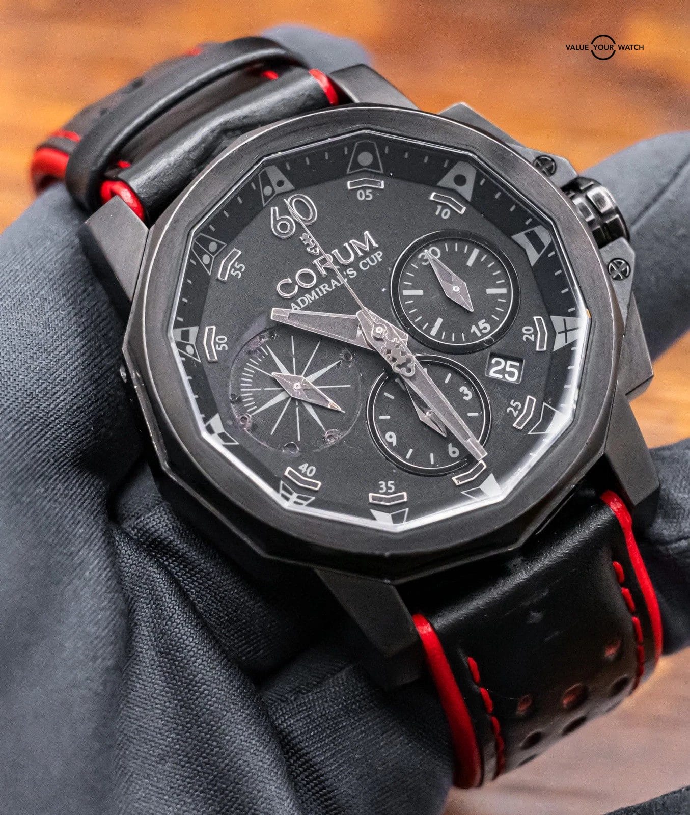 STRIKING Corum Admiral’s Cup 44 mm in Stainless Steel PVD with Black Dial on Aftermarket Black & Red Leather! Arrives as watch only and was recently FULLY SERVICED at my watchmaker in April 2025, a huge value-add. A lot of value for the money and is stunning on wrist!