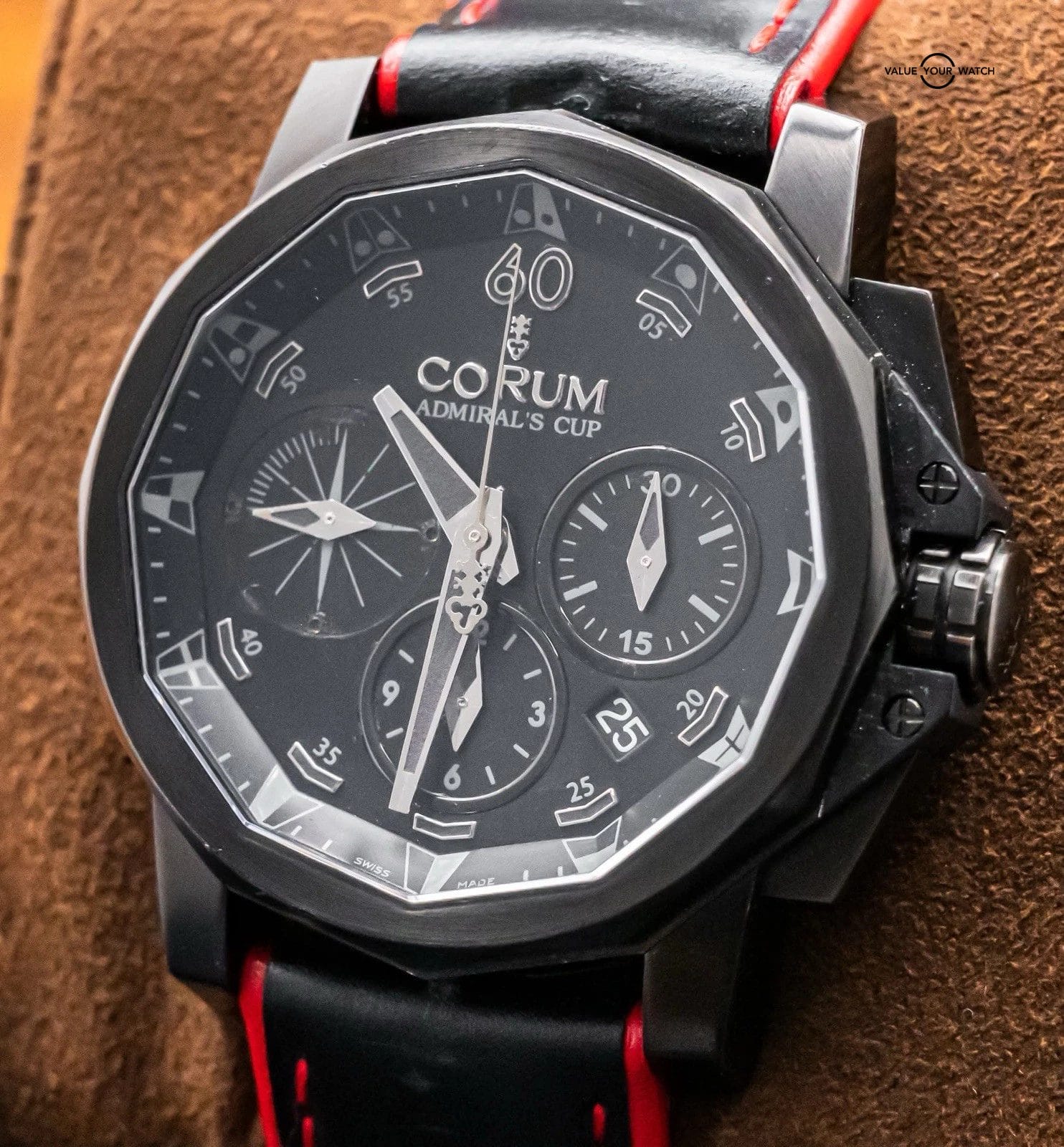 Specification: Corum Admiral’s Cup 44 mm PVD Stainless Steel Black Dial Chronograph 01.0007