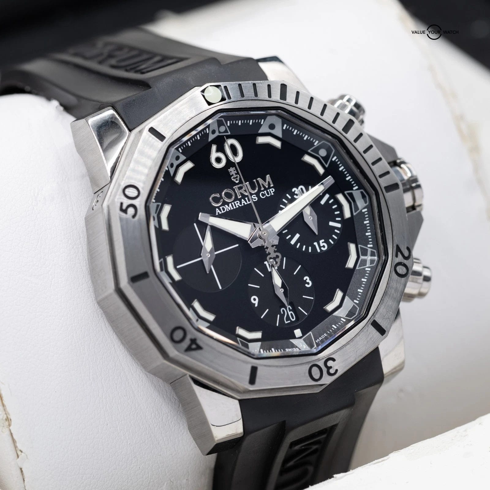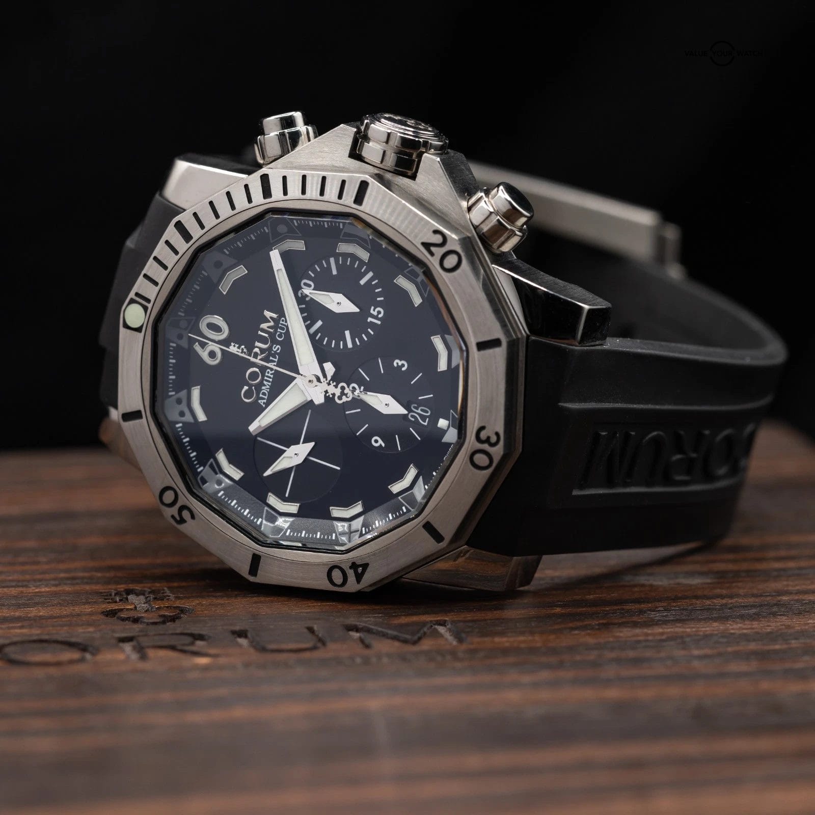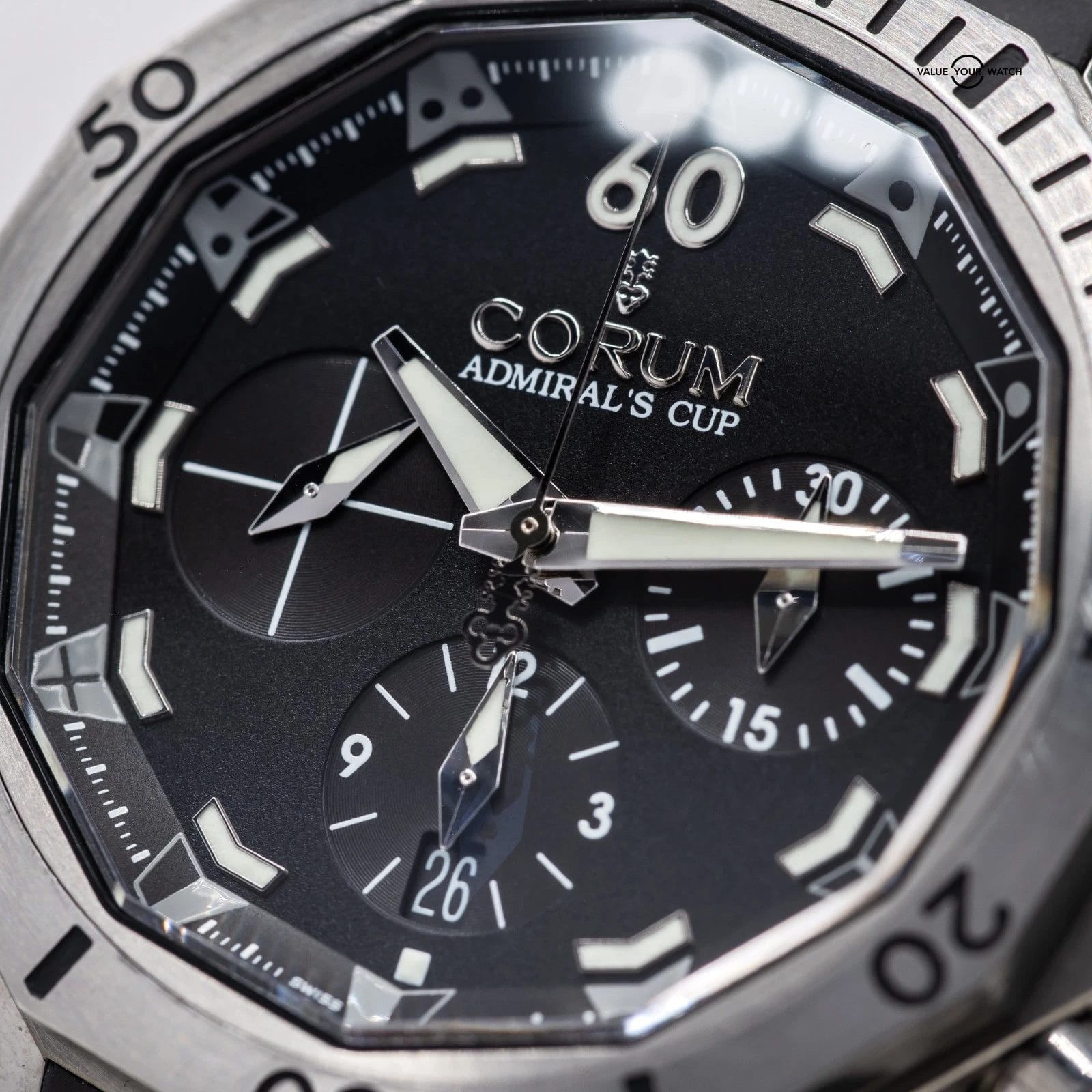 Up for sale here is an amazing example of the Corum Admiral’s Cup, cased in solid titanium, this one feels absolutely fantastic on the wrist. Between the 12 sided bezel and the nautical flag indices, there really is no other watch that looks like this! Ref. 753.451.04/0371 AN22.
