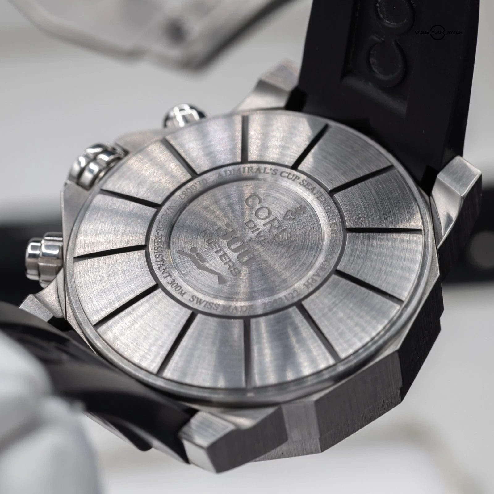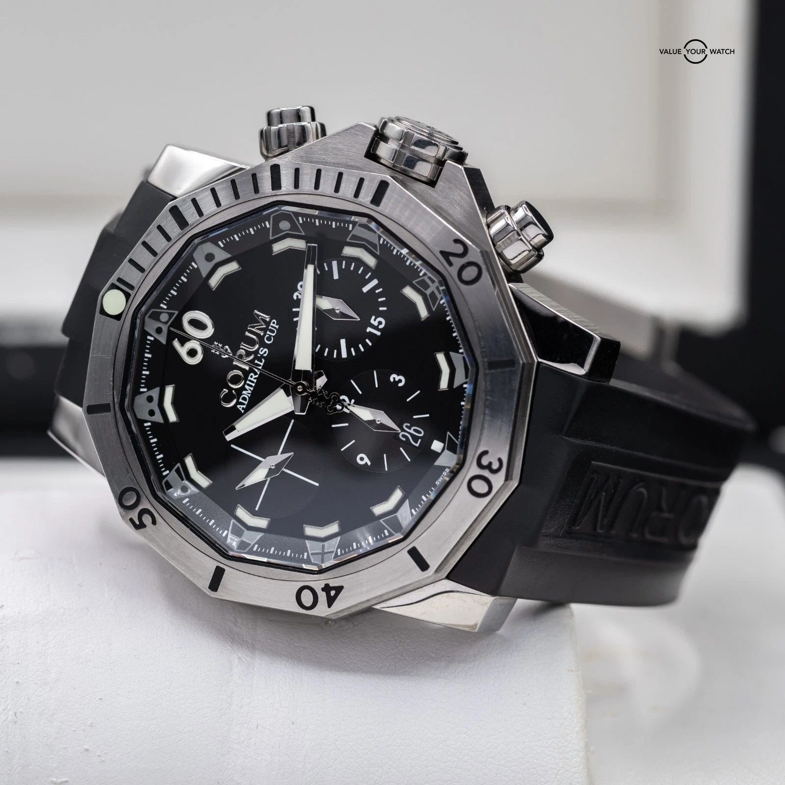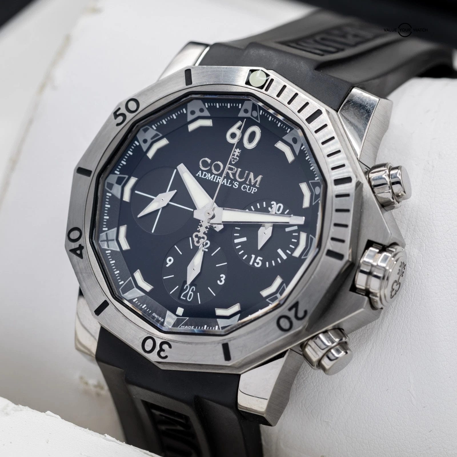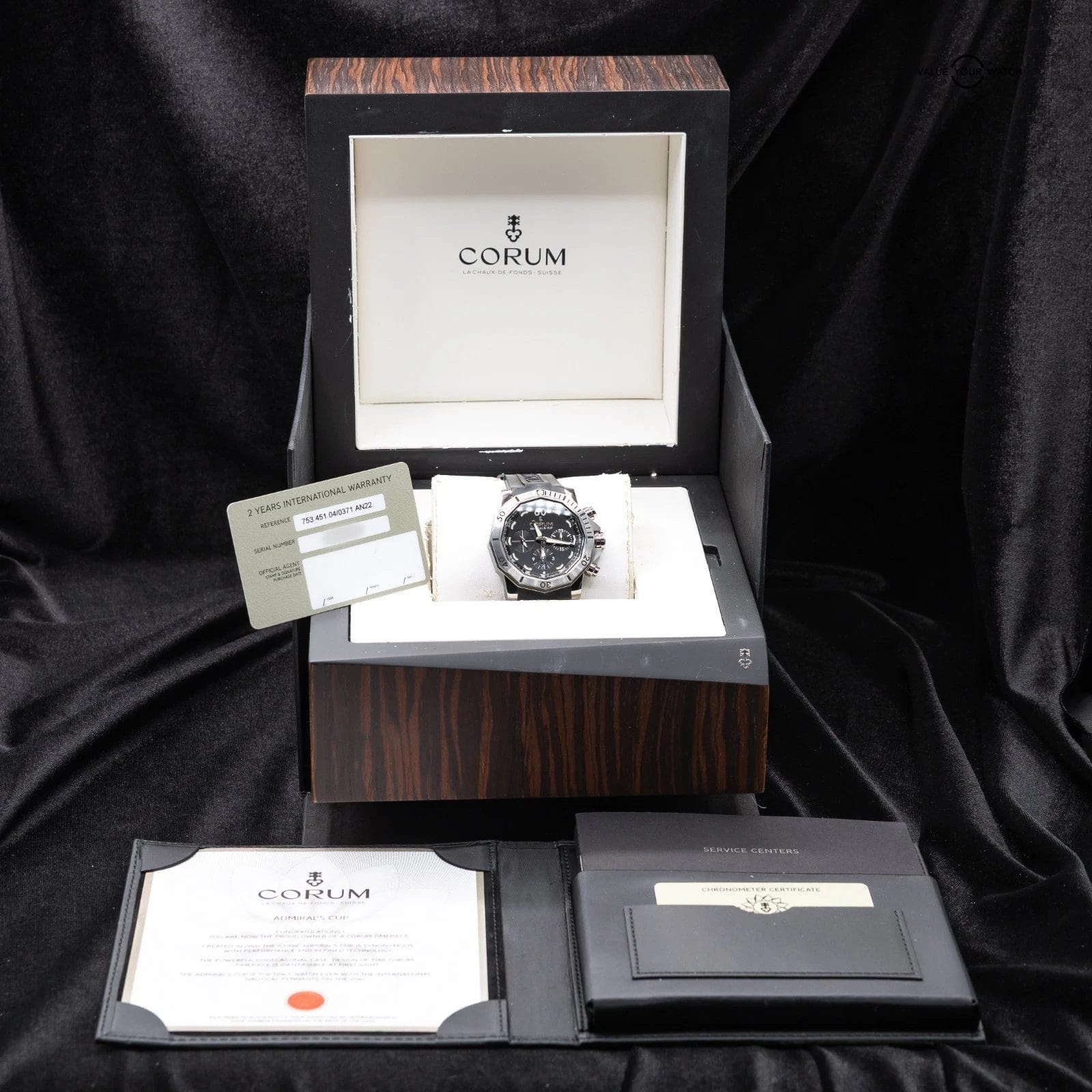 Up for sale here is an amazing example of the Corum Admiral’s Cup, cased in solid titanium, this one feels absolutely fantastic on the wrist. Between the 12 sided bezel and the nautical flag indices, there really is no other watch that looks like this! Ref. 753.451.04/0371 AN22.