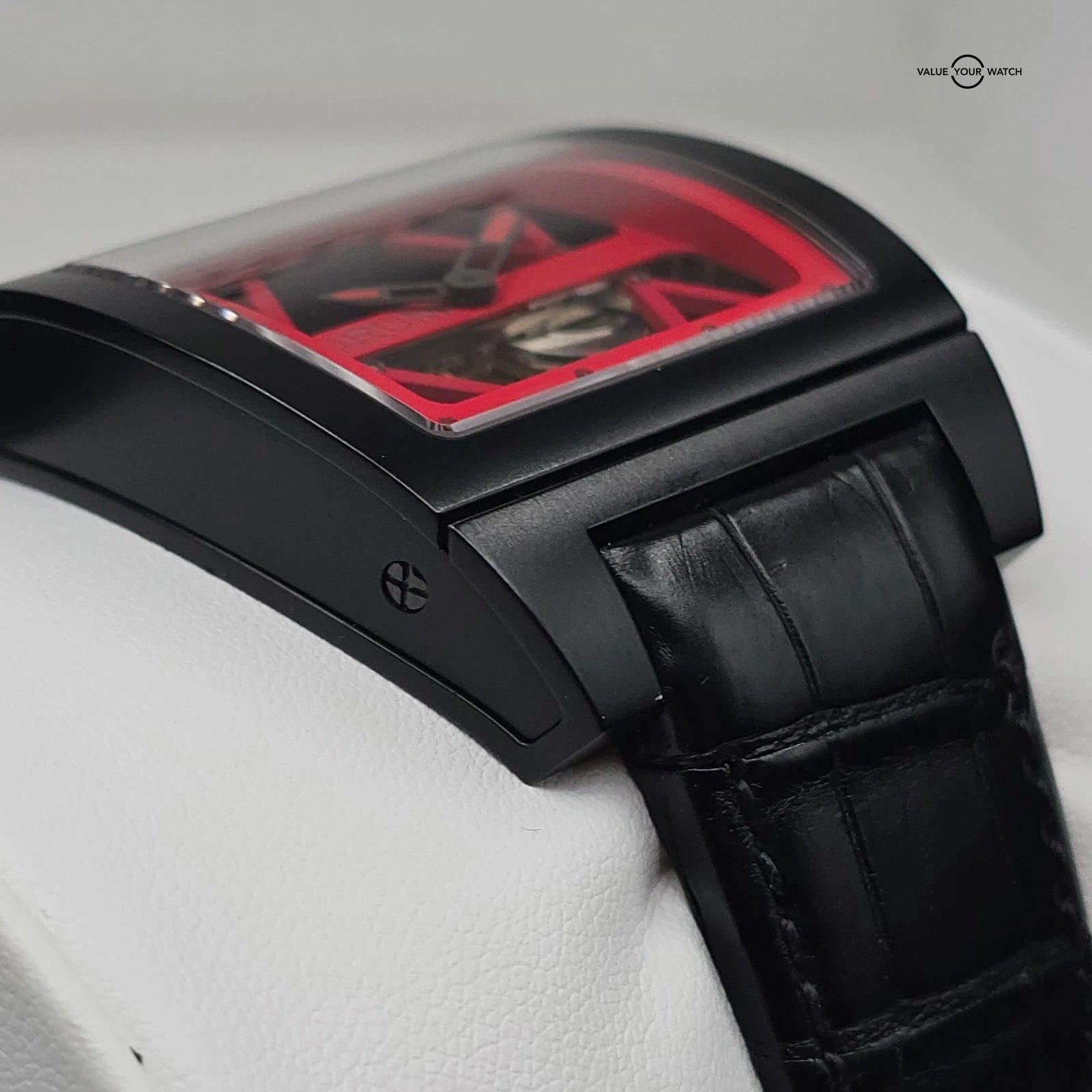 Up for sale here is a very interestingl watch that is not very often seen. The Corum Bridge gets it’s name from the shape of the movement, which is formed into a horizontal line across the case. The balance wheel, escapement, mainspring, etc- everything arranged neatly in a line and