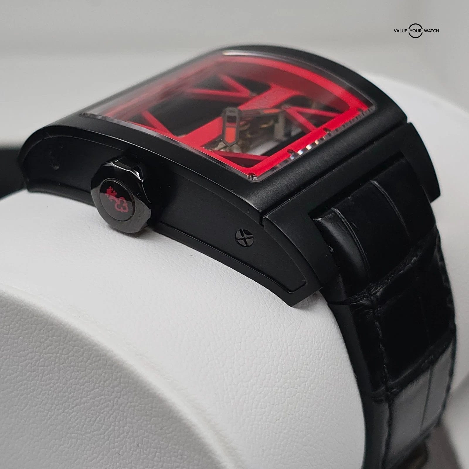The movement is supported in place by the two X’s- just like a suspension bridge! Very cool to see something unique like this incorporated within the function of case and movement.