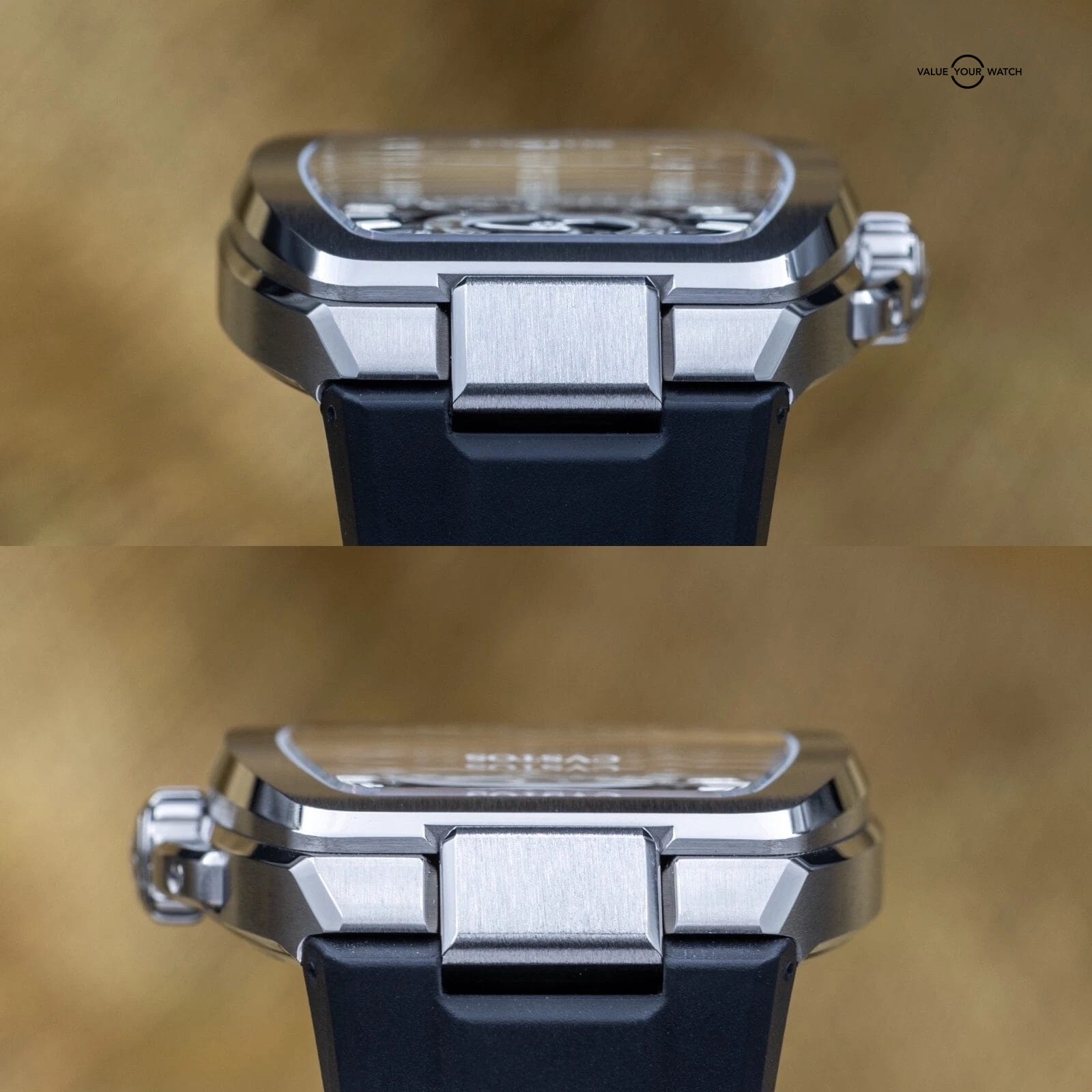 With the Metropolitan PS, the highly skilled artisans at CVSTOS have developed an innovative diamond polishing process that brings more depth and glow to the dial. Entirely manufactured in the CVSTOS ateliers, the guilloché pattern is endowed with remarkable precision and unparalleled shine. The piece also features a tool-free interchangeability, a patented system activated by a single push-piece integrated behind the lugs, that allows an easy swap between the Grade 5 Titanium bracelet and the rubber strap.