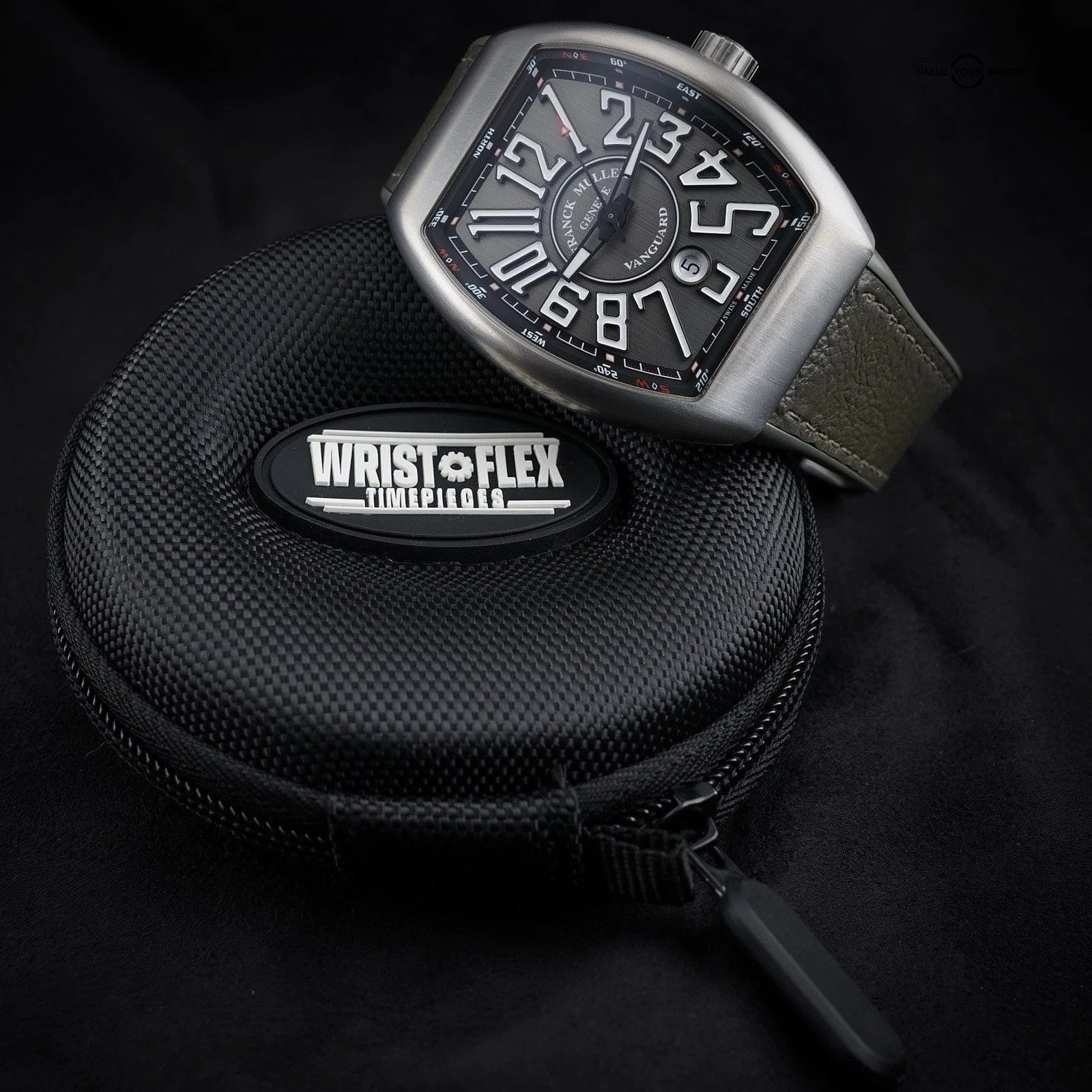 The Franck Muller Vanguard is known for its bold curved case architecture, modern sport-luxury presence, and exceptional wrist ergonomics. This titanium example with grey dial delivers strong visual impact while remaining lightweight and comfortable for daily wear.
