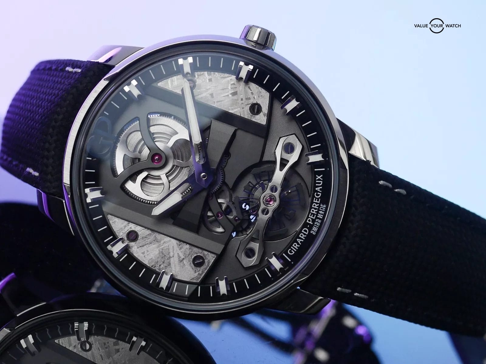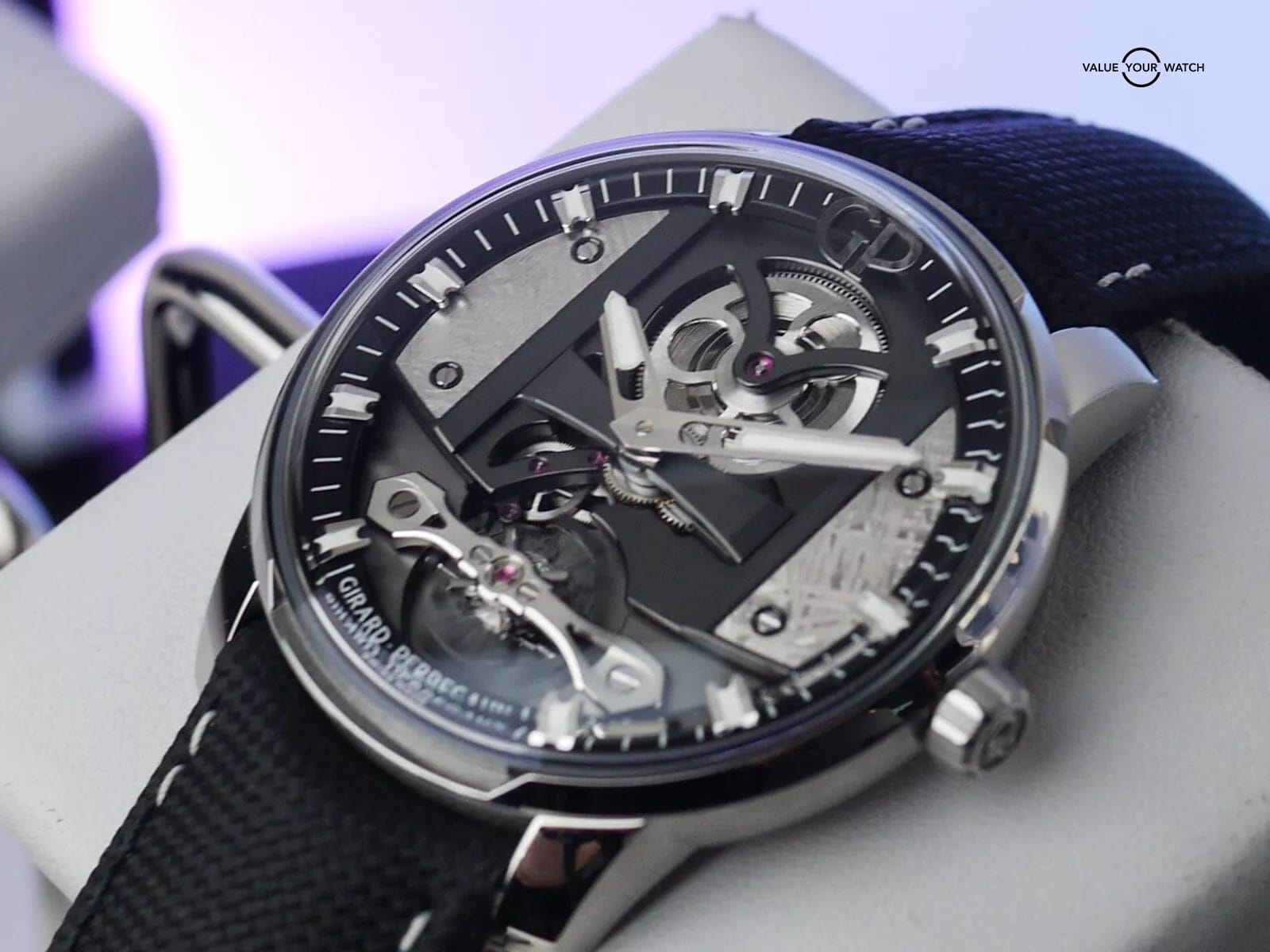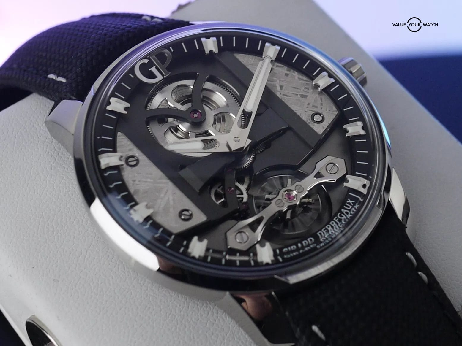 For sale here is an unworn example of GP’s Free Bridges. While the Free Bridges lineup is incredible in its own right, this one here incorporates two pieces of meteorite on each side of the dial, giving the whole timepiece a very exotic look.