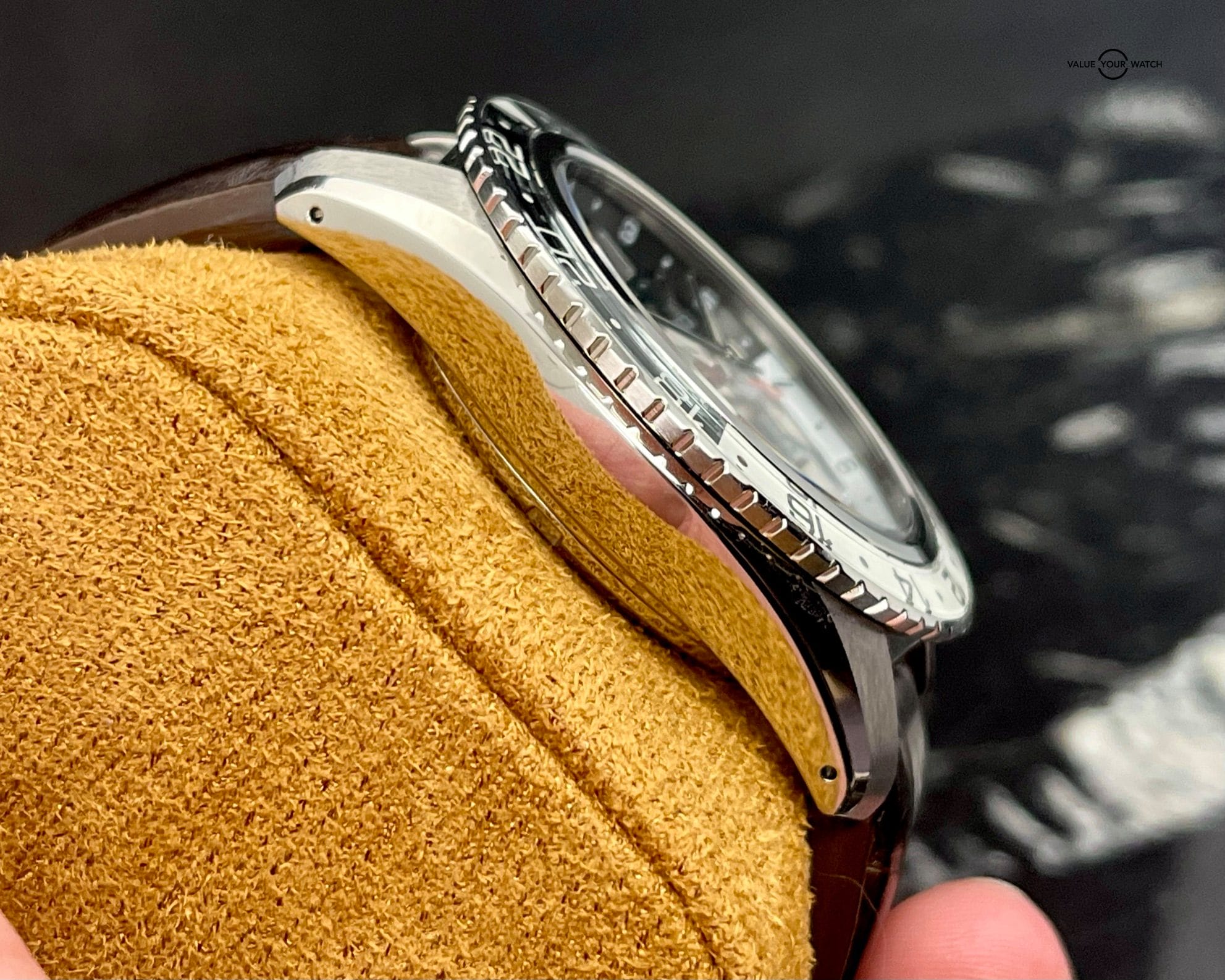 This watch comes with outer cover, outer cardboard box, inner box, microfiber cloth, hang tag, warranty booklet, sealed instruction booklet, and inspection certificate. The case has only minor blemishes, the alligator band is in great shape, the buckle has its share of desk dives, and the crystal and bezel are flawless. The original retail price of this watch was $6,600. Get this beautiful pre-owned time piece before it’s gone!