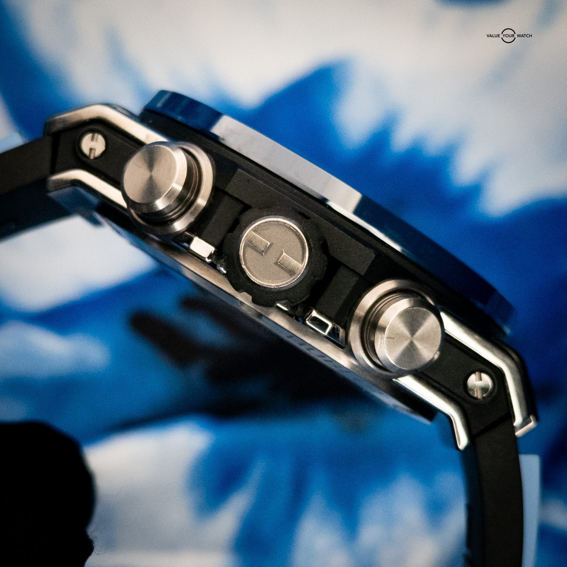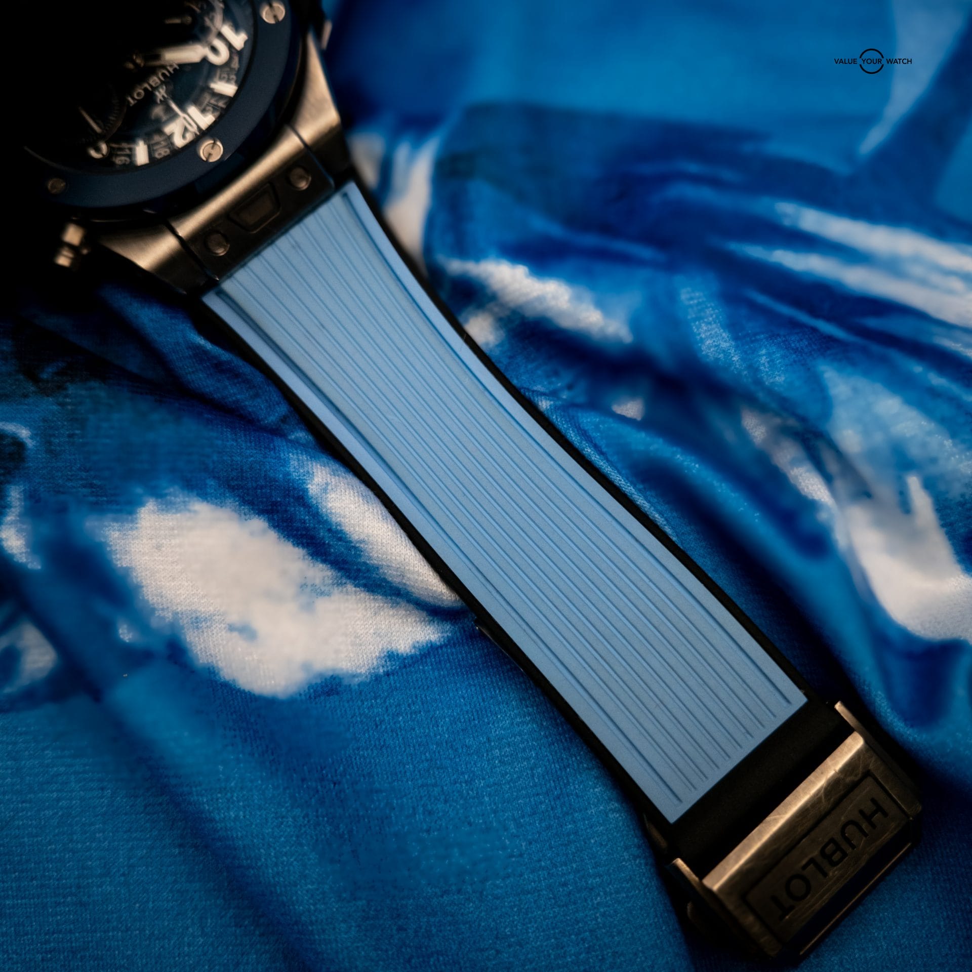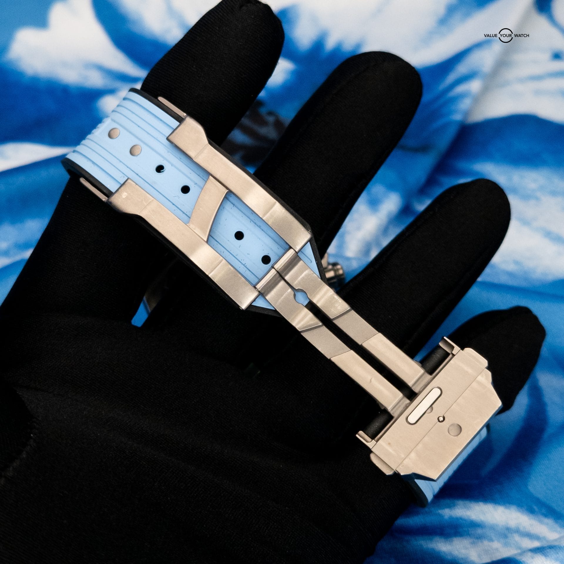 - Strap: Blue structured rubber strap with titanium & ceramic deployant clasp