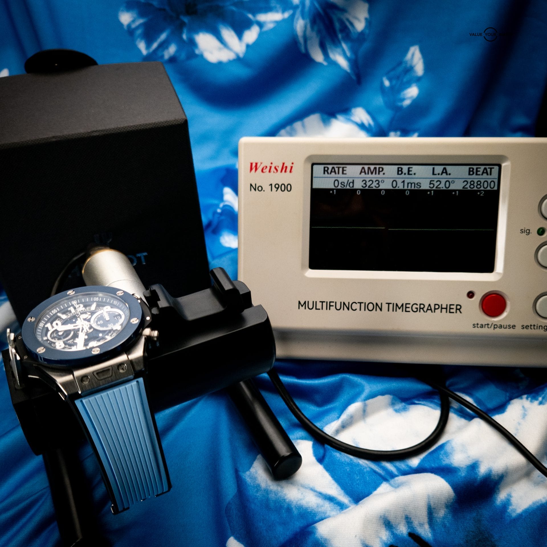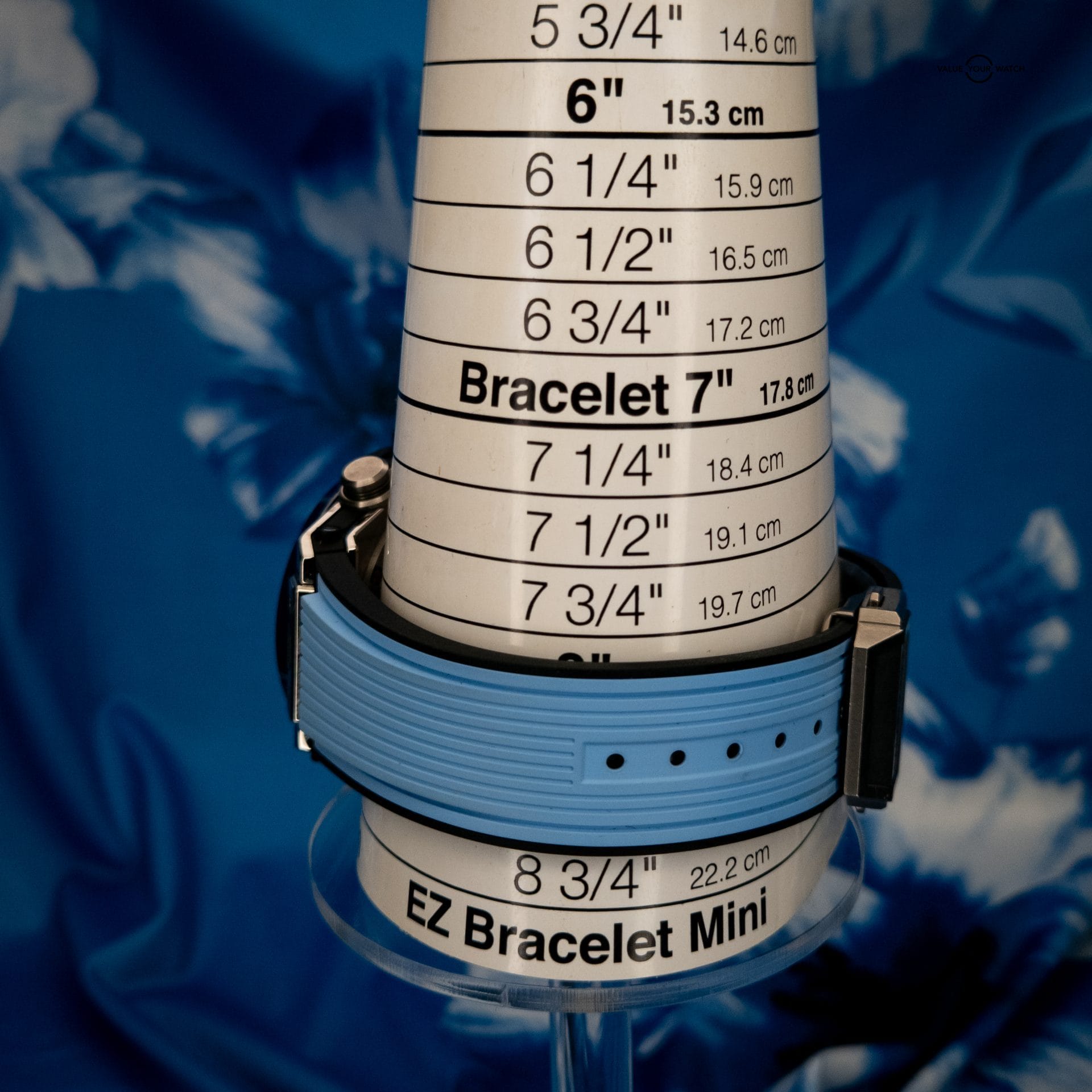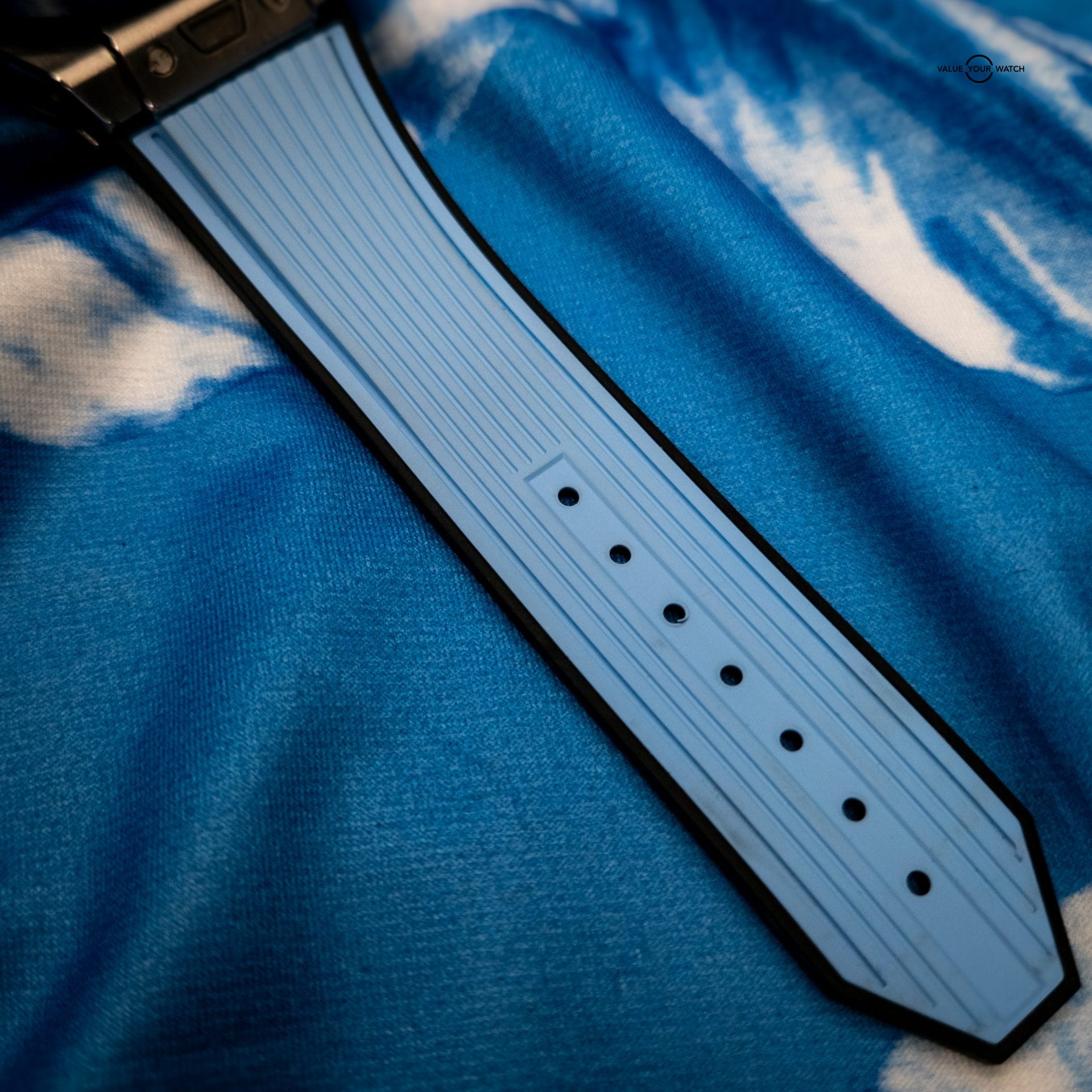 - Strap: Blue structured rubber strap with titanium & ceramic deployant clasp