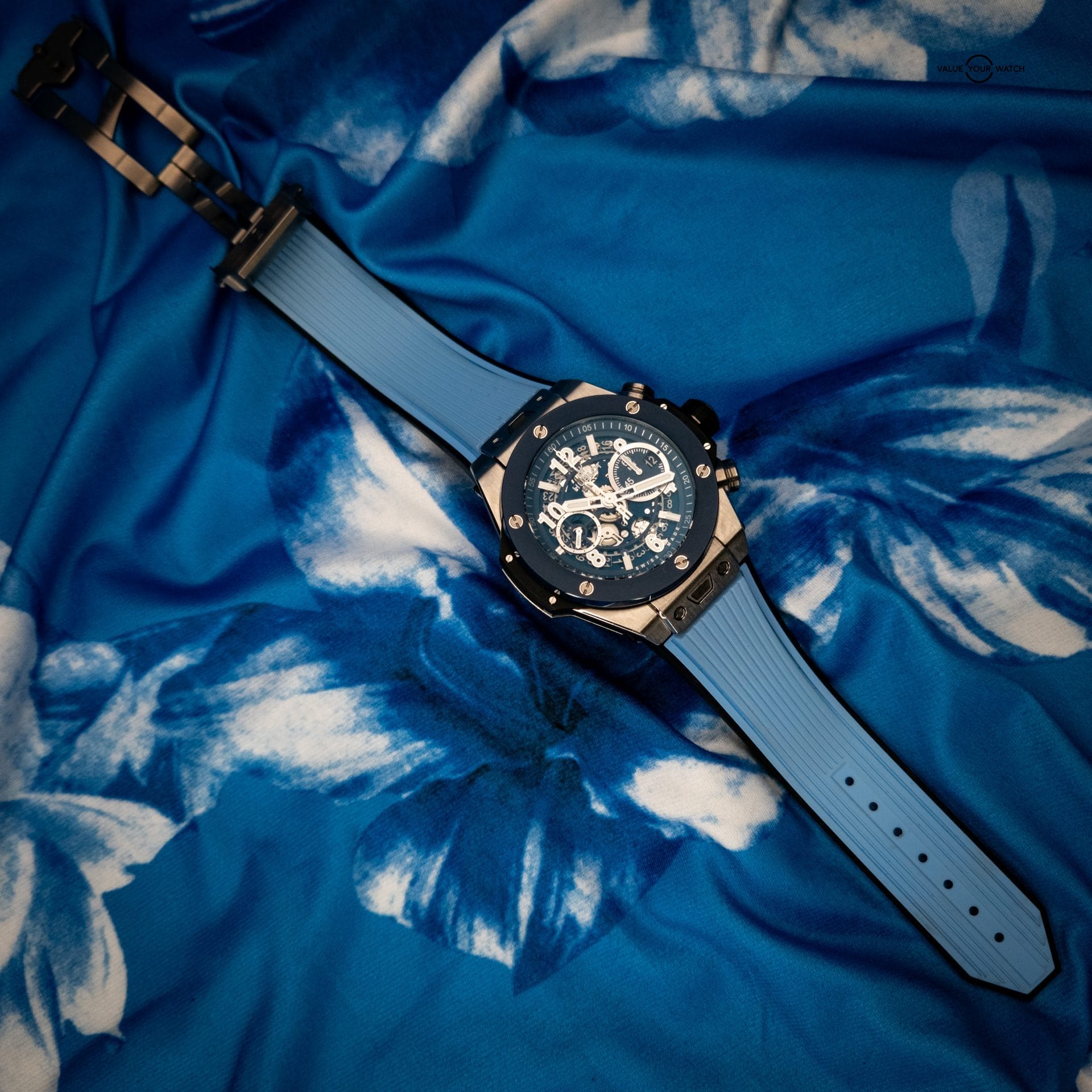 - Dial: Skeletonized with blue accents and chronograph subdials