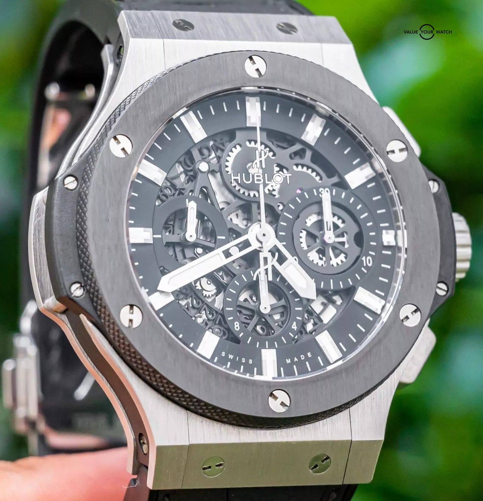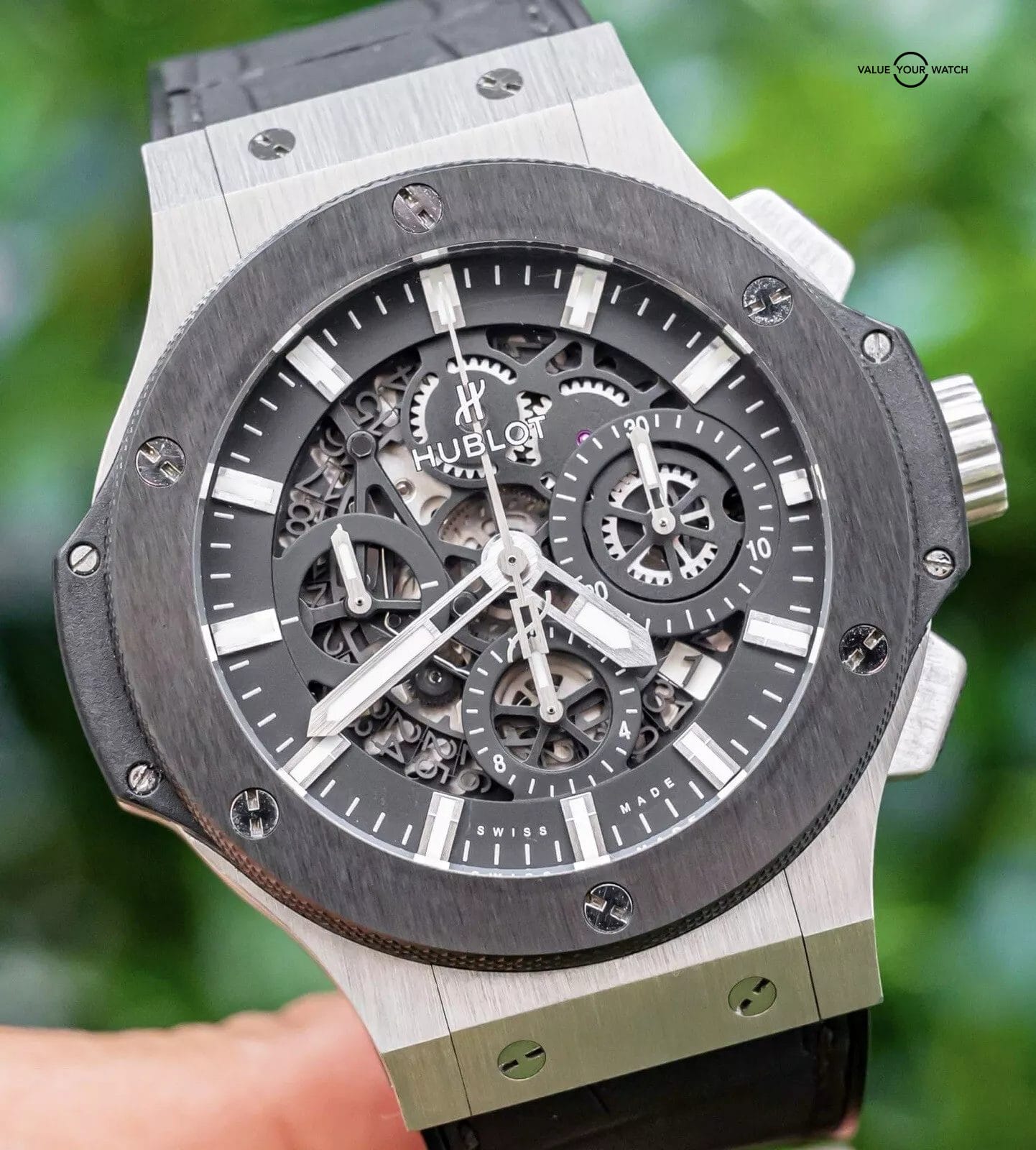 STRIKING Hublot Aero Bang 44 Ceramic Steel with Skeleton Dial on Black Hublot Alligator Strap! Comes with the original Hublot boxes and papers including the international warranty card. Originally purchased from a Hublot Authorized Dealer in November 2016! This is the most desirable Aero Bang spec, Ceramic Bezel & Stainless Steel Case. The strap is amazingly comfortable on wrist. Stunning, comfortable, and clean!