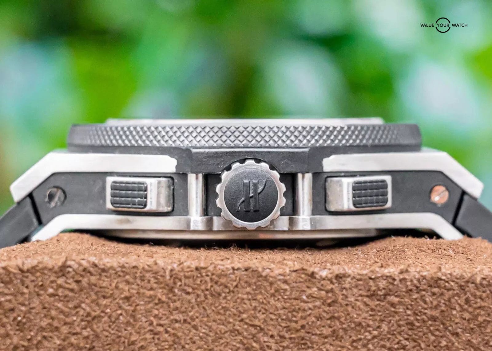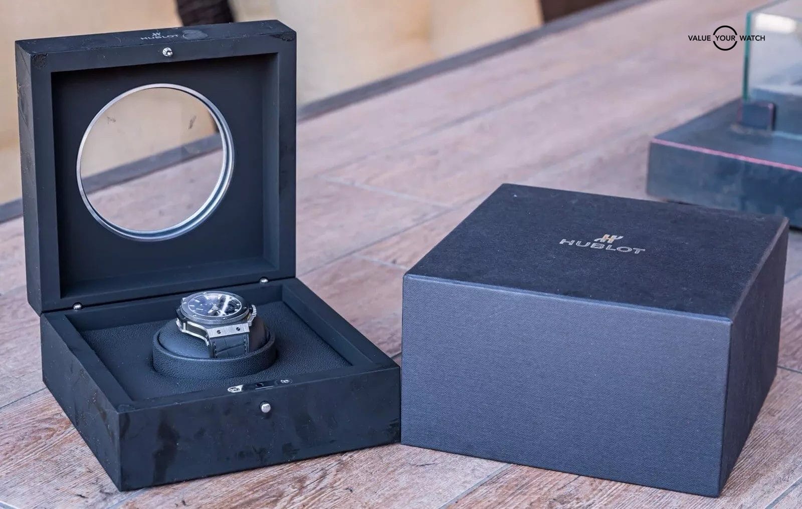 The watch is incredibly clean overall with only very minor wear, nothing notable. Keeping good time on my timegrapher when tested! Do excuse all the dust/lint in the pictures as all of our watches are photographed outdoors in natural lighting/conditions. The boxes do have typical Hublot box wear as pictured, a result of the materials used in their design/production. Desirable Hublot ready to be on your wrist!